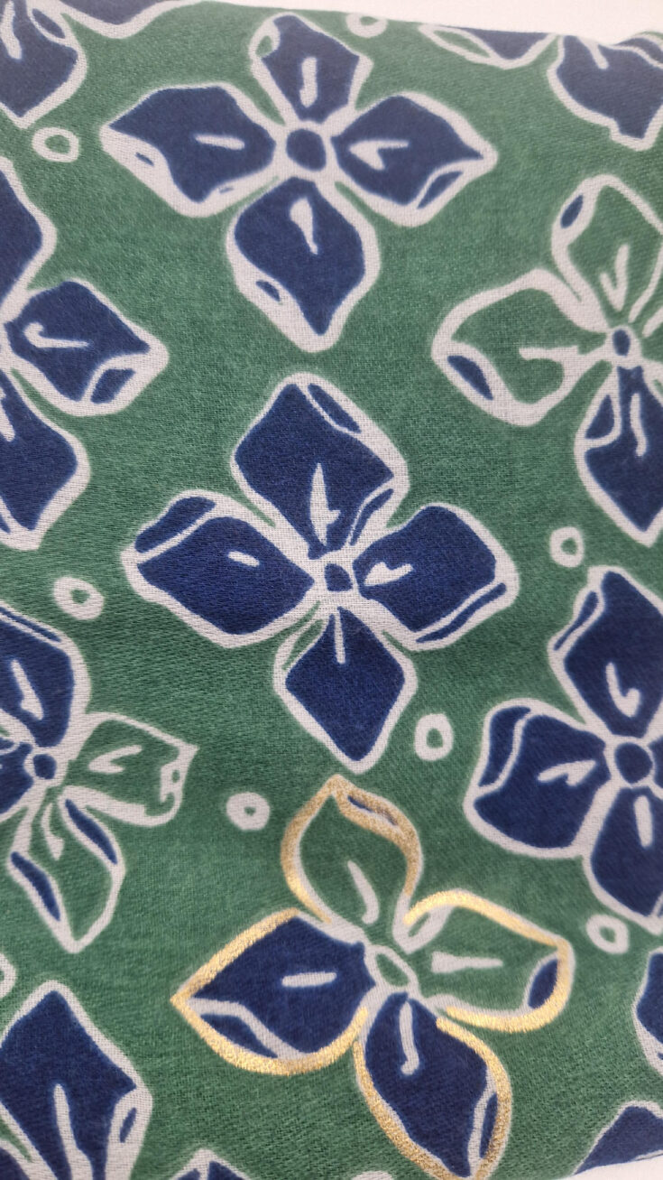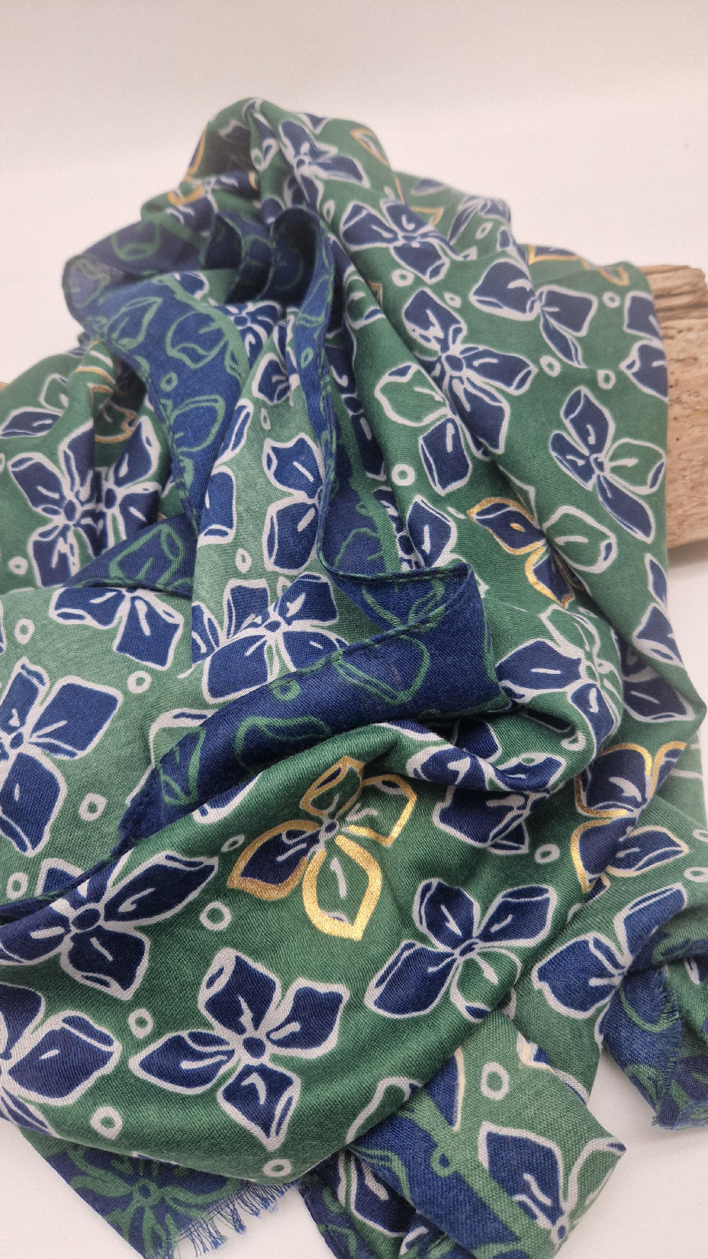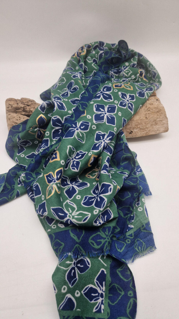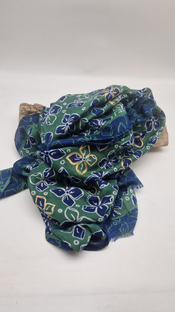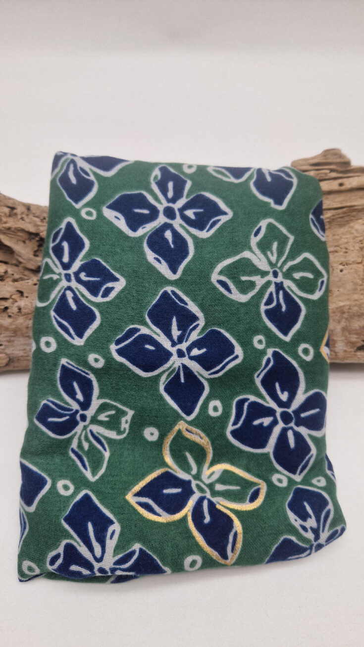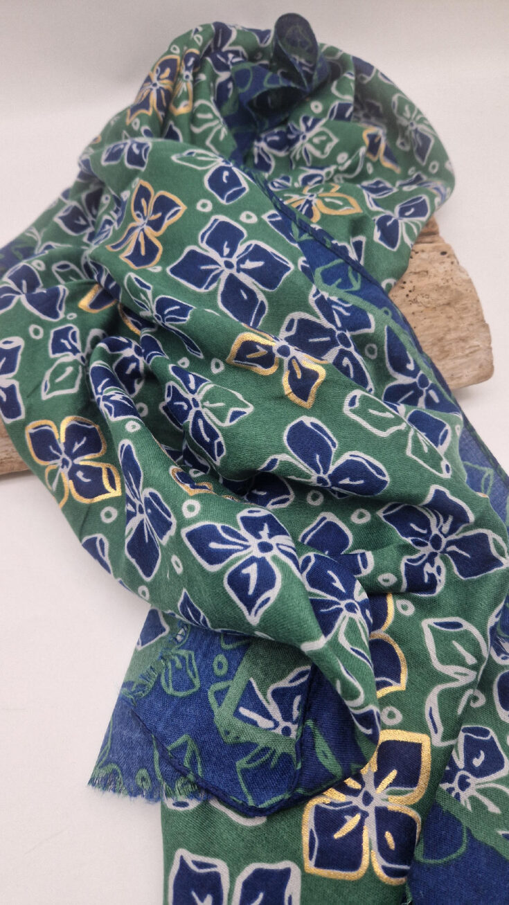 Duży, bardzo miękki, zielono-granatowy elegancki szal we wzory ze złotymi elementami. Szalik jest grubszy ciut, taki idealny do katany, czy otulaka . Świetnie zestawione kolory, energetyczne i eleganckie zarazem, z lekkim, takim jedwabistym połyskiem.