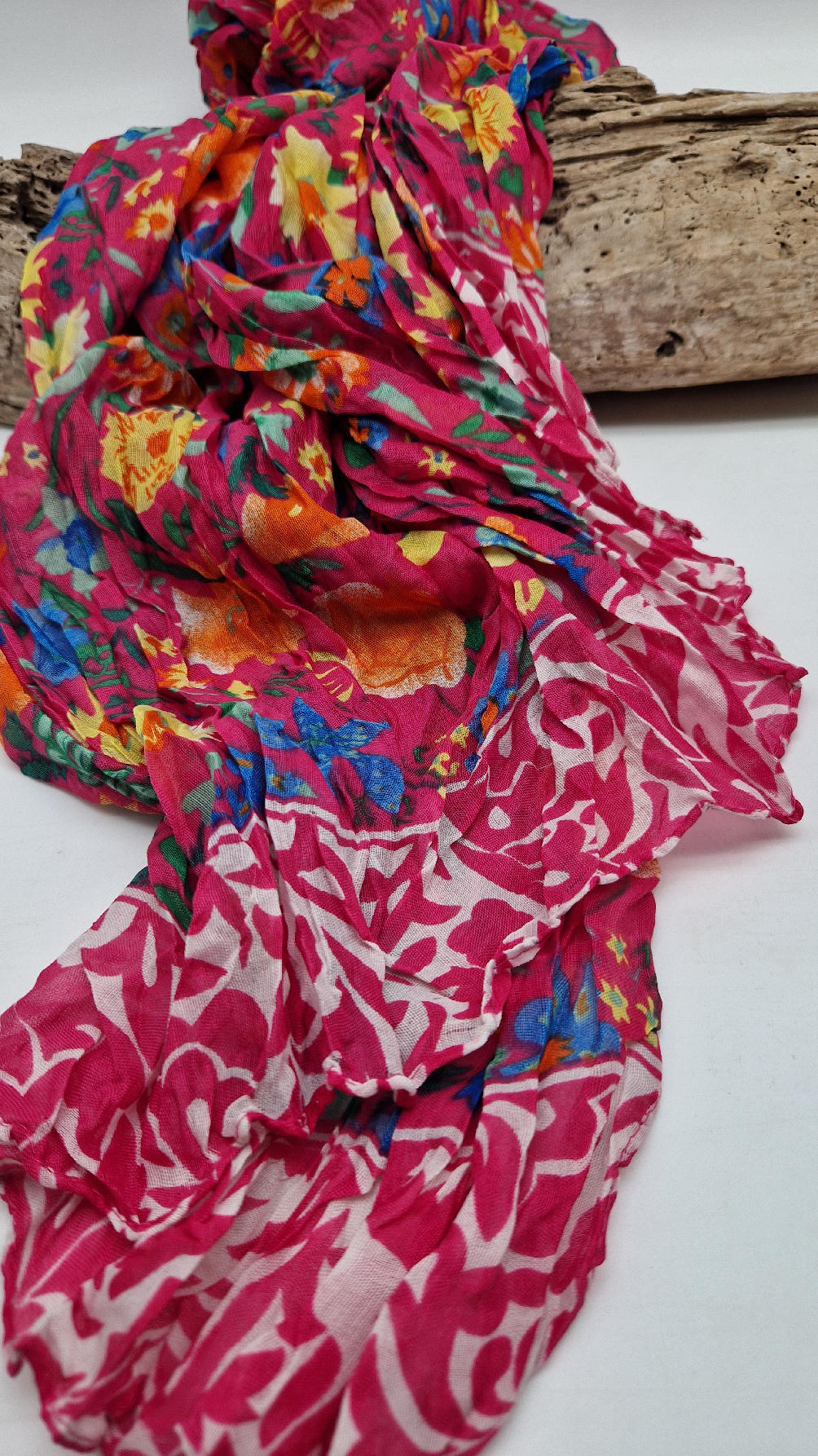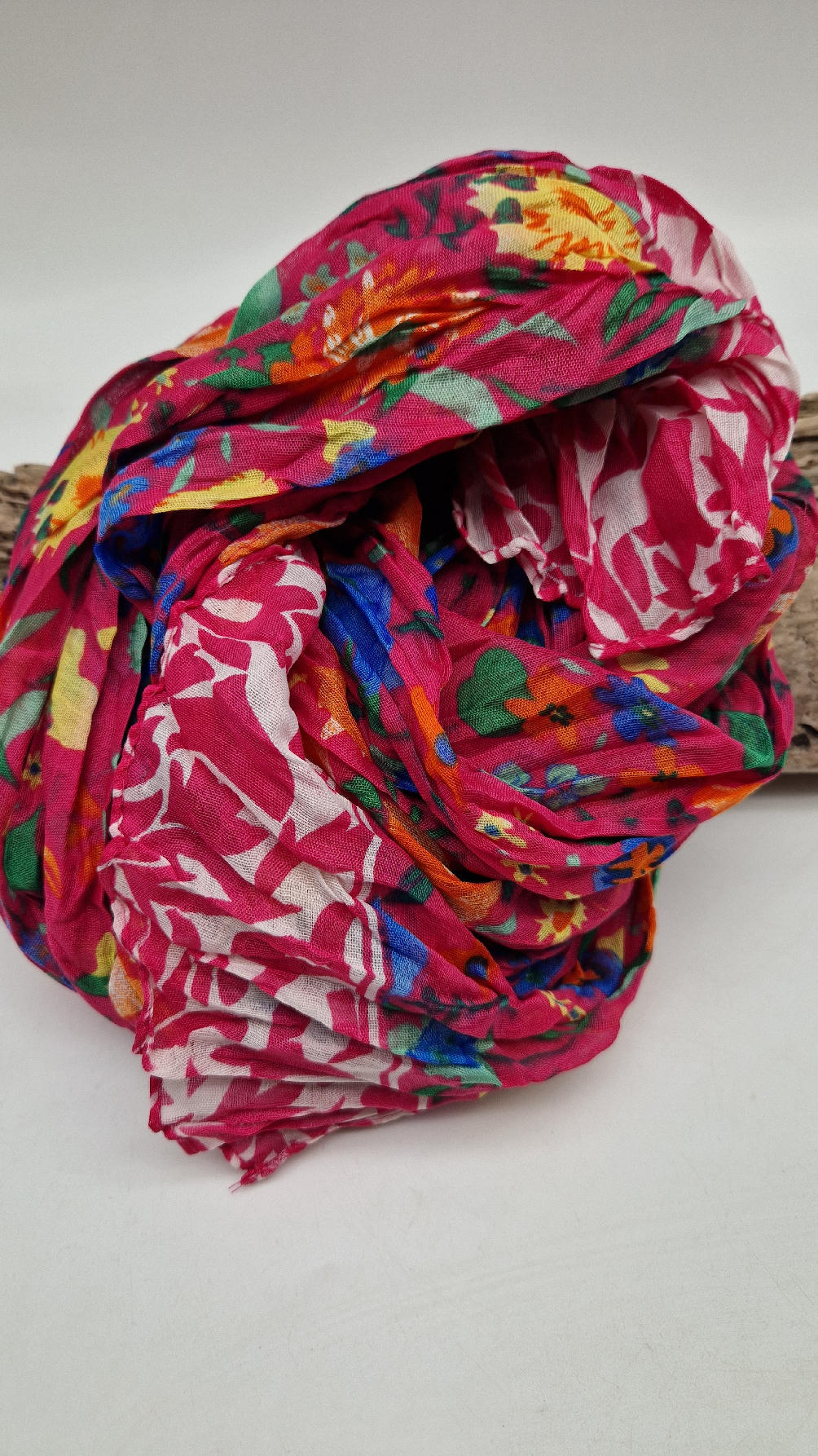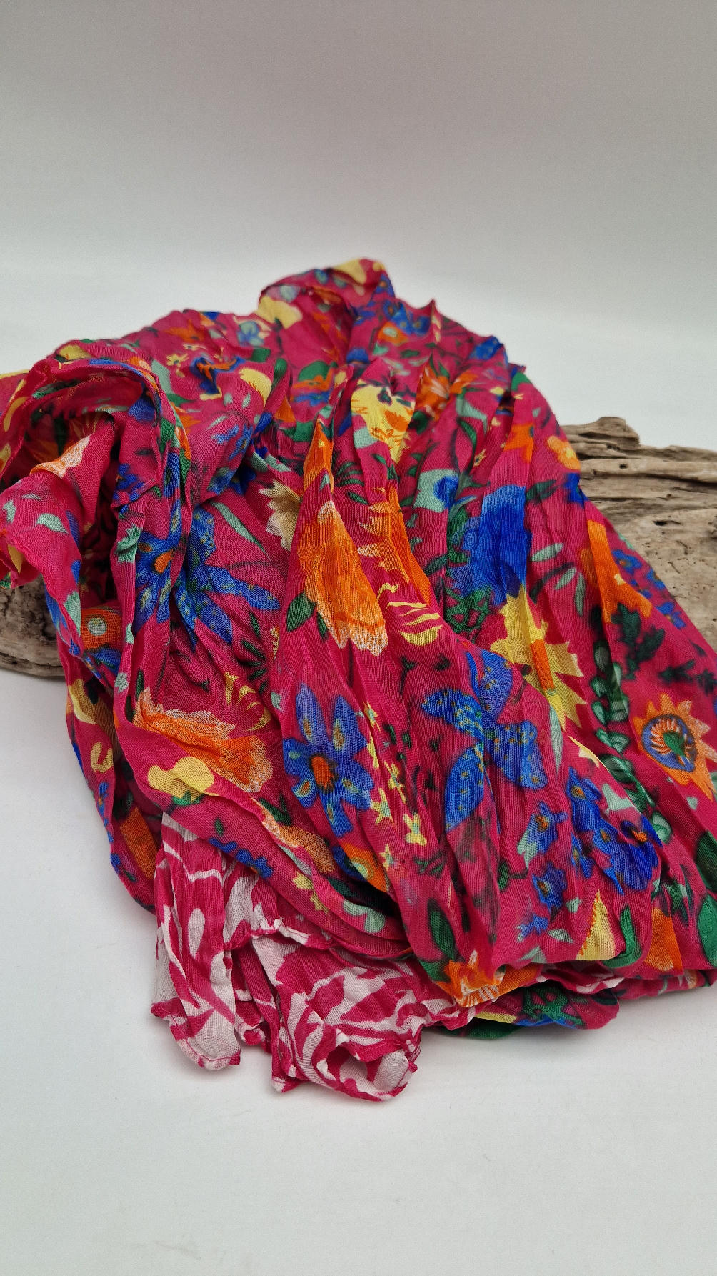 Duży, bardzo miękki, ,,pognieciony” szal w kolorowe kwiaty. Ciemnoróżowy, a kwiaty są tak kolorowe, że na pewno uda Ci się dopasować do nich resztę ubrania:)