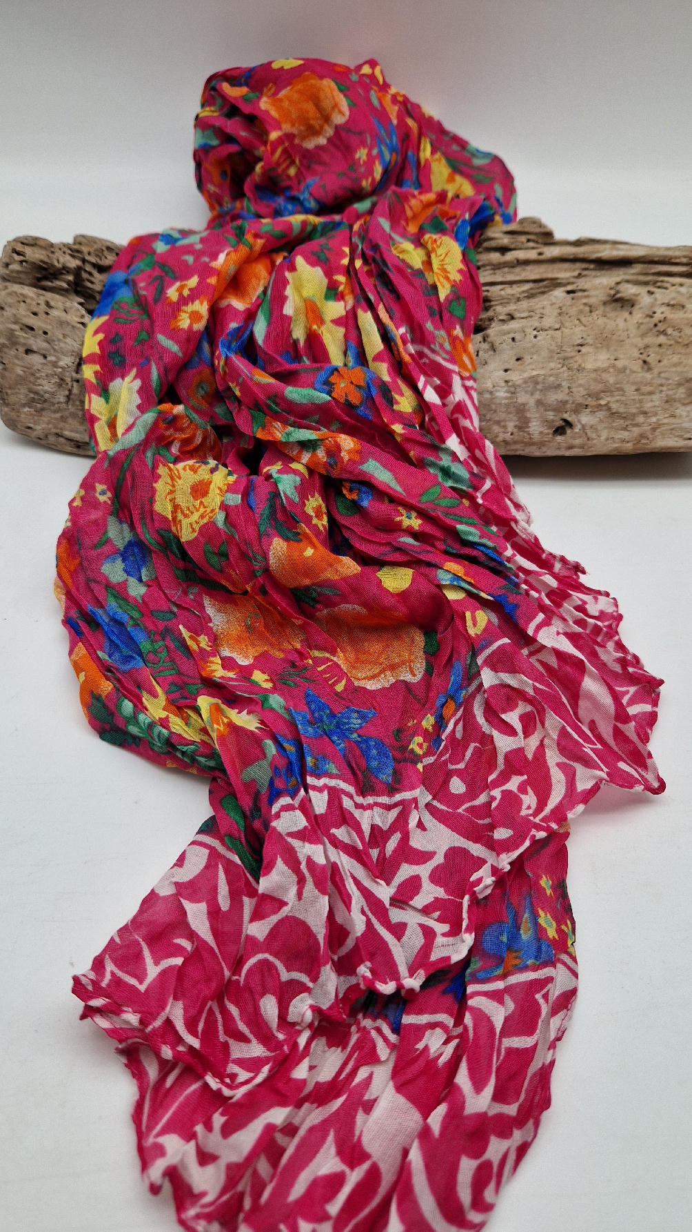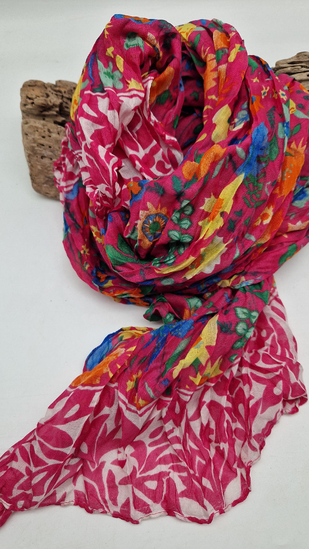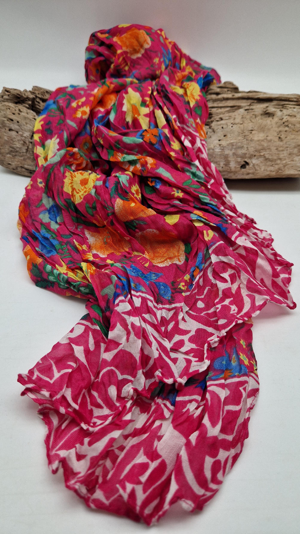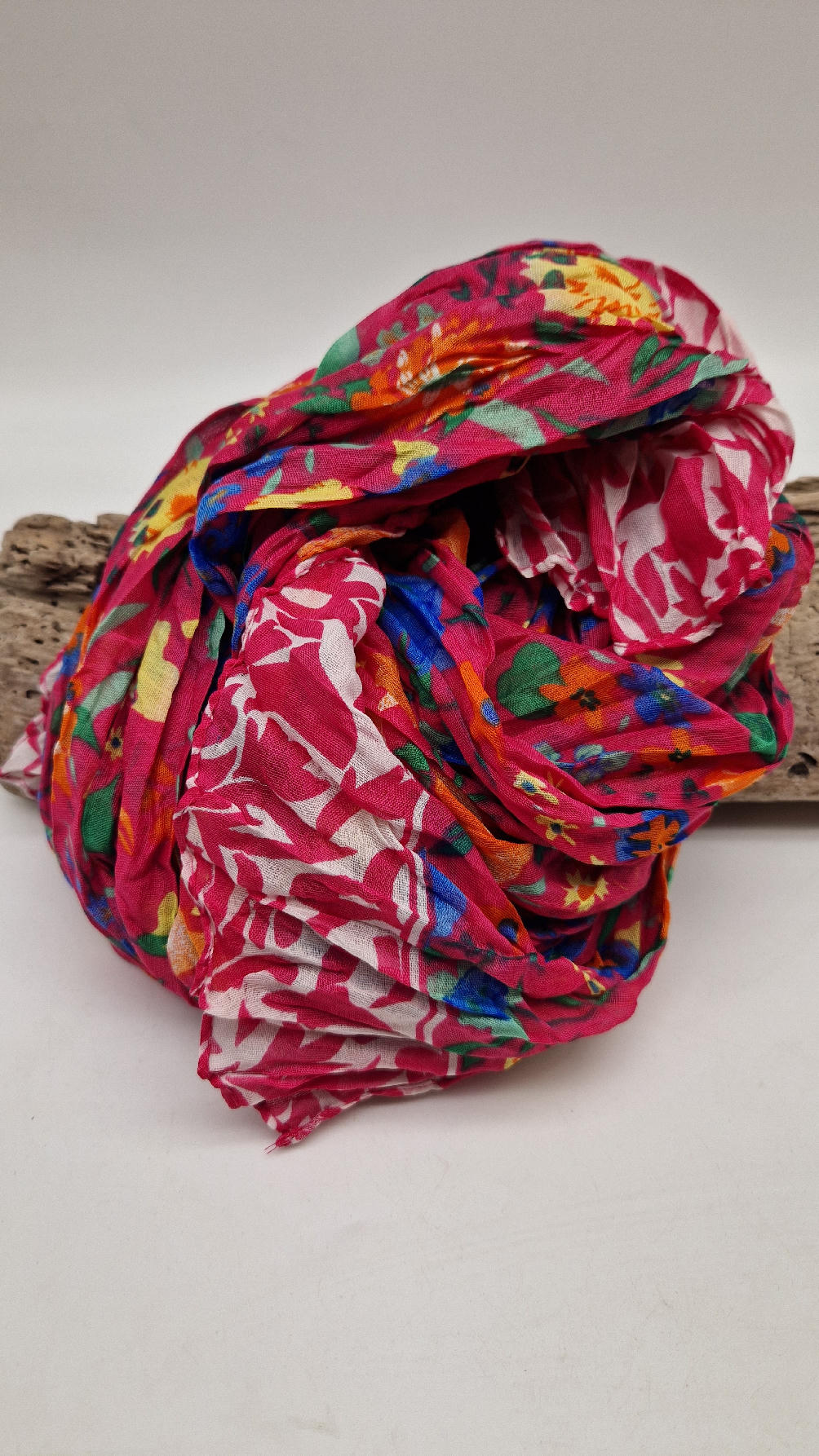 Duży, bardzo miękki, ,,pognieciony” szal w kolorowe kwiaty. Ciemnoróżowy, a kwiaty są tak kolorowe, że na pewno uda Ci się dopasować do nich resztę ubrania:)