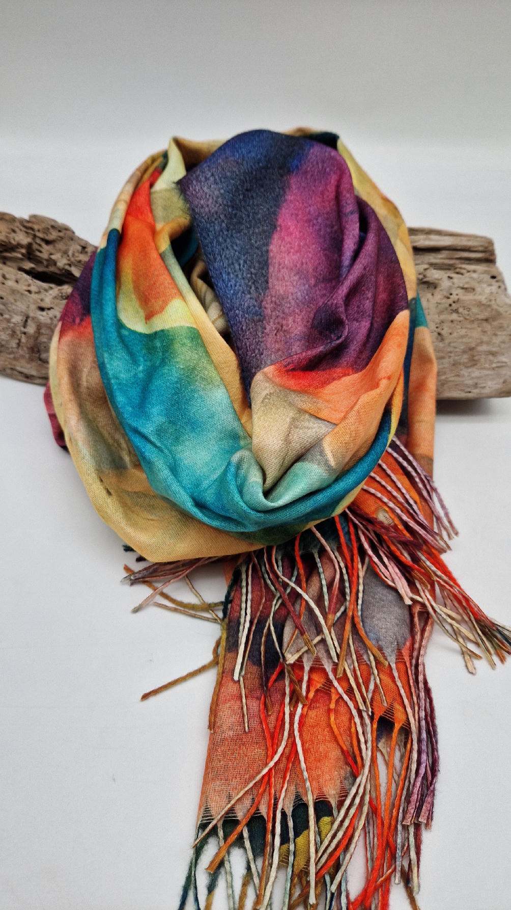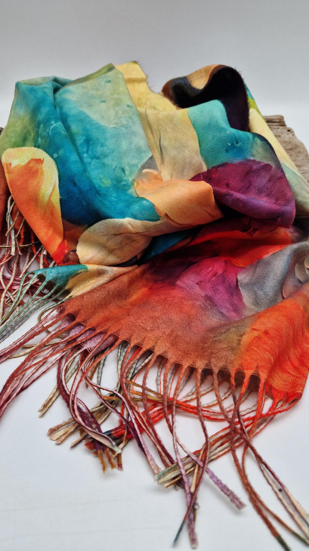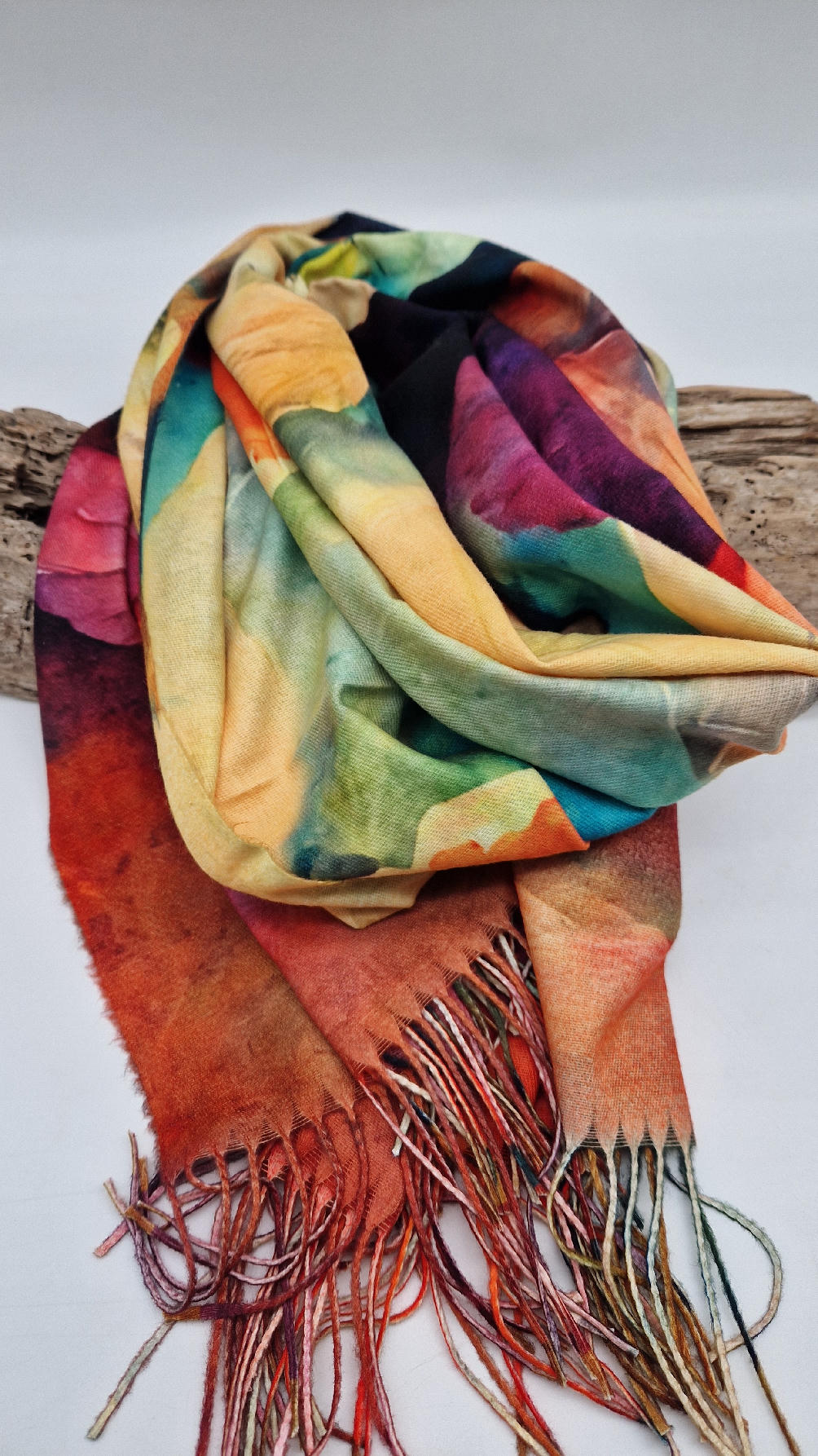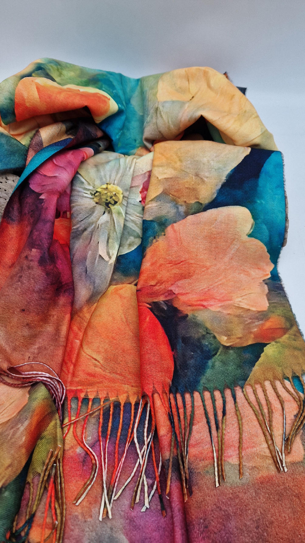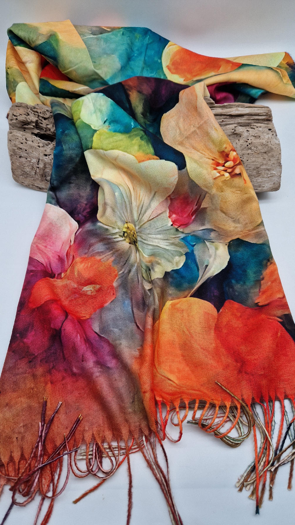 Duży, bardzo miękki, kaszmirowy, megakolorowy, piękny i elegancki szal w kwiaty . Szalik jest super miękki, niegryzący, nie taki bardzo gruby..taki idealny . Świetnie zestawione kolory, energetyczne i eleganckie zarazem.