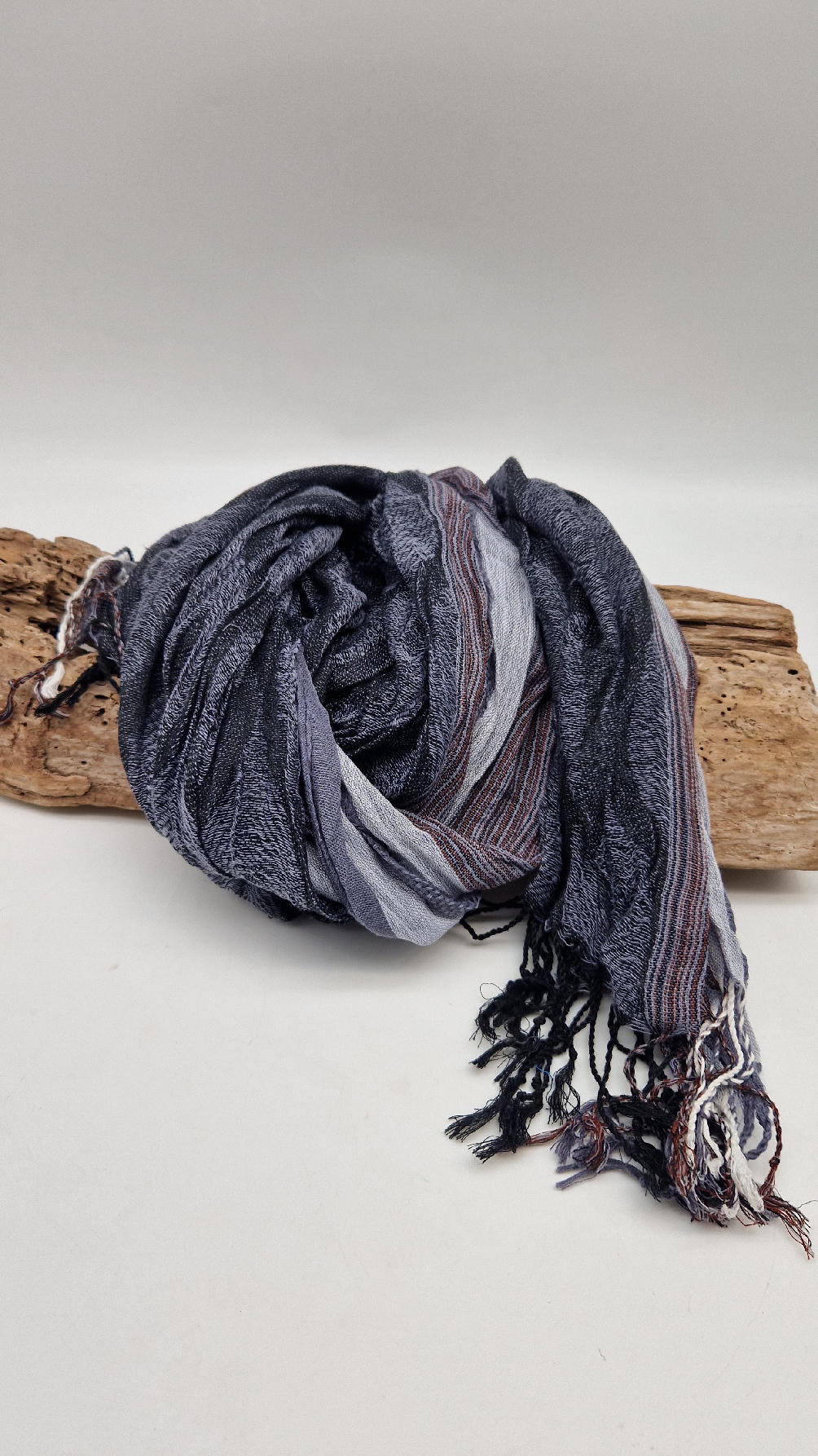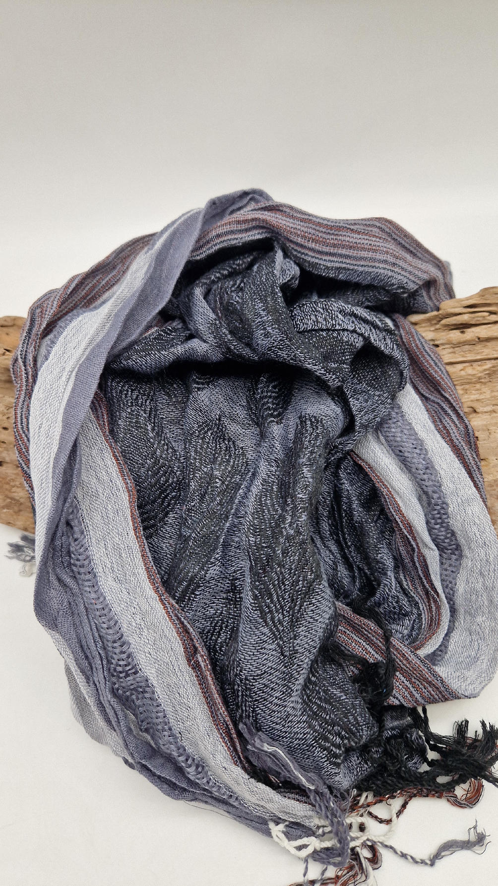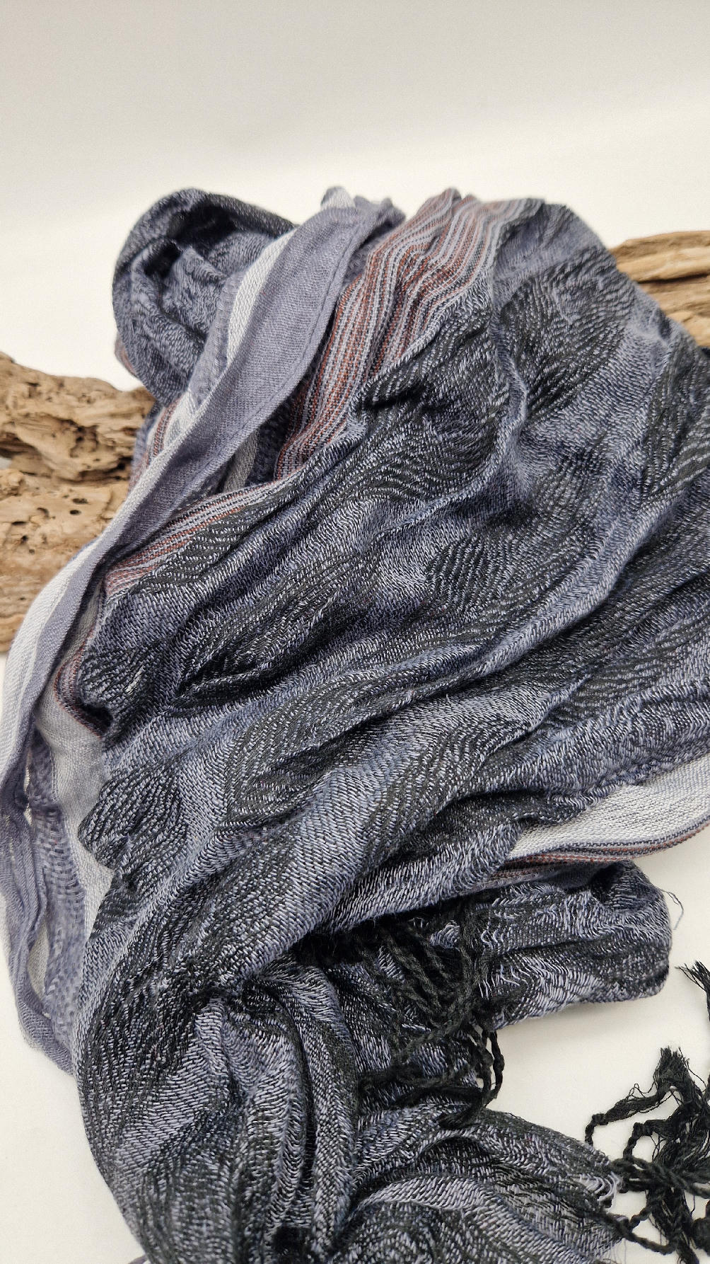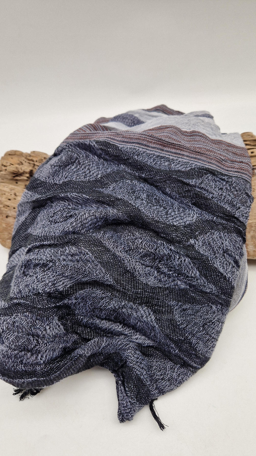 Duży, bardzo miękki, grafitowo-błękitno-beżowo-biały, a właściwie kremowy ,,pognieciony” szal paski . Szal na pewno świetnie otuli Twoją szyję, będzie również świetnym dodatkiem do sukienek, katan, czy Otulaków…Myślę, że będzie też świetny dla Twojej drugiej połówki, lub w prezencie..