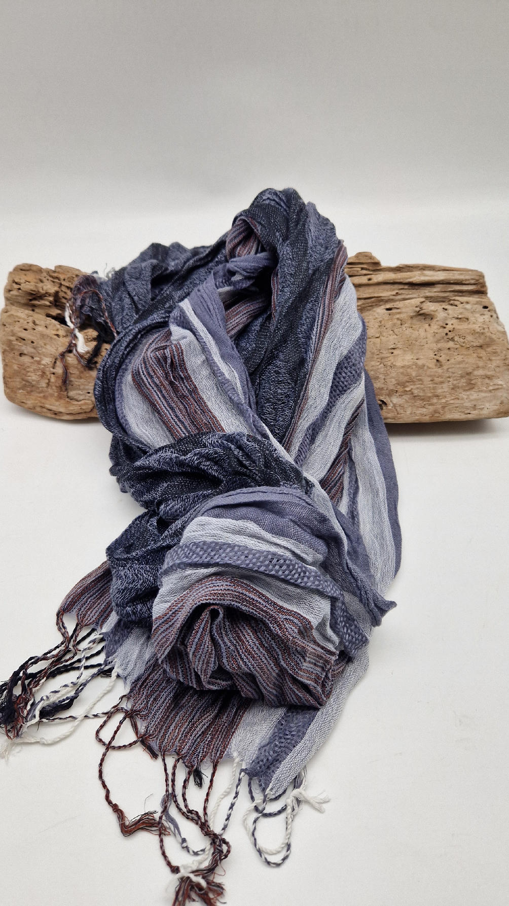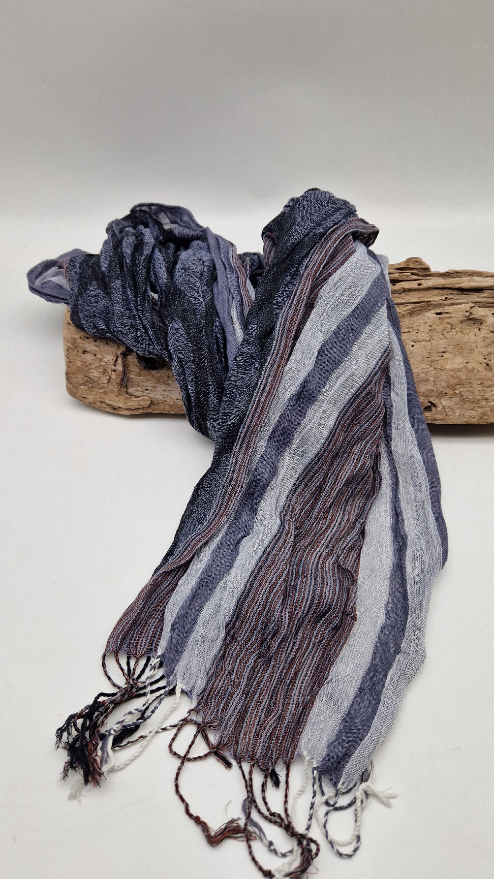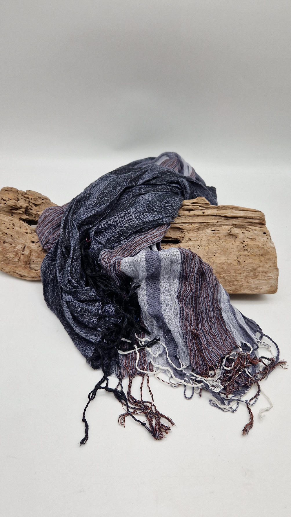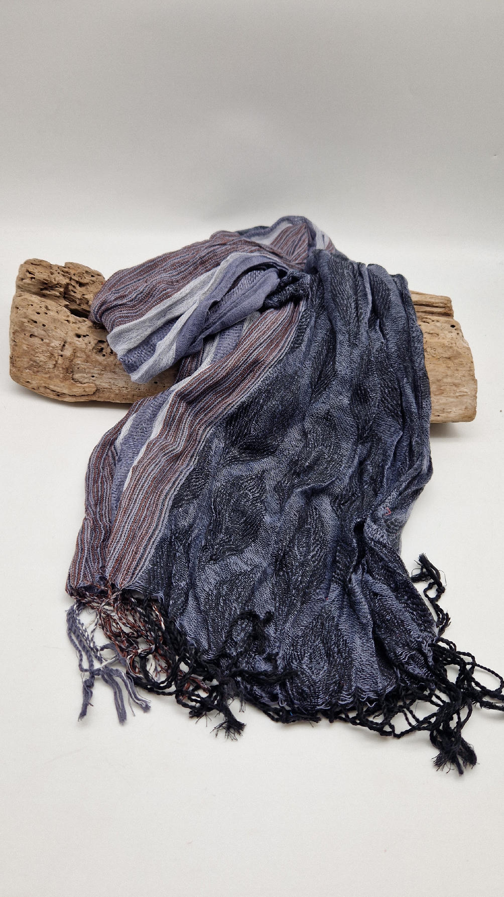 Duży, bardzo miękki, grafitowo-błękitno-beżowo-biały, a właściwie kremowy ,,pognieciony” szal paski . Szal na pewno świetnie otuli Twoją szyję, będzie również świetnym dodatkiem do sukienek, katan, czy Otulaków…Myślę, że będzie też świetny dla Twojej drugiej połówki, lub w prezencie..