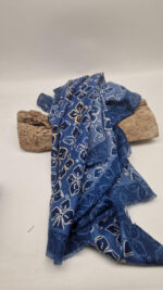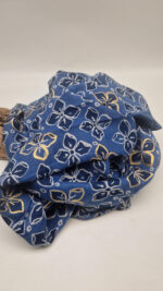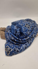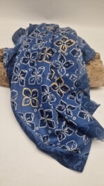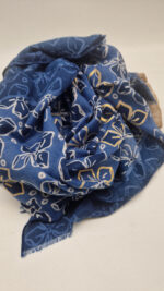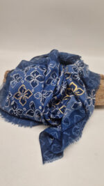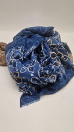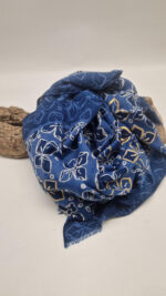 Duży, bardzo miękki, niebiesko-granatowy elegancki szal we wzory ze złotymi elementami. Szalik jest grubszy ciut, taki idealny do katany, czy otulaka . Świetnie zestawione kolory, energetyczne i eleganckie zarazem, z lekkim, takim jedwabistym połyskiem.