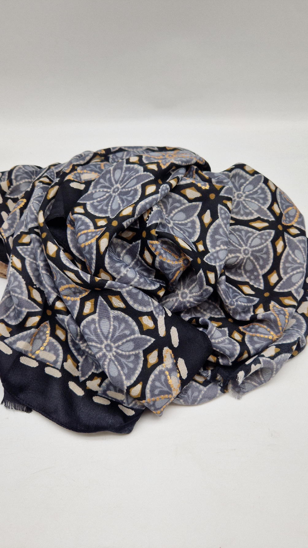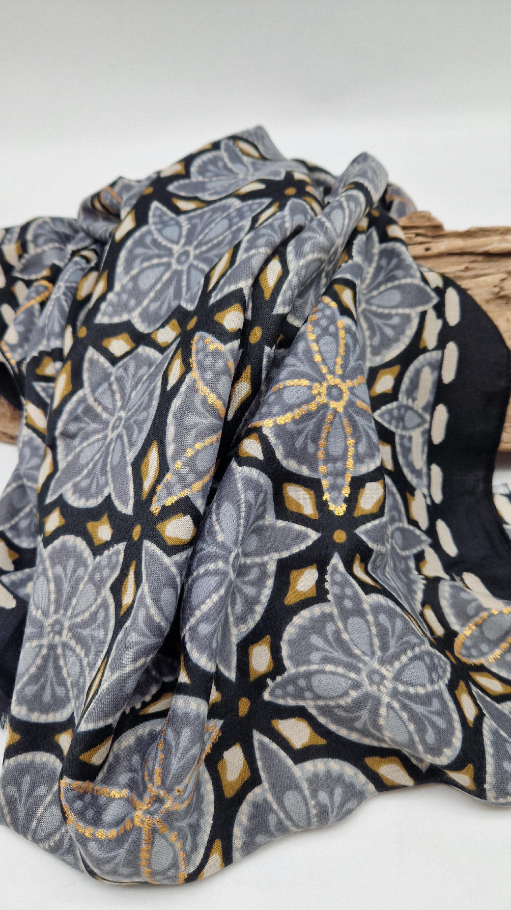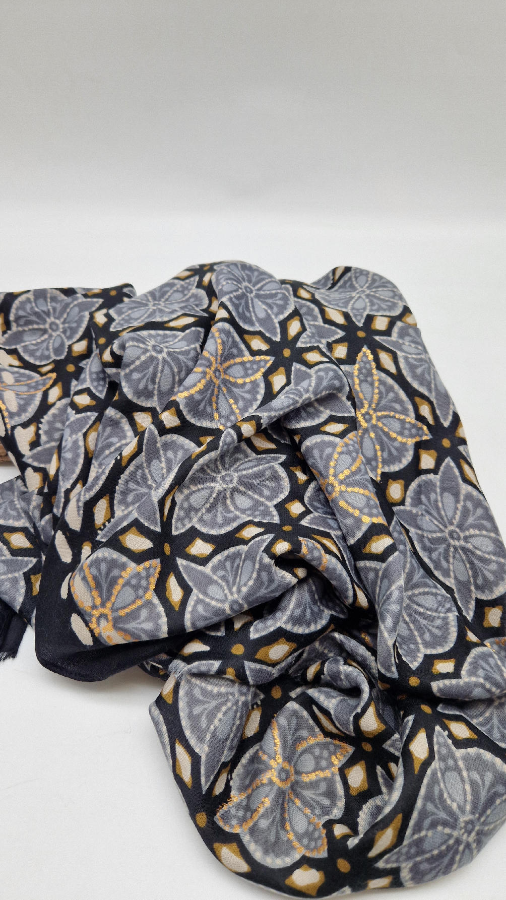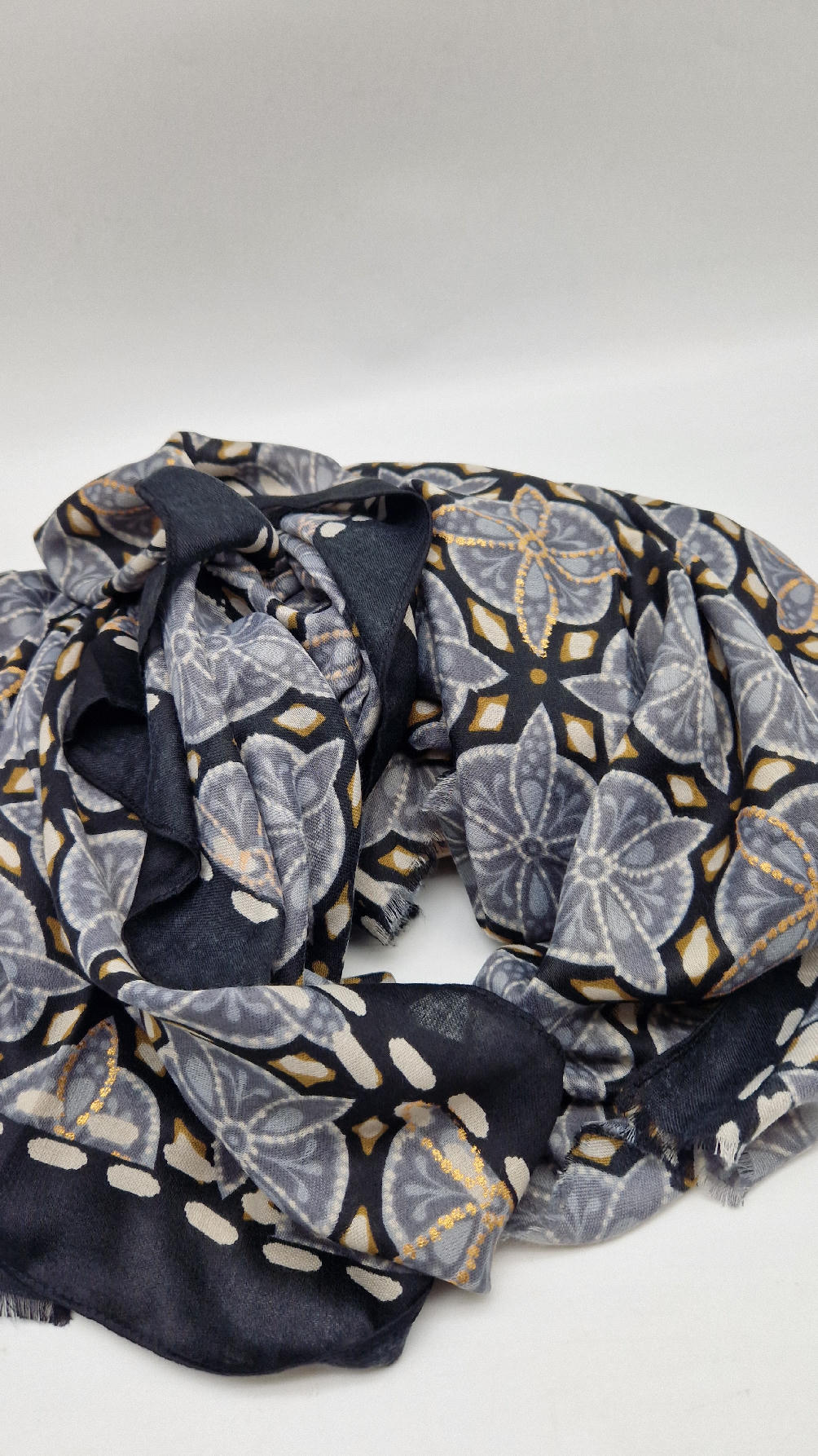 Duży, bardzo miękki, szaro-czarny, elegancki szal we wzory z odrobiną złota. Szalik jest grubszy ciut, taki idealny do katany, czy otulaka . Świetnie zestawione kolory, energetyczne i eleganckie zarazem, z lekkim, takim jedwabistym połyskiem.