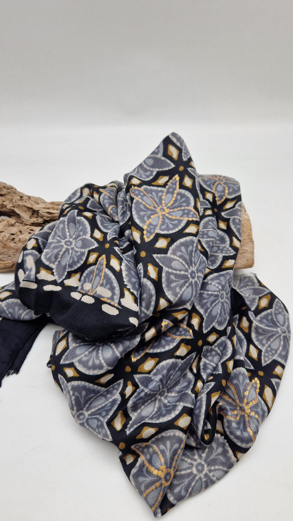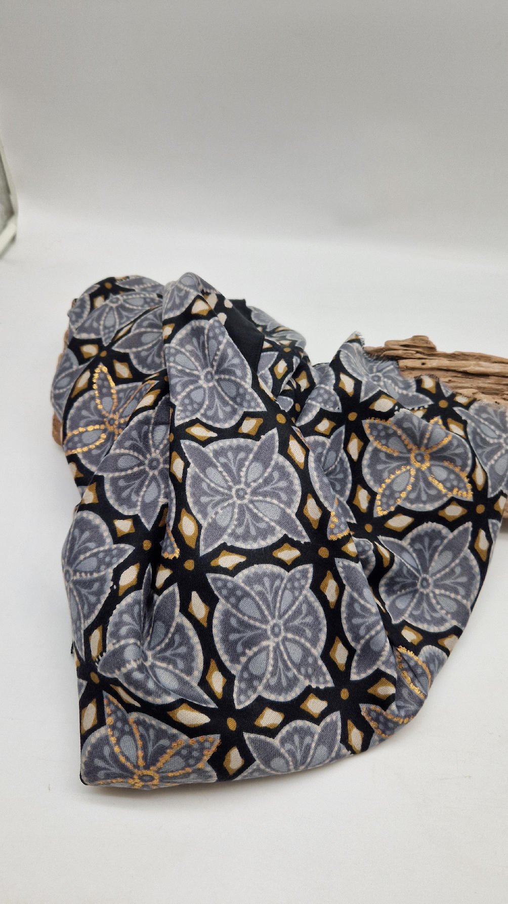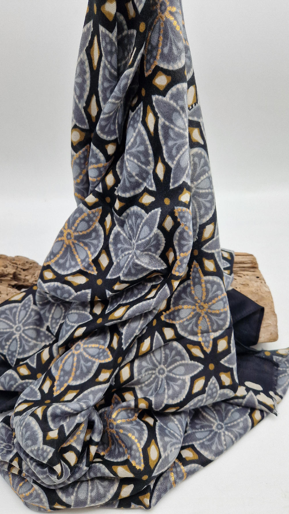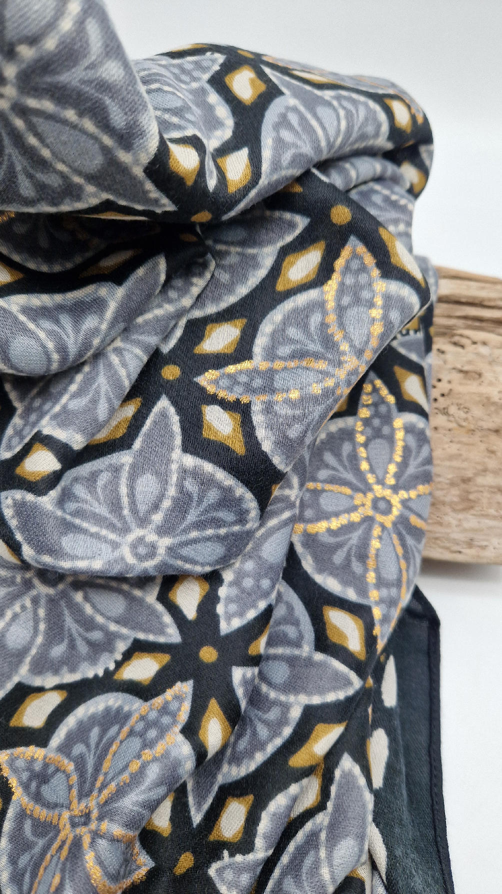 Duży, bardzo miękki, szaro-czarny, elegancki szal we wzory z odrobiną złota. Szalik jest grubszy ciut, taki idealny do katany, czy otulaka . Świetnie zestawione kolory, energetyczne i eleganckie zarazem, z lekkim, takim jedwabistym połyskiem.