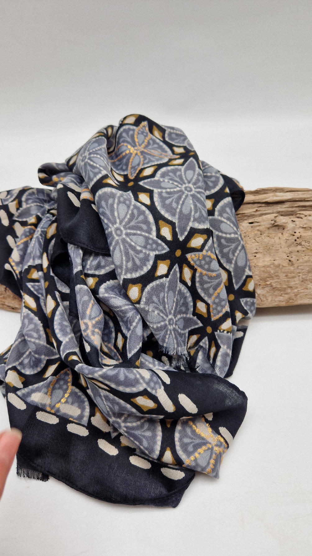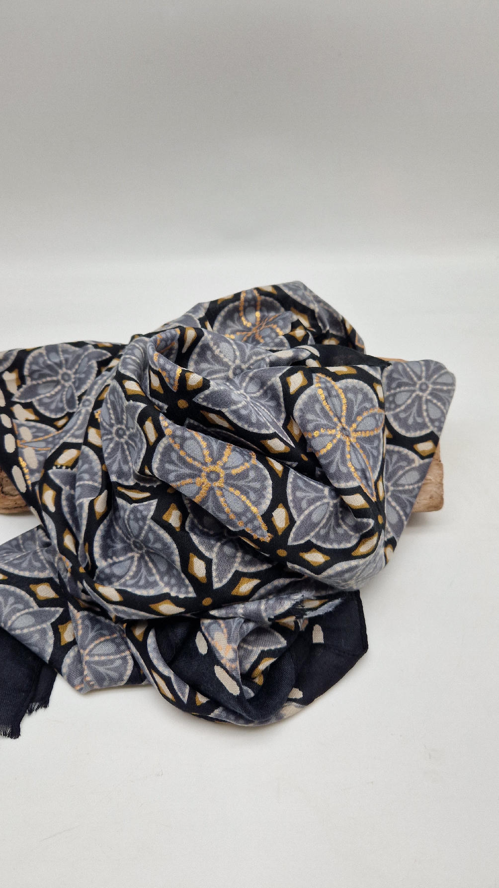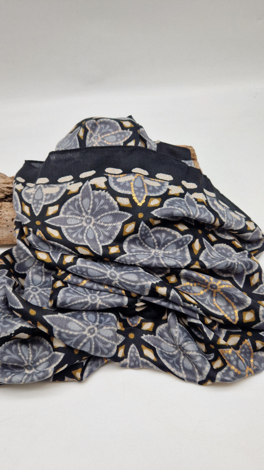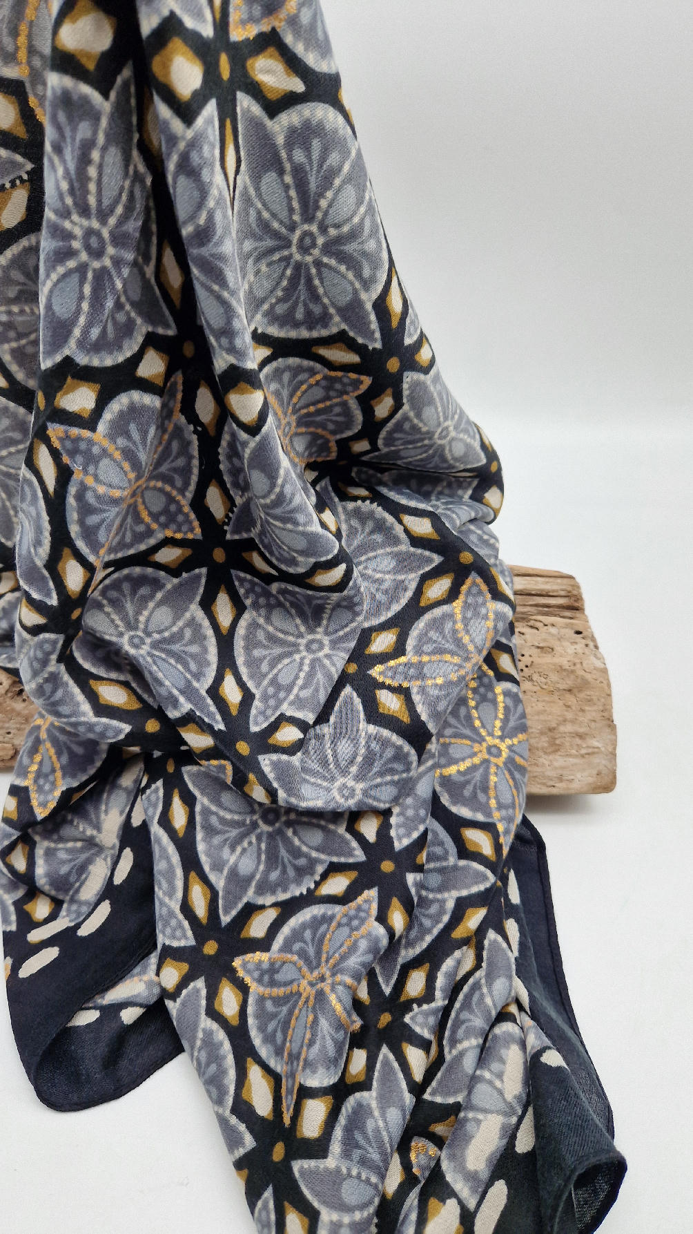 Duży, bardzo miękki, szaro-czarny, elegancki szal we wzory z odrobiną złota. Szalik jest grubszy ciut, taki idealny do katany, czy otulaka . Świetnie zestawione kolory, energetyczne i eleganckie zarazem, z lekkim, takim jedwabistym połyskiem.