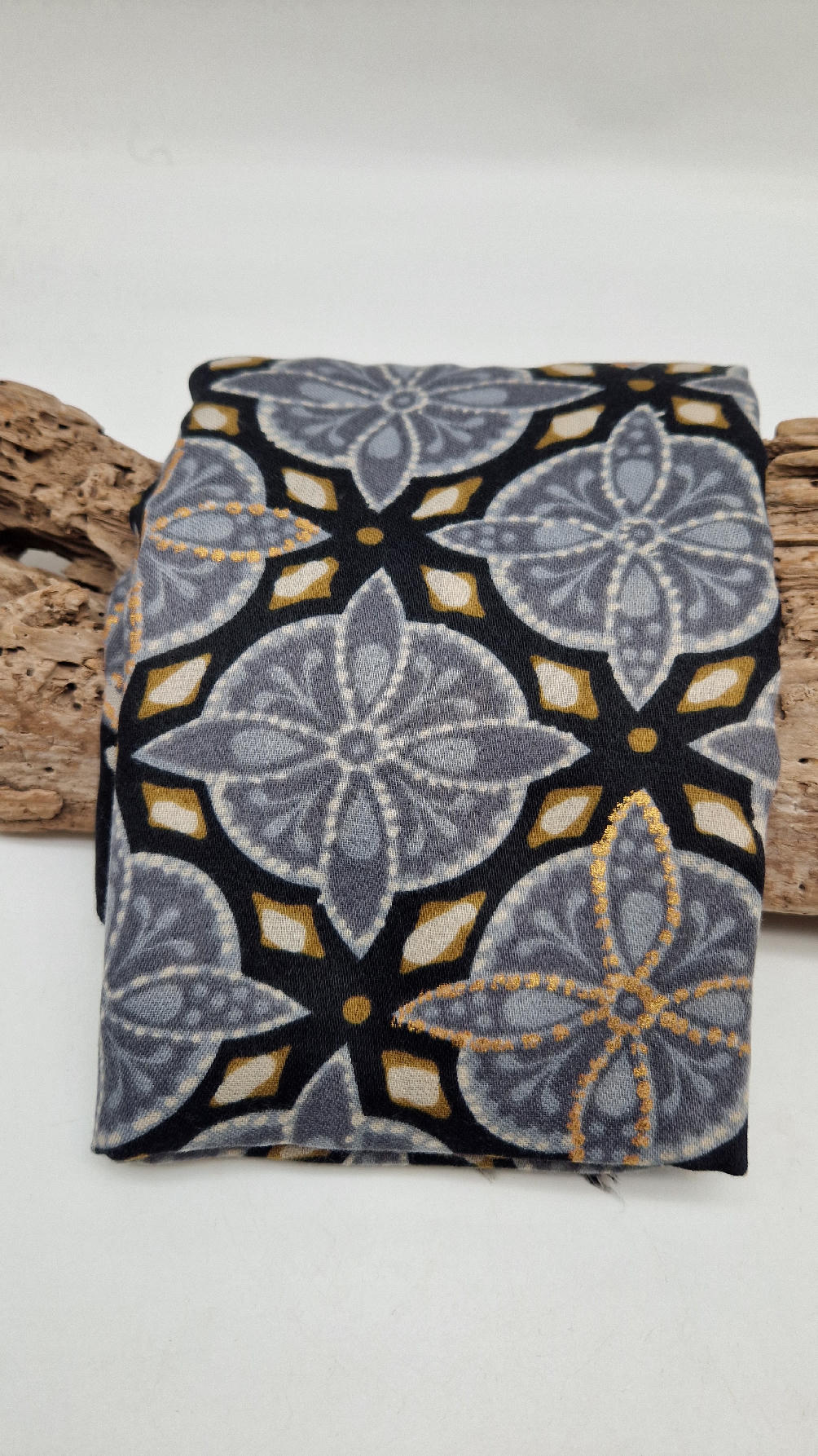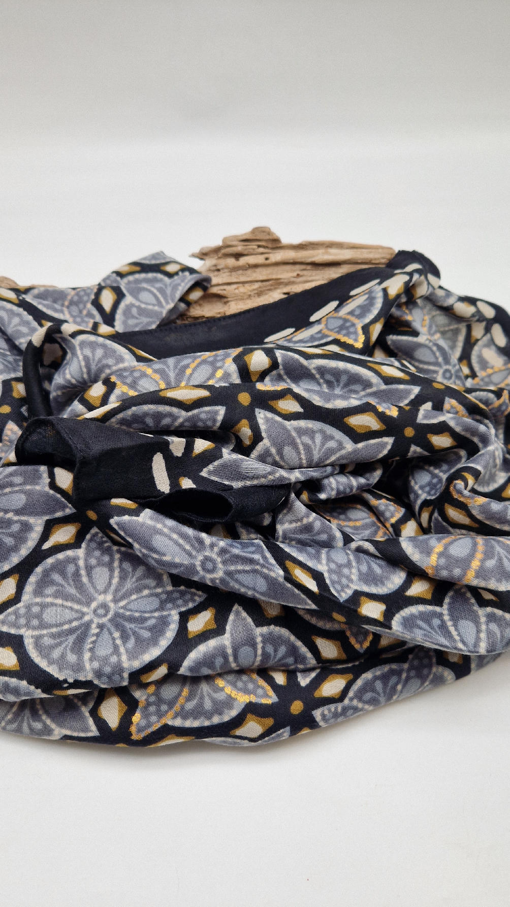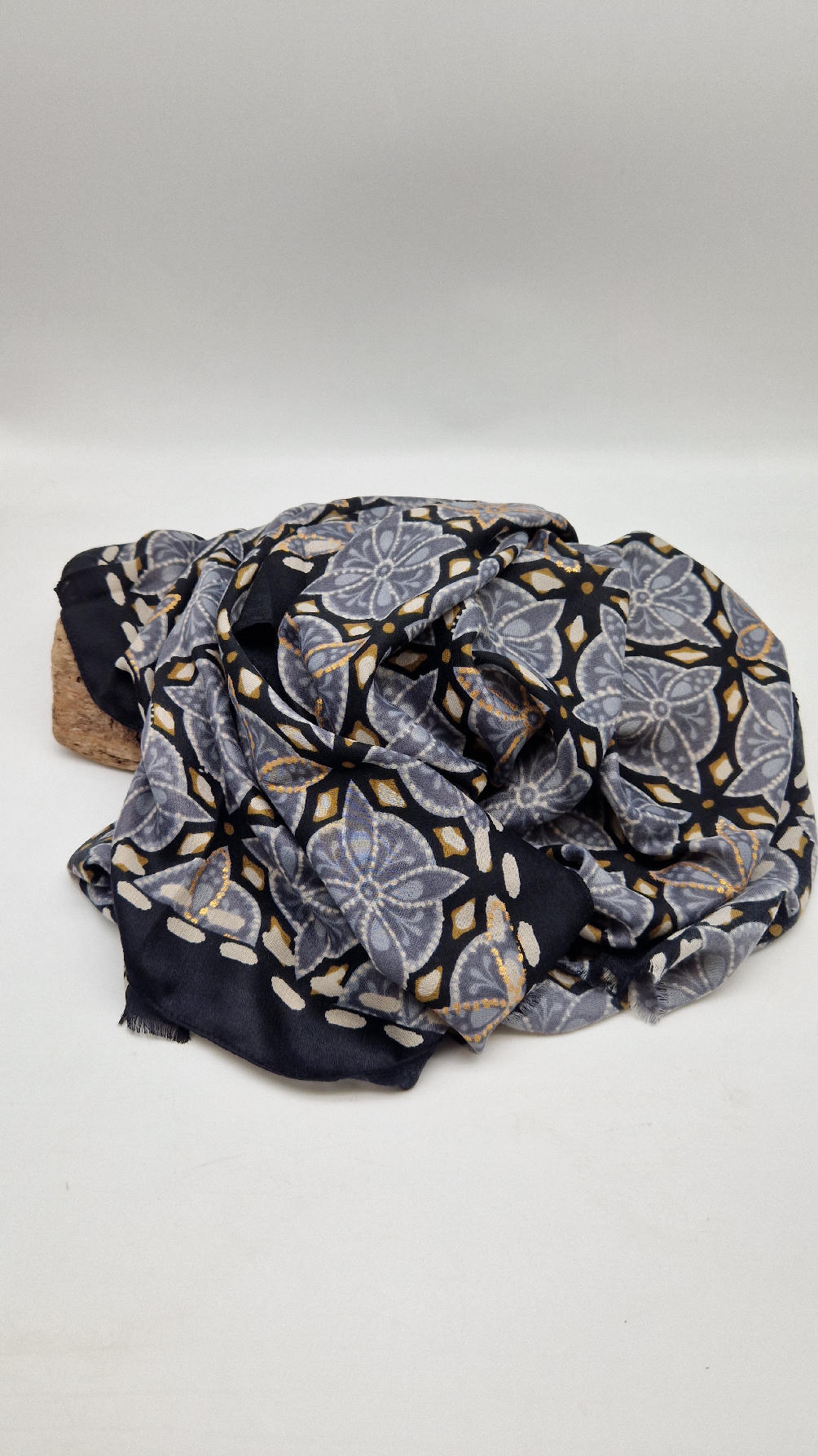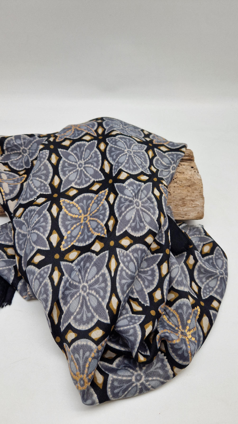 Duży, bardzo miękki, szaro-czarny, elegancki szal we wzory z odrobiną złota. Szalik jest grubszy ciut, taki idealny do katany, czy otulaka . Świetnie zestawione kolory, energetyczne i eleganckie zarazem, z lekkim, takim jedwabistym połyskiem.