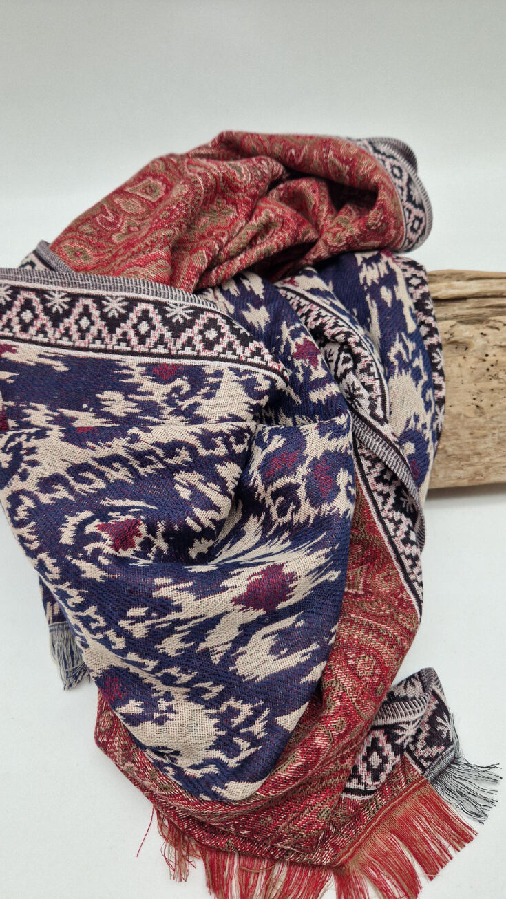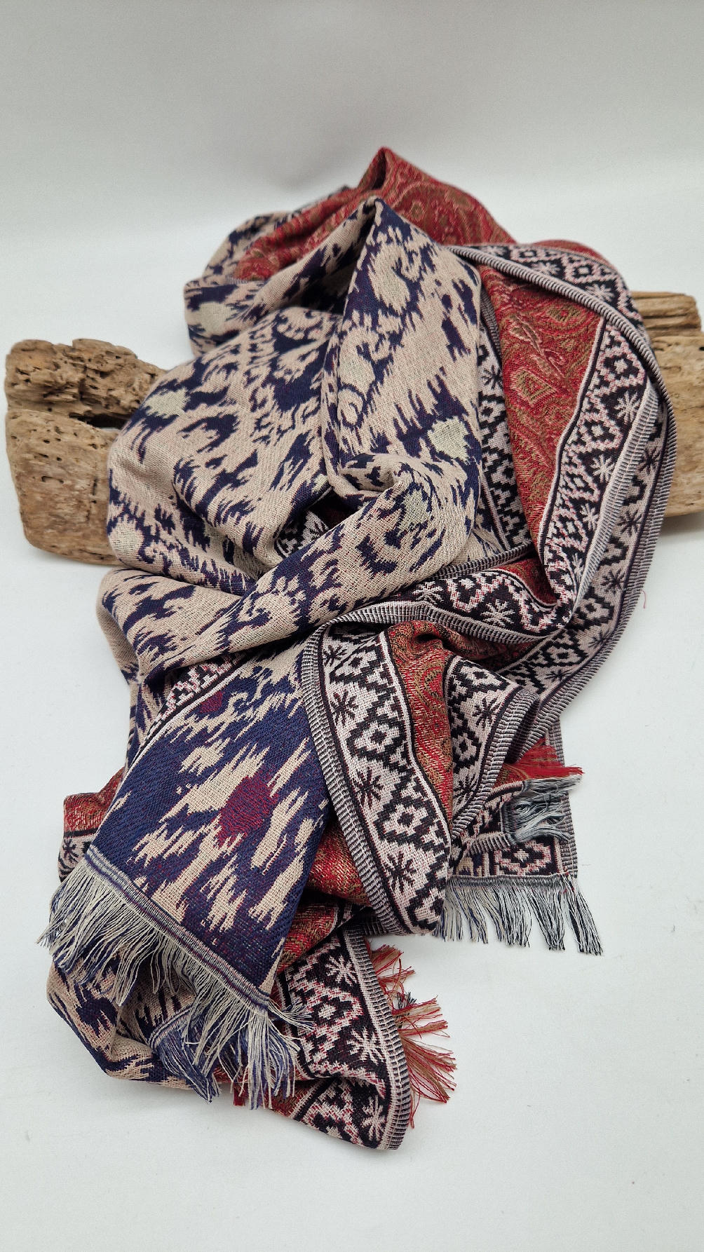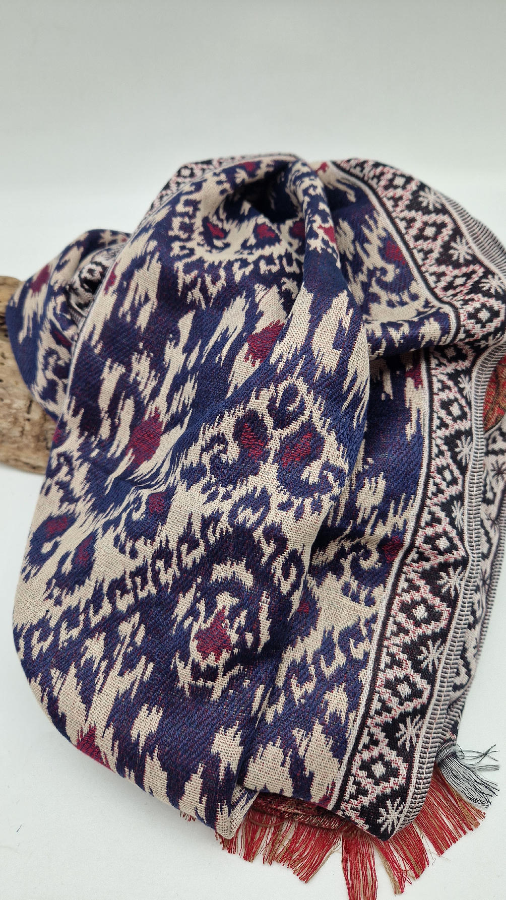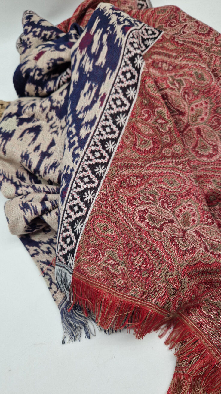Duży miękki, piękny, kolorowy, cudny wręcz, egzotyczny ciut,  piękny szal we wzory , elegancki i ponadczasowy kaszmirowy szal Ciepły, miły i niegryzący.