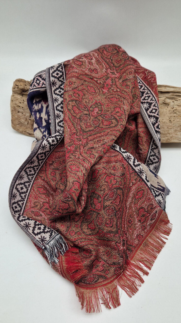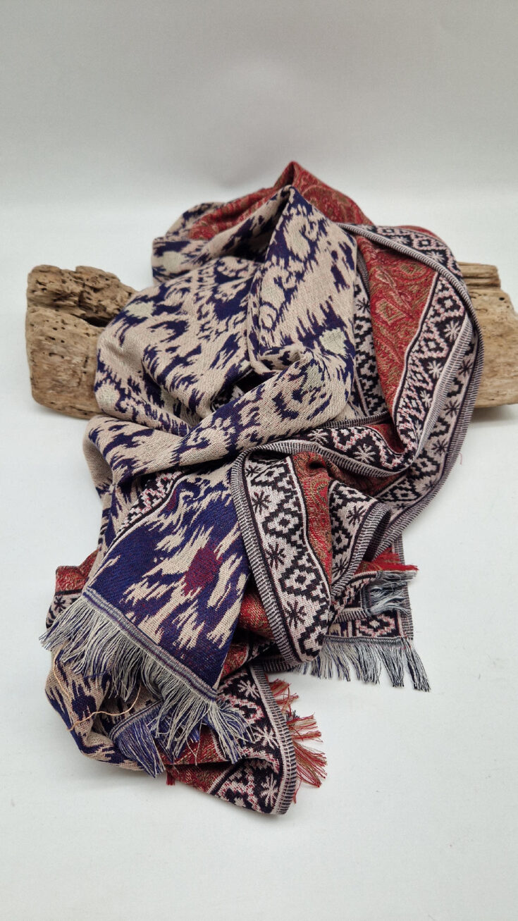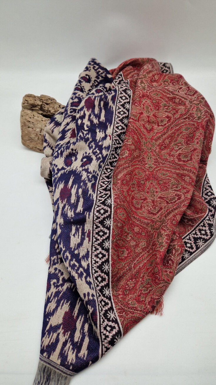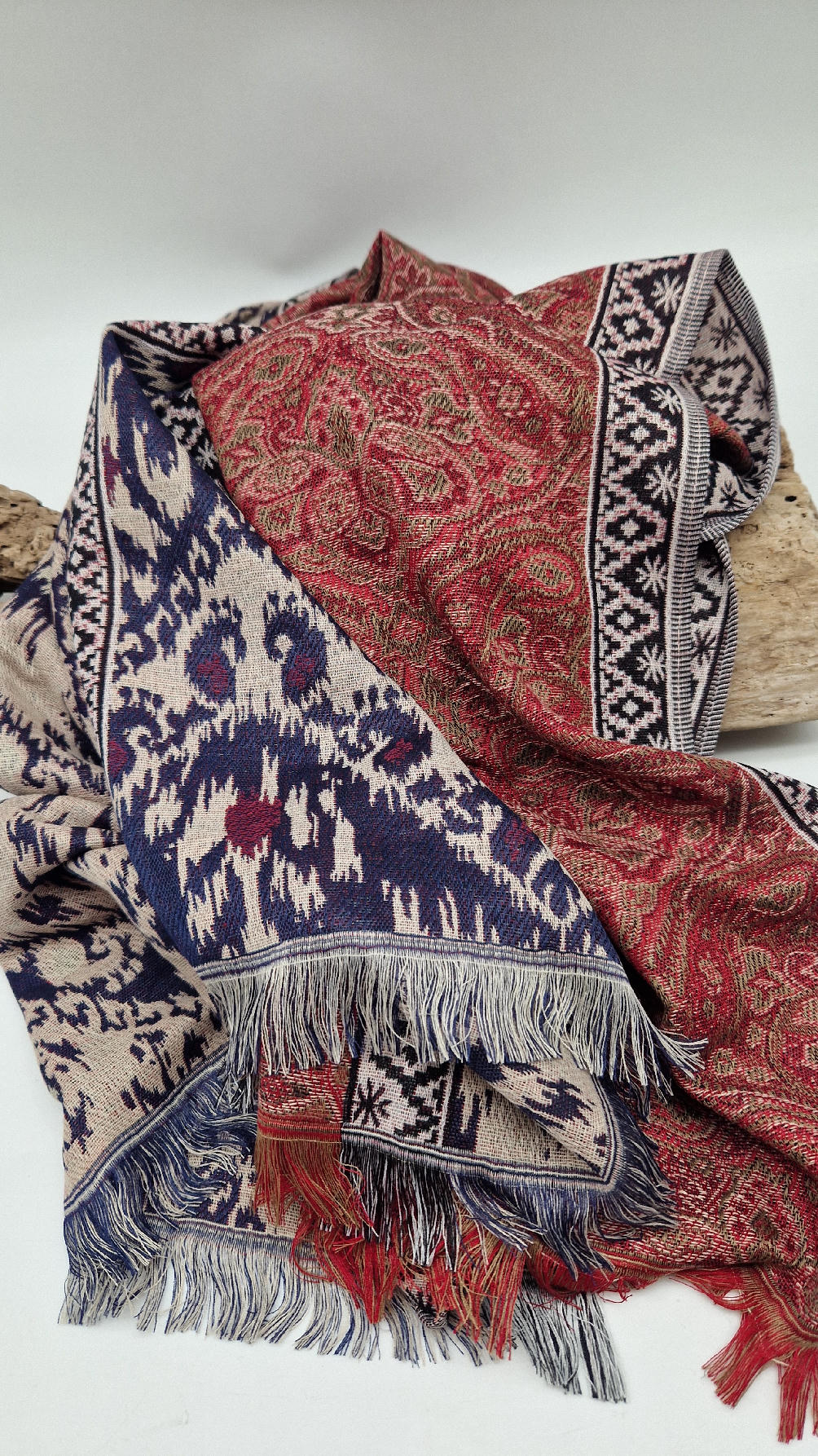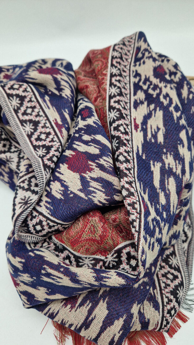 Duży miękki, piękny, kolorowy, cudny wręcz, egzotyczny ciut,  piękny szal we wzory , elegancki i ponadczasowy kaszmirowy szal Ciepły, miły i niegryzący.