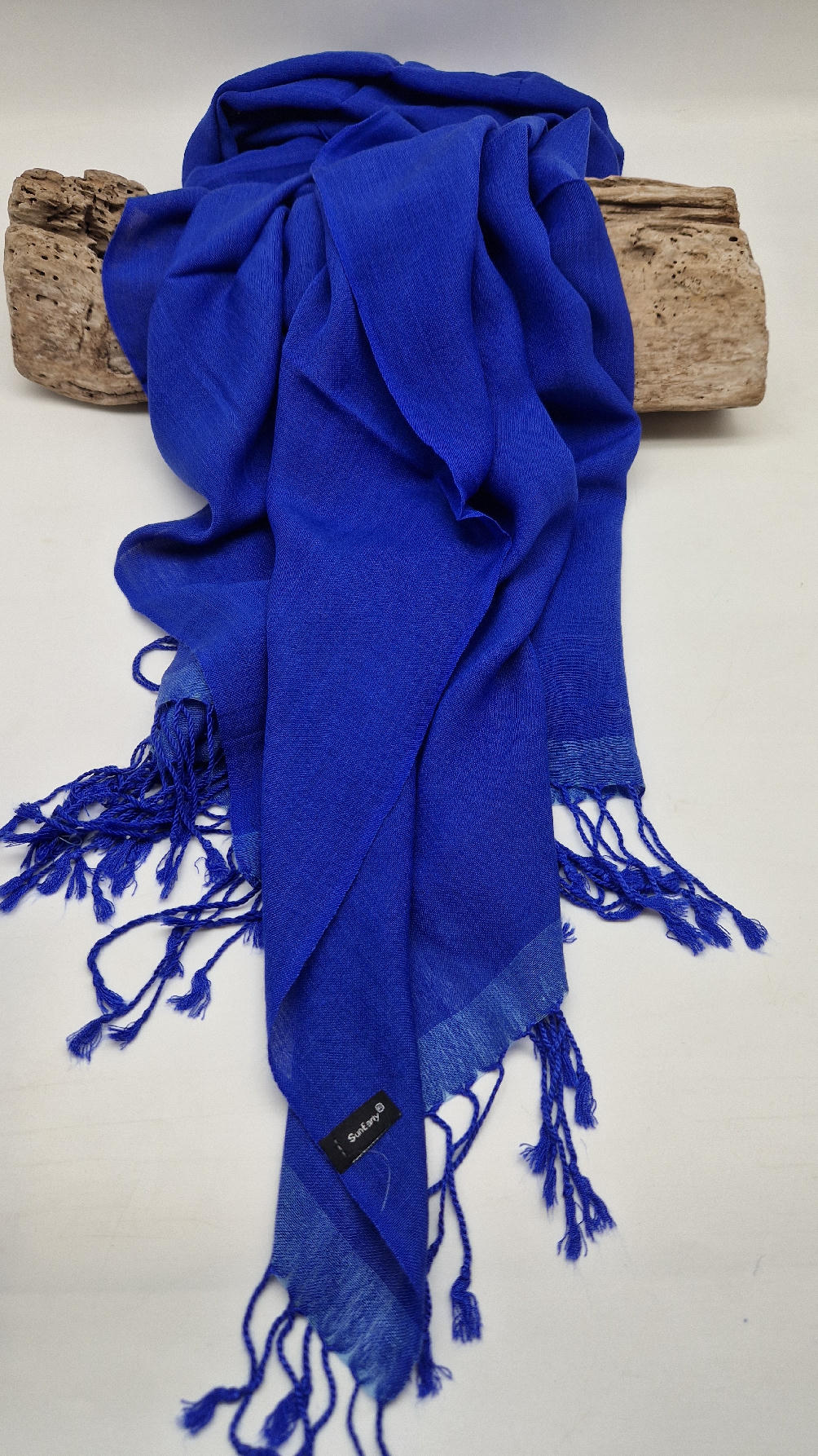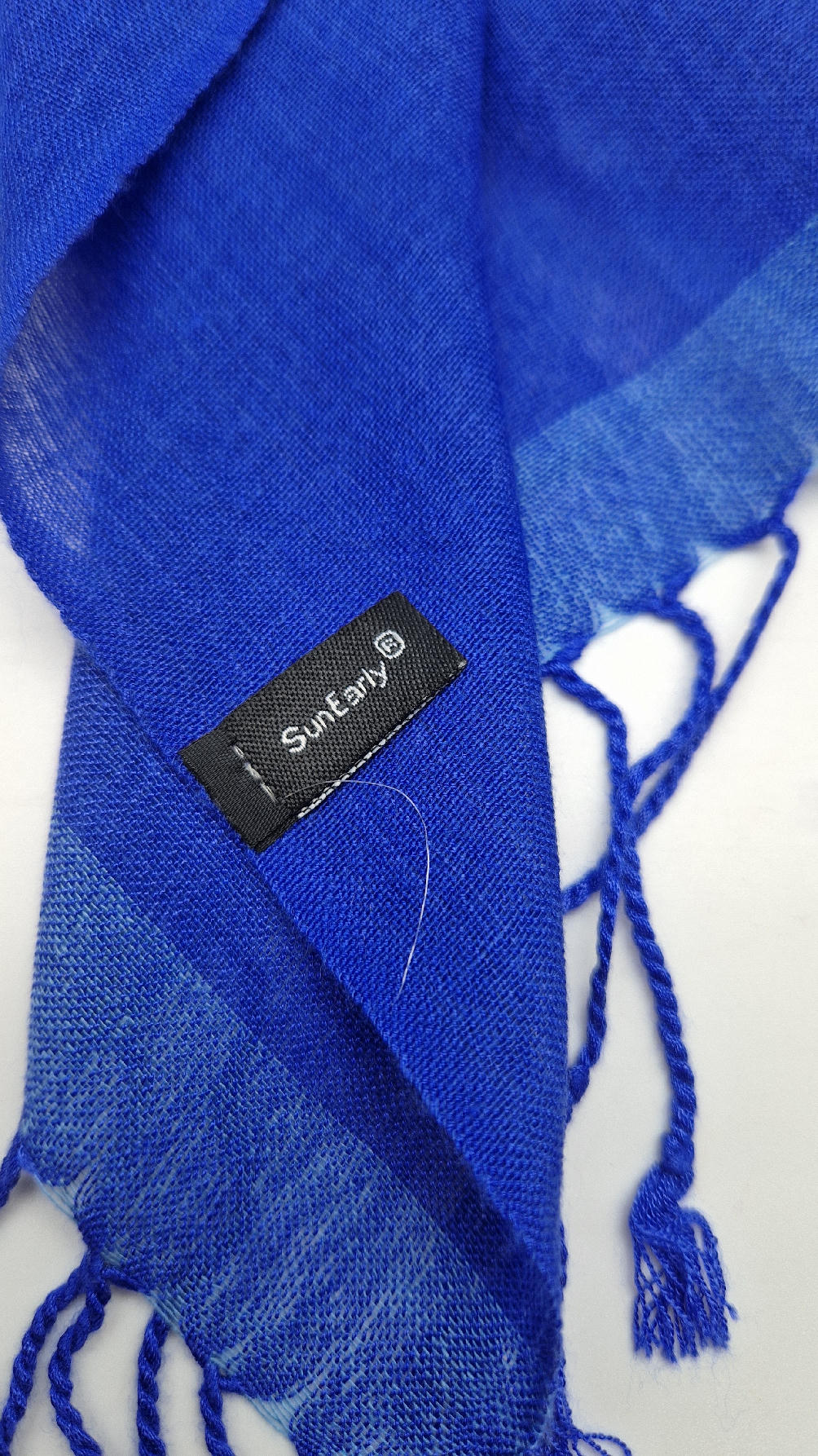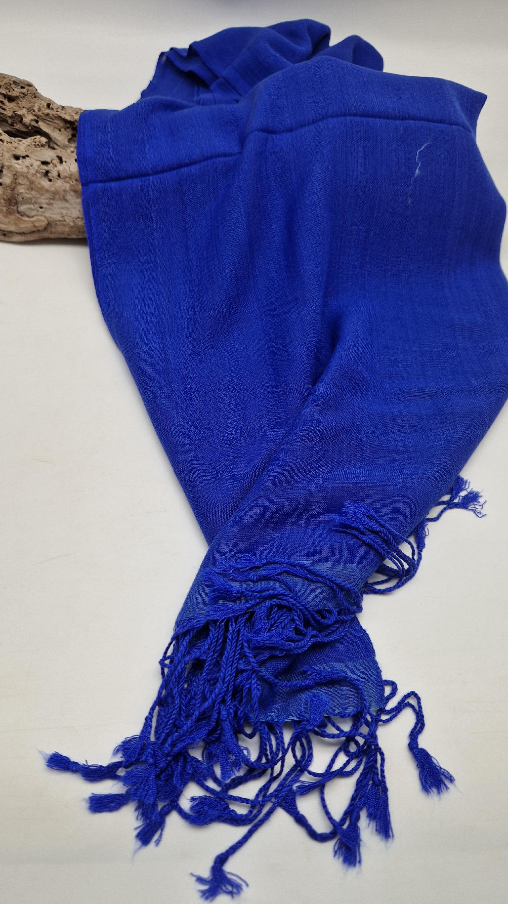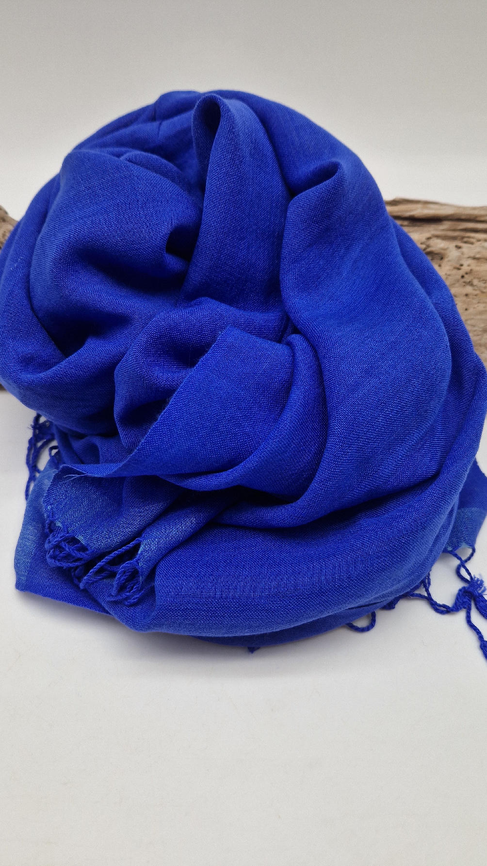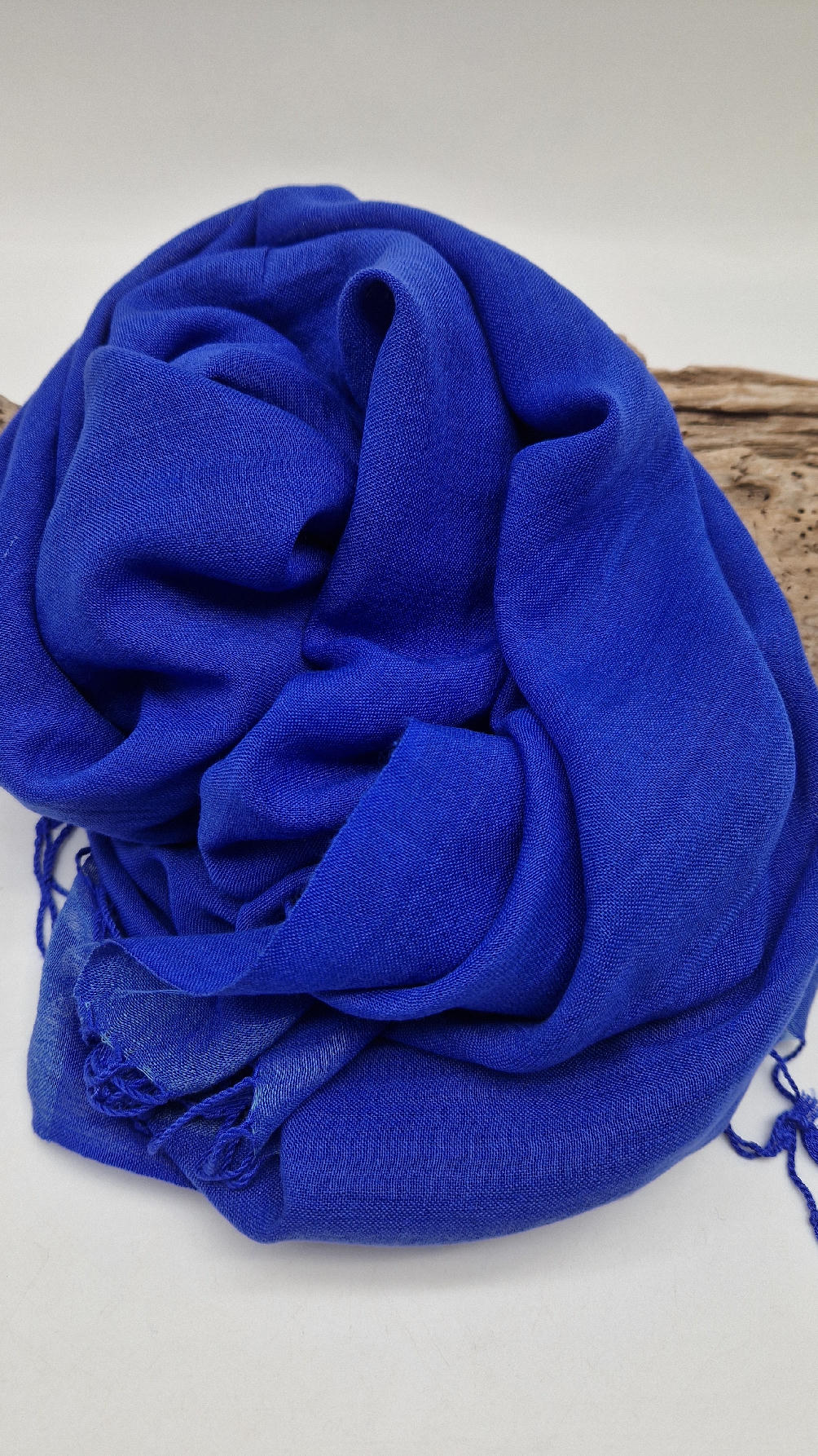 Duży, bardzo miękki, kobaltowo-niebieski, cienki, gładki szal z frędzlami  z lekkim, takim jedwabistym połyskiem.