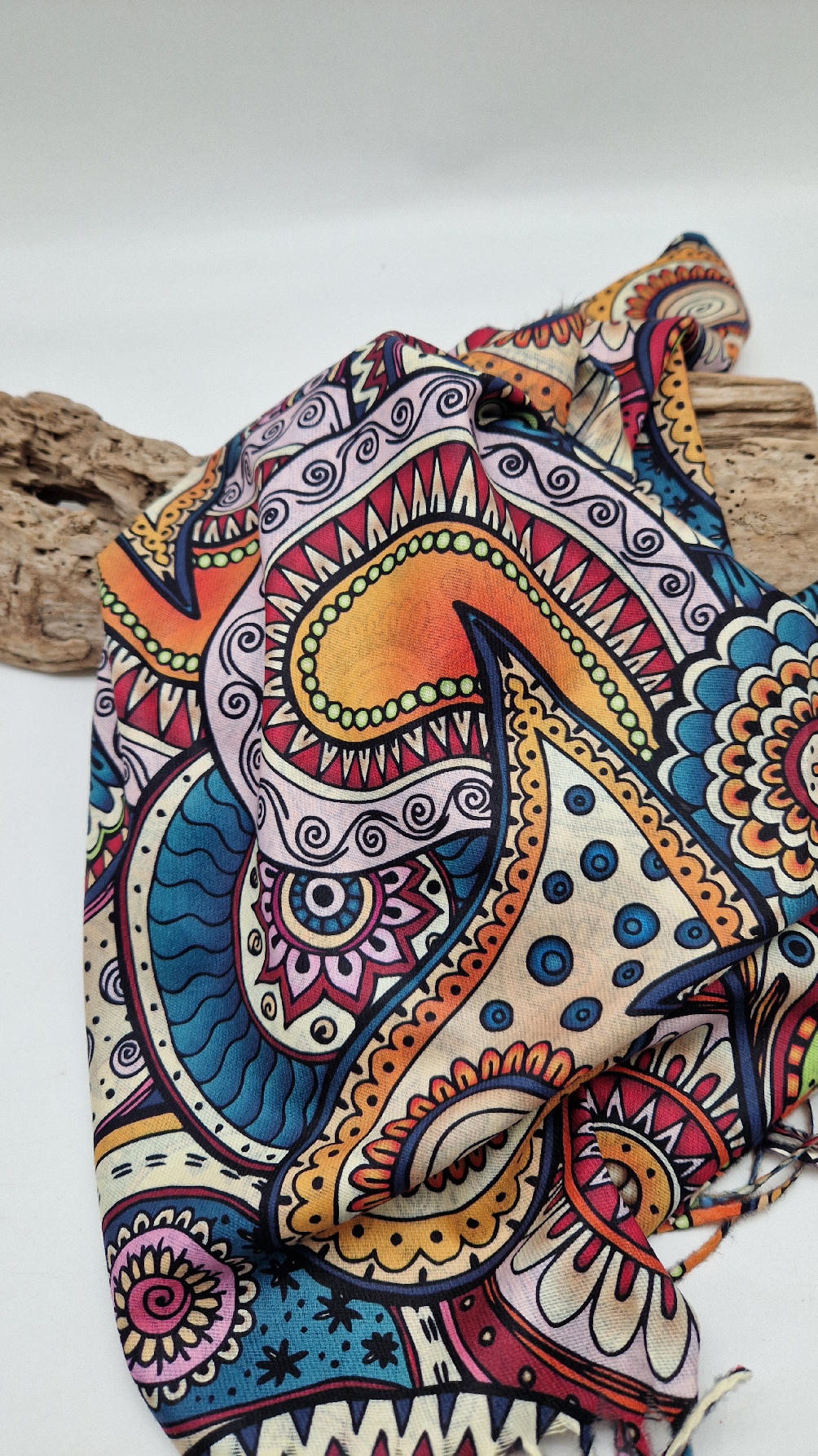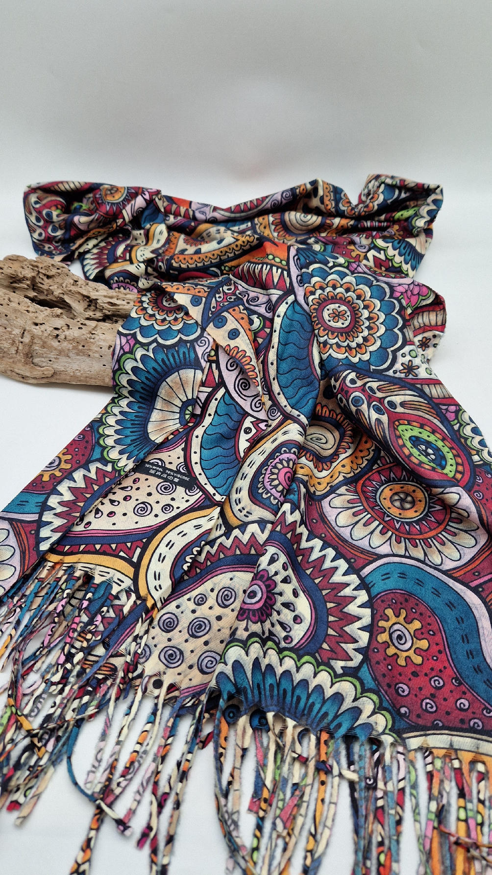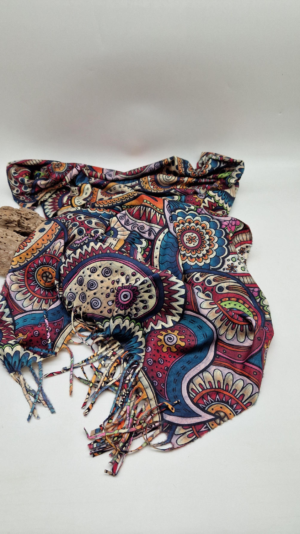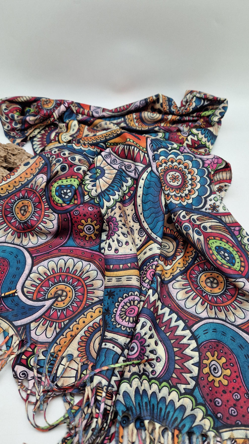 Duży, bardzo miękki turkusowo-różowo-zielono-pomarańczowo-czerwono-beżowy…elegancki szal w kolorowe , radosne wzory z frędzlami. Szalik jest grubszy , ale nie taki bardzo gruby..taki idealny po prostu. Świetnie zestawione kolory, energetyczne i eleganckie zarazem, z lekkim, takim jedwabistym połyskiem.