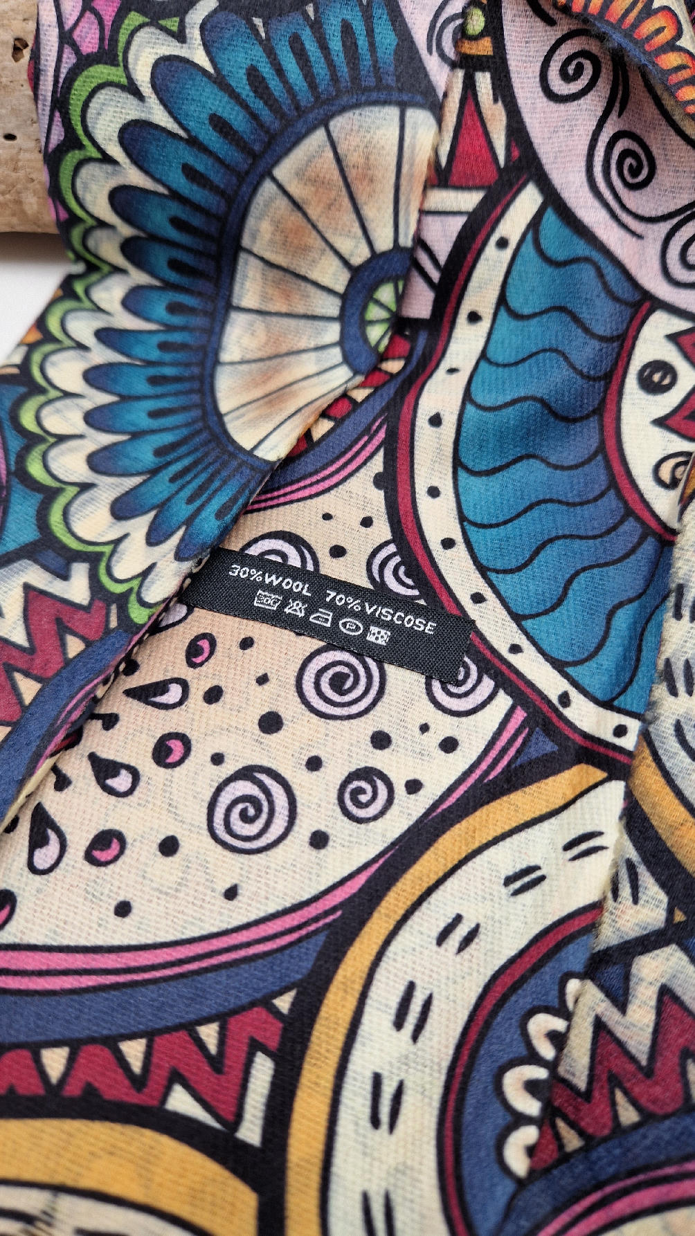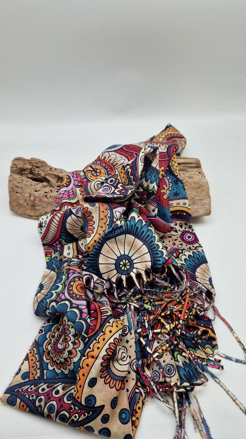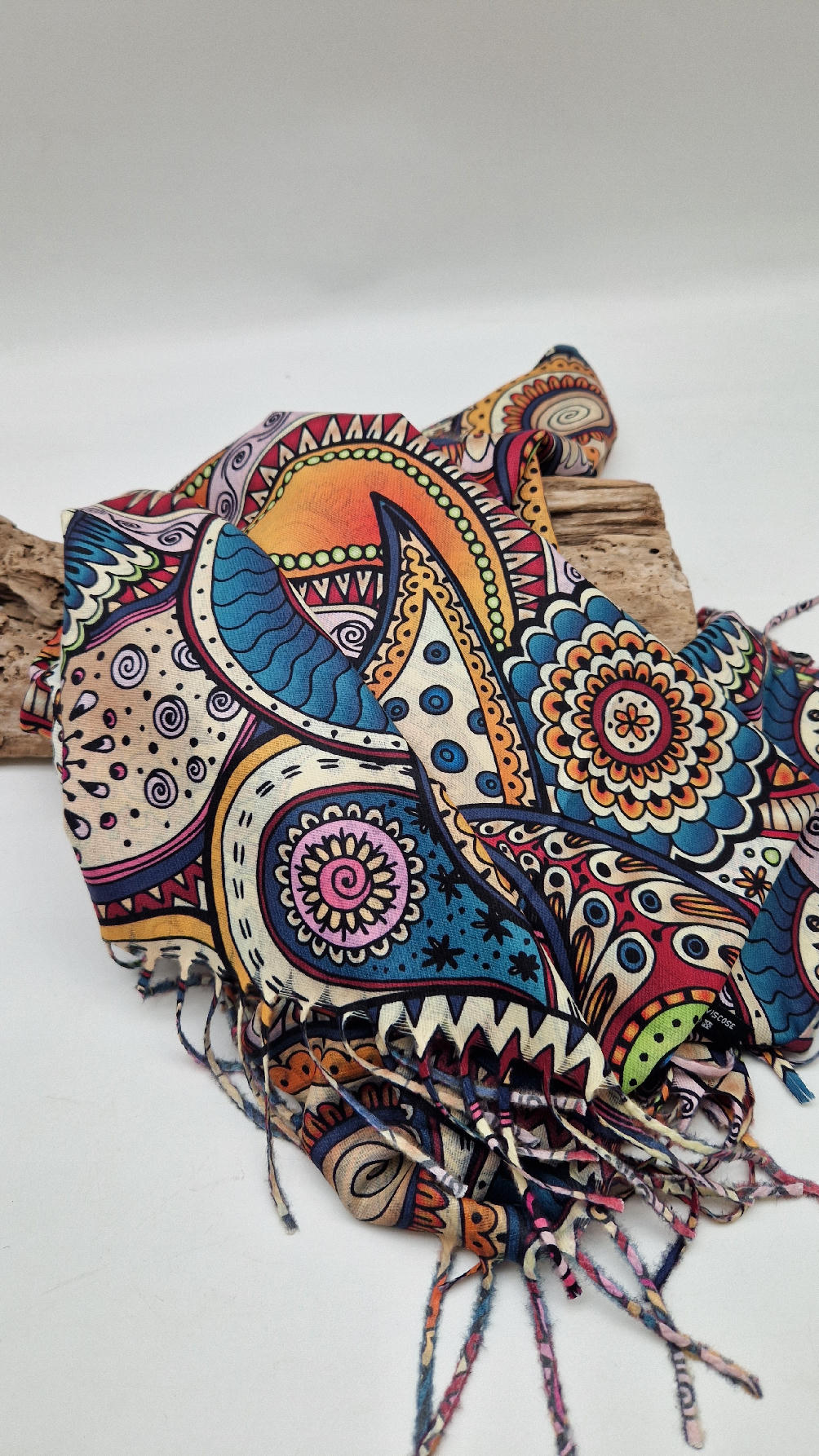 Duży, bardzo miękki turkusowo-różowo-zielono-pomarańczowo-czerwono-beżowy…elegancki szal w kolorowe , radosne wzory z frędzlami. Szalik jest grubszy , ale nie taki bardzo gruby..taki idealny po prostu. Świetnie zestawione kolory, energetyczne i eleganckie zarazem, z lekkim, takim jedwabistym połyskiem.