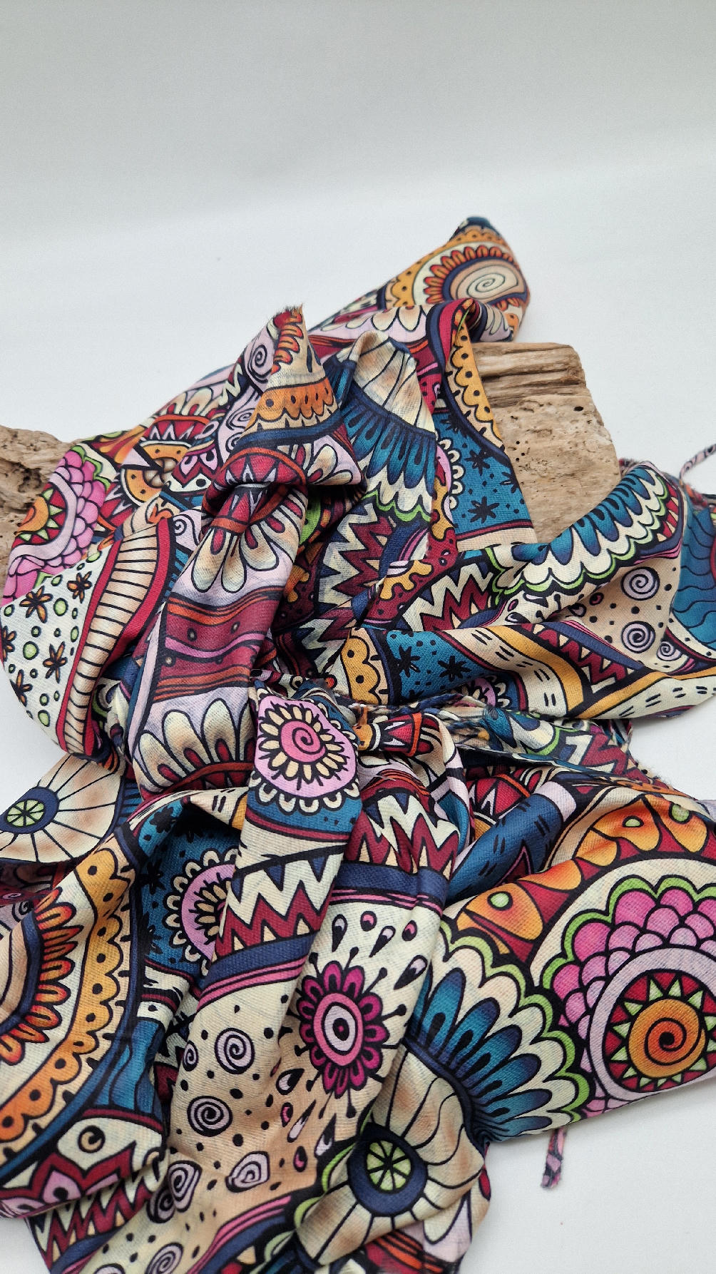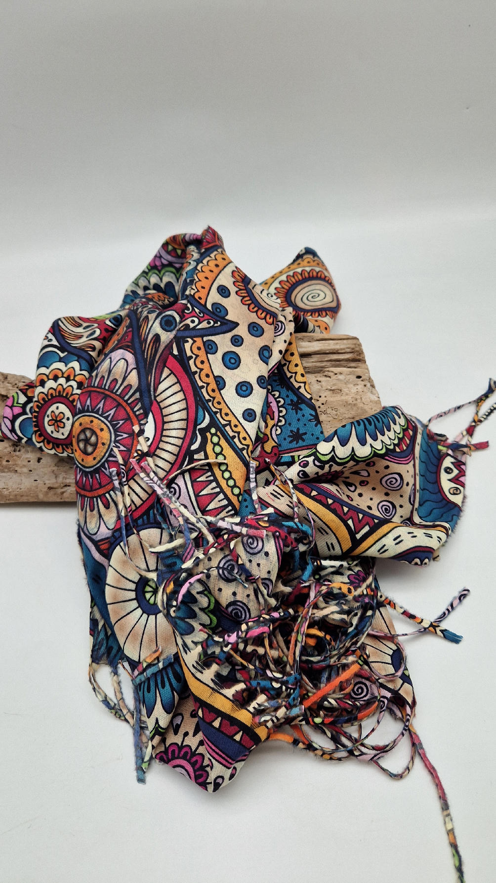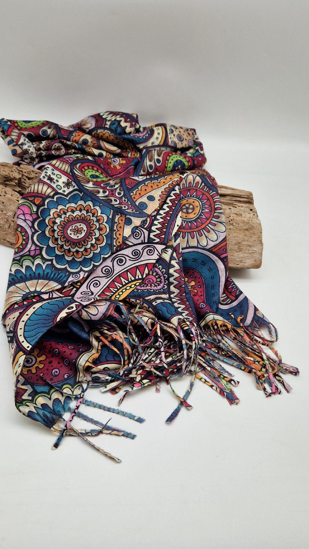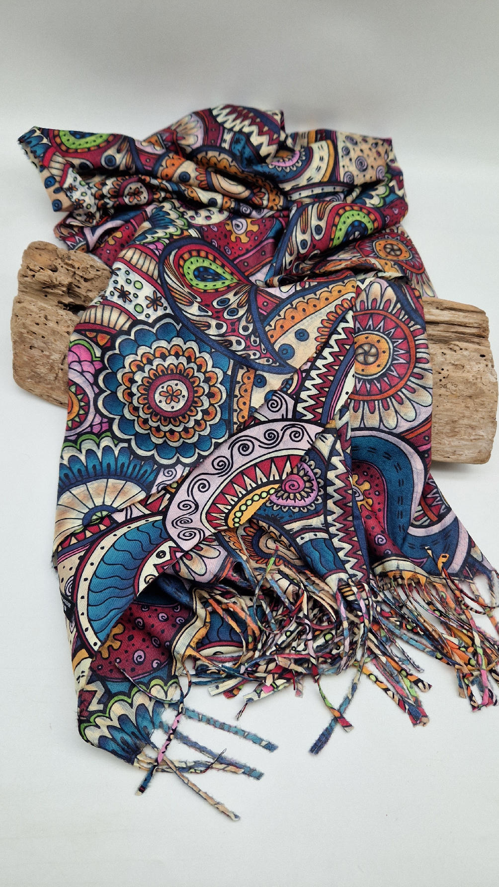 Duży, bardzo miękki turkusowo-różowo-zielono-pomarańczowo-czerwono-beżowy…elegancki szal w kolorowe , radosne wzory z frędzlami. Szalik jest grubszy , ale nie taki bardzo gruby..taki idealny po prostu. Świetnie zestawione kolory, energetyczne i eleganckie zarazem, z lekkim, takim jedwabistym połyskiem.