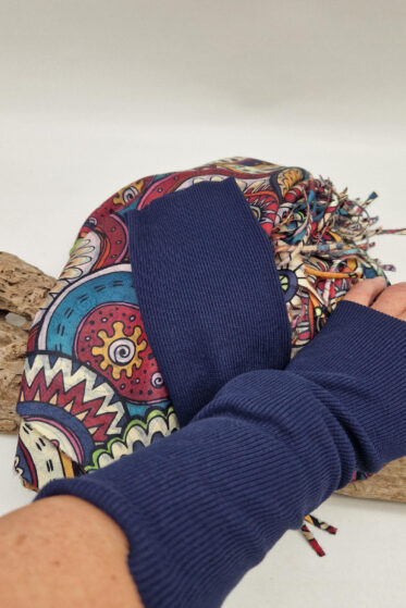 Niewielki, ale śliczny, mocno intensywny i nasycony szalik w paski , taki do wywiązania pod szyją, lub założenia na głowę z pomocą gumki…; zawsze możesz połączyć go z innym , na przykład różowym, gładkim, tak ja robię bardzo często, tworząc duży , kolorowy szal :)