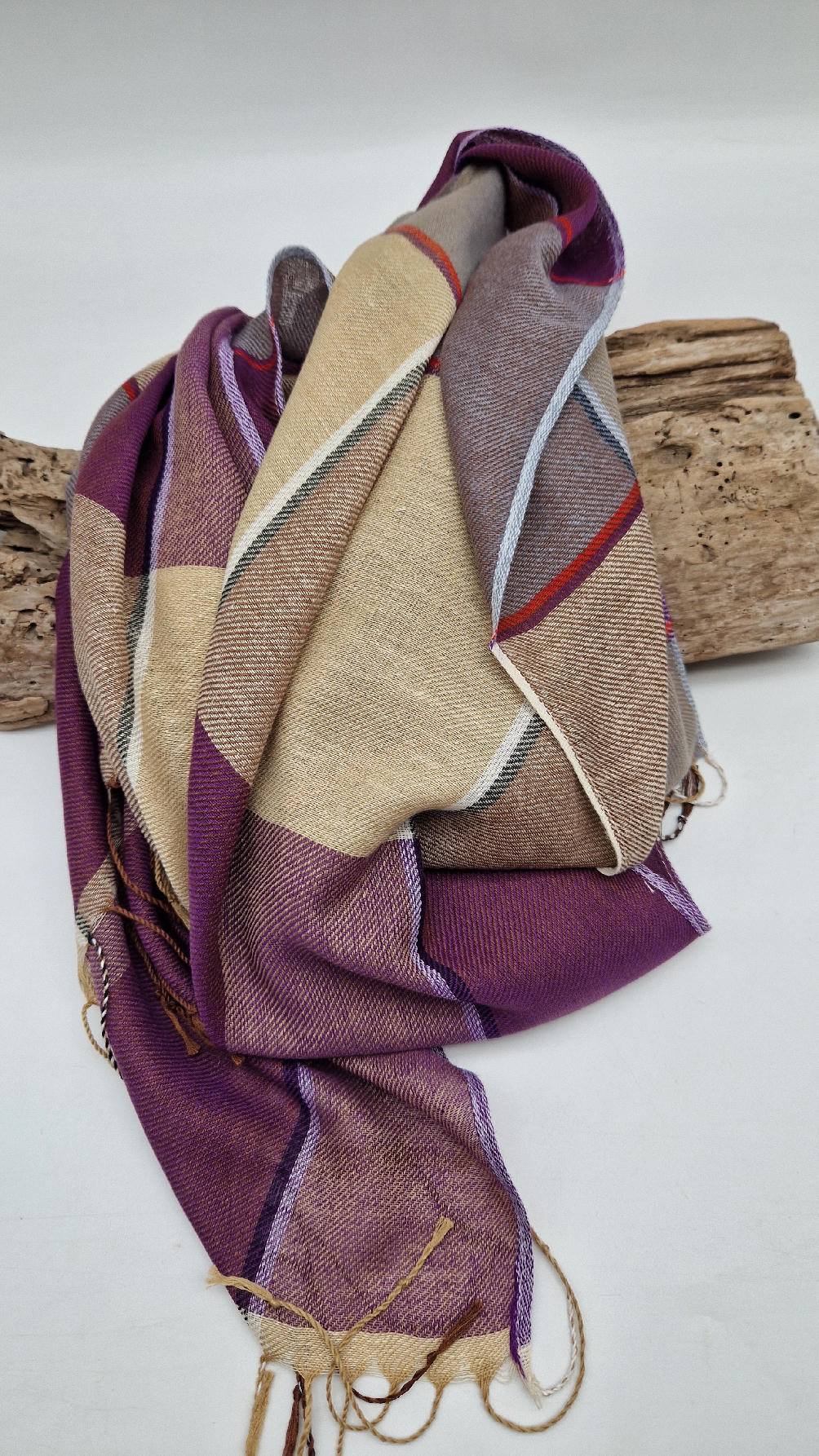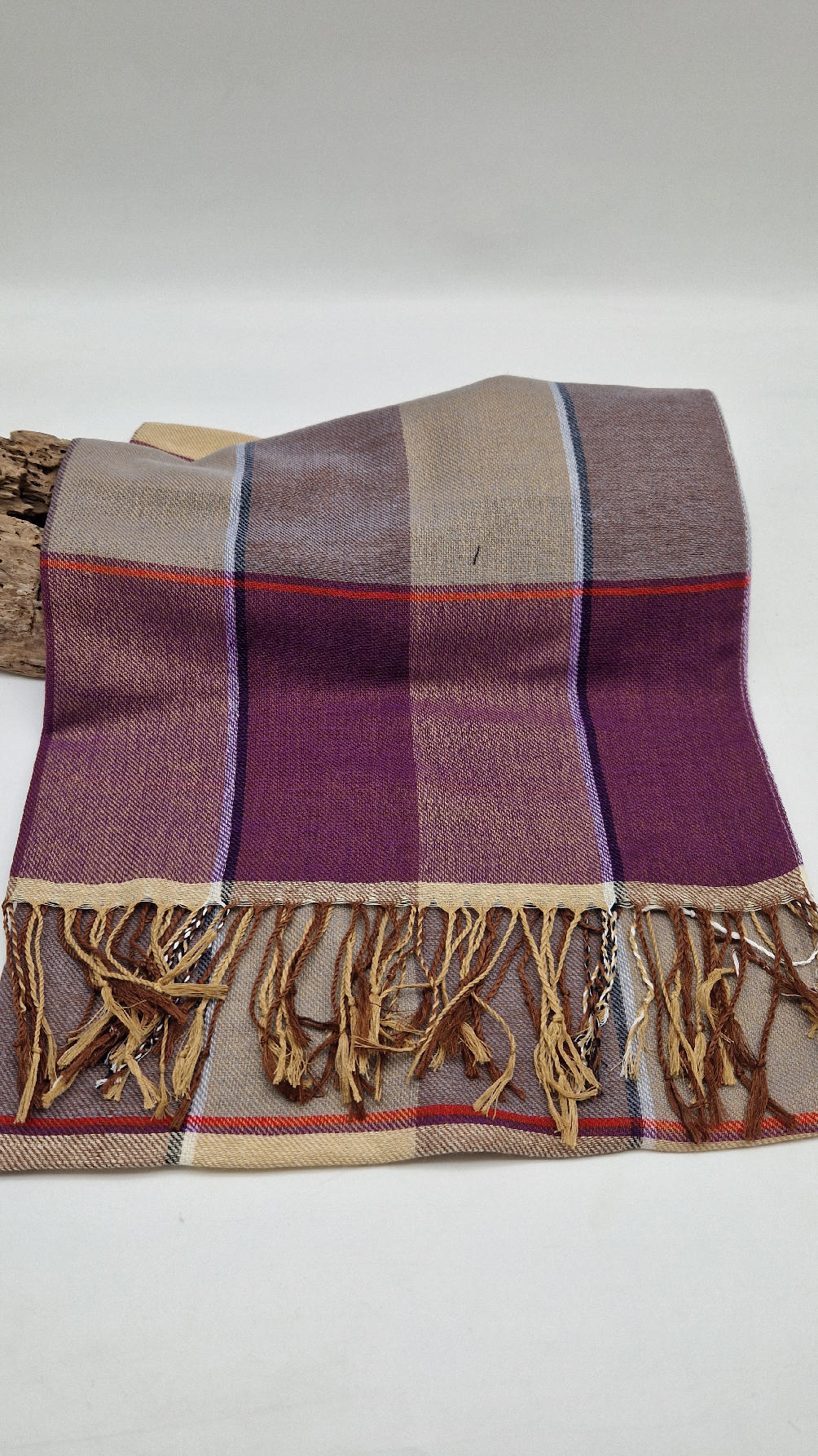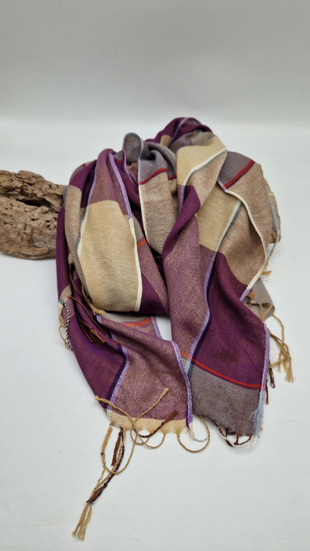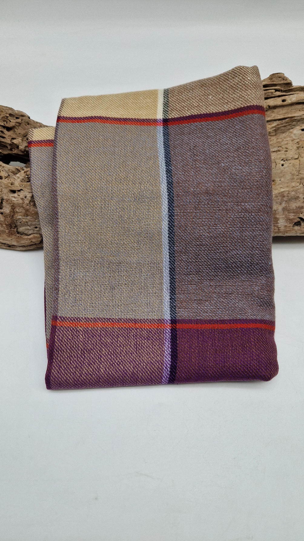 Duży, miękki, klasyczny szal w dużą beżowo-fioletową kratę z ociupiną pomarańczu . Cudny, zwariowany i ponadczasowy, elegancki, taki…z włoskim  sznytem…dla Ciebie, a może dla eleganckiego mężczyzny …?