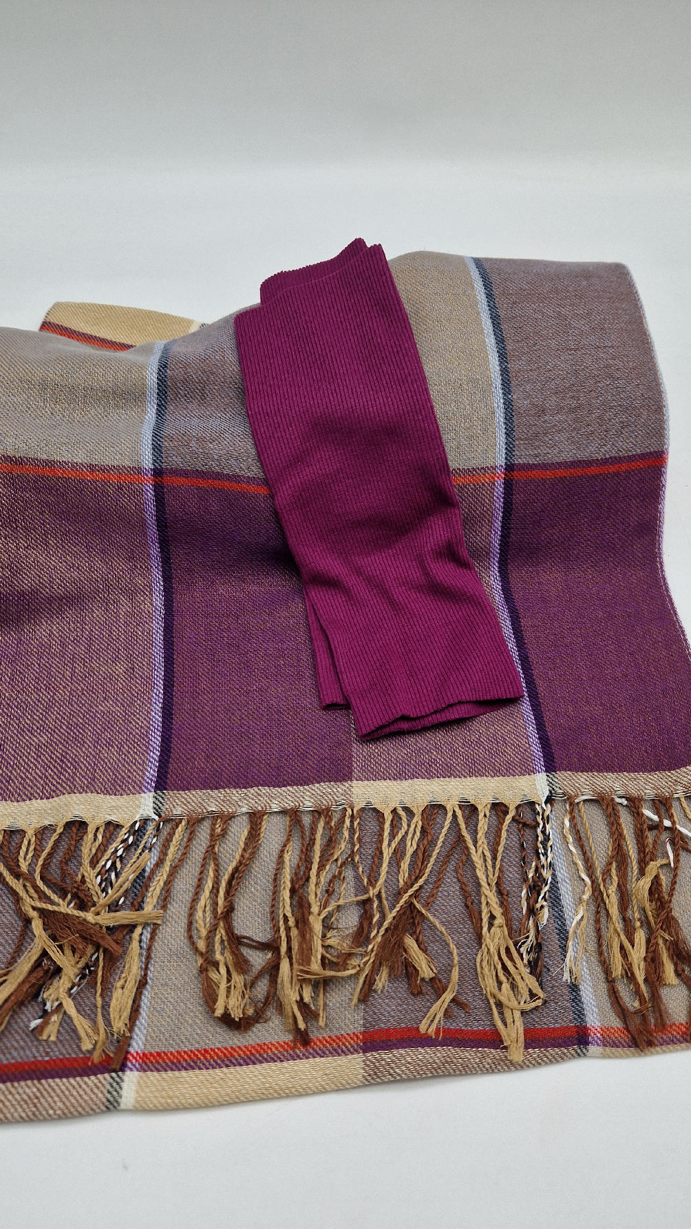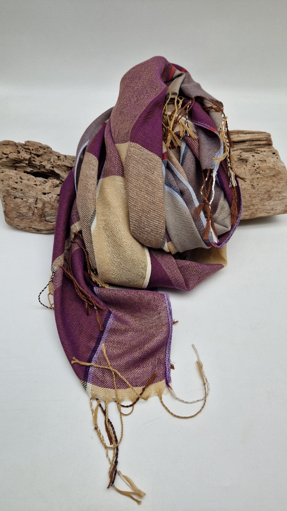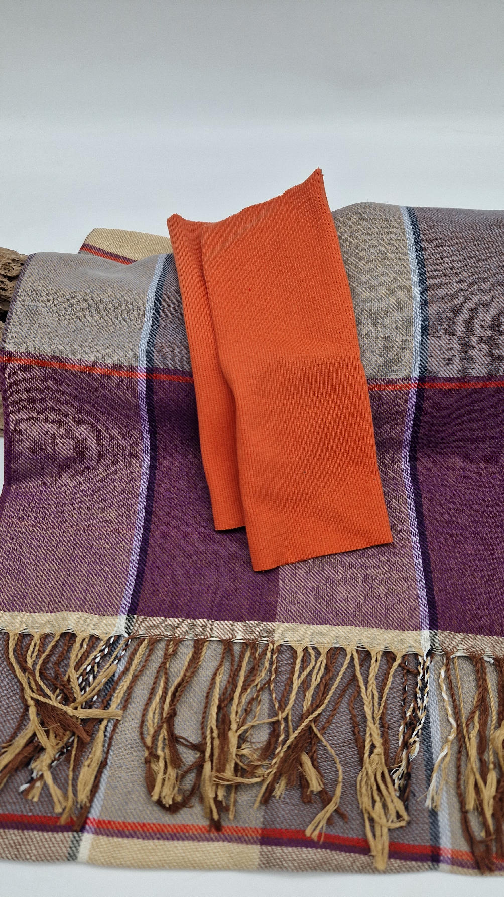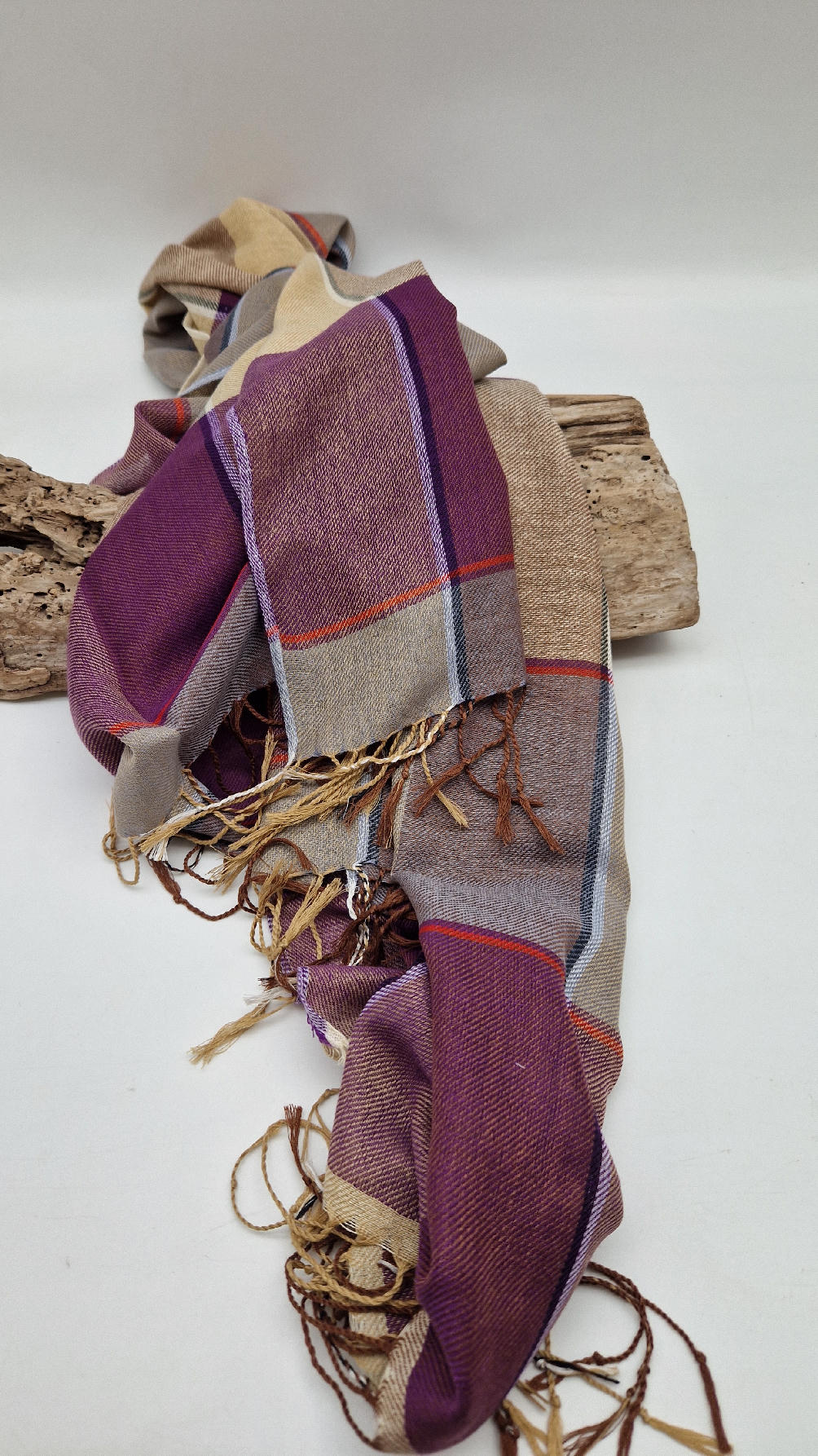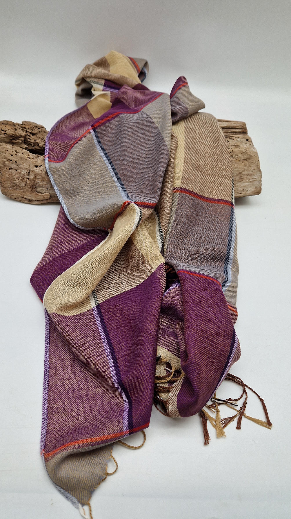 Duży, miękki, klasyczny szal w dużą beżowo-fioletową kratę z ociupiną pomarańczu . Cudny, zwariowany i ponadczasowy, elegancki, taki…z włoskim  sznytem…dla Ciebie, a może dla eleganckiego mężczyzny …?