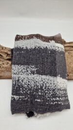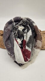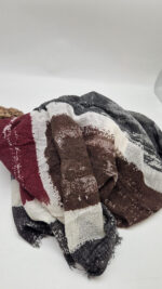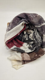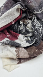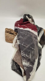Bardzo duży, miękki i szorstki równocześnie , taki jakby z tetry, kremowo-beżowo-szary, z ociupina bordo…śliczny, elegancki i artystyczny, pognieciony … cudownie otulający szal, idealny do katany, czy otulaka . Świetnie zestawione kolory, lekko przytłumione, zamglone….