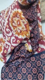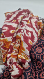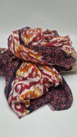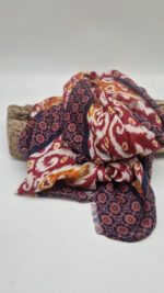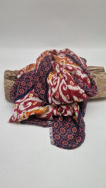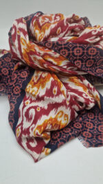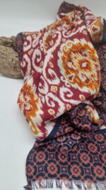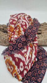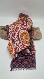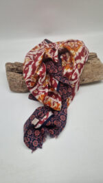 Duży, bardzo miękki, bordowo-biały, elegancki szal we wzory z odrobiną złota. Szalik jest grubszy ciut, taki idealny do katany, czy otulaka . Świetnie zestawione kolory, energetyczne i eleganckie zarazem, z lekkim, takim jedwabistym połyskiem.