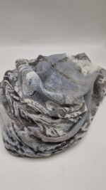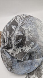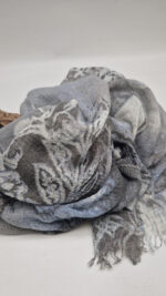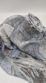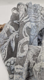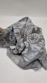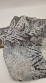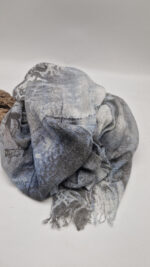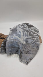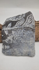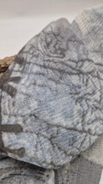 Bardzo duży, miękki i szorstki równocześnie , taki jakby z tetry, zielono-niebiesko-szary, taki zamglony i ulotny szal w delikatne wzory, takie z mchu i paproci….śliczny, elegancki i artystyczny, pognieciony … cudownie otulający szal idealny do katany, czy otulaka . Świetnie zestawione kolory, lekko przytłumione, zamglone….