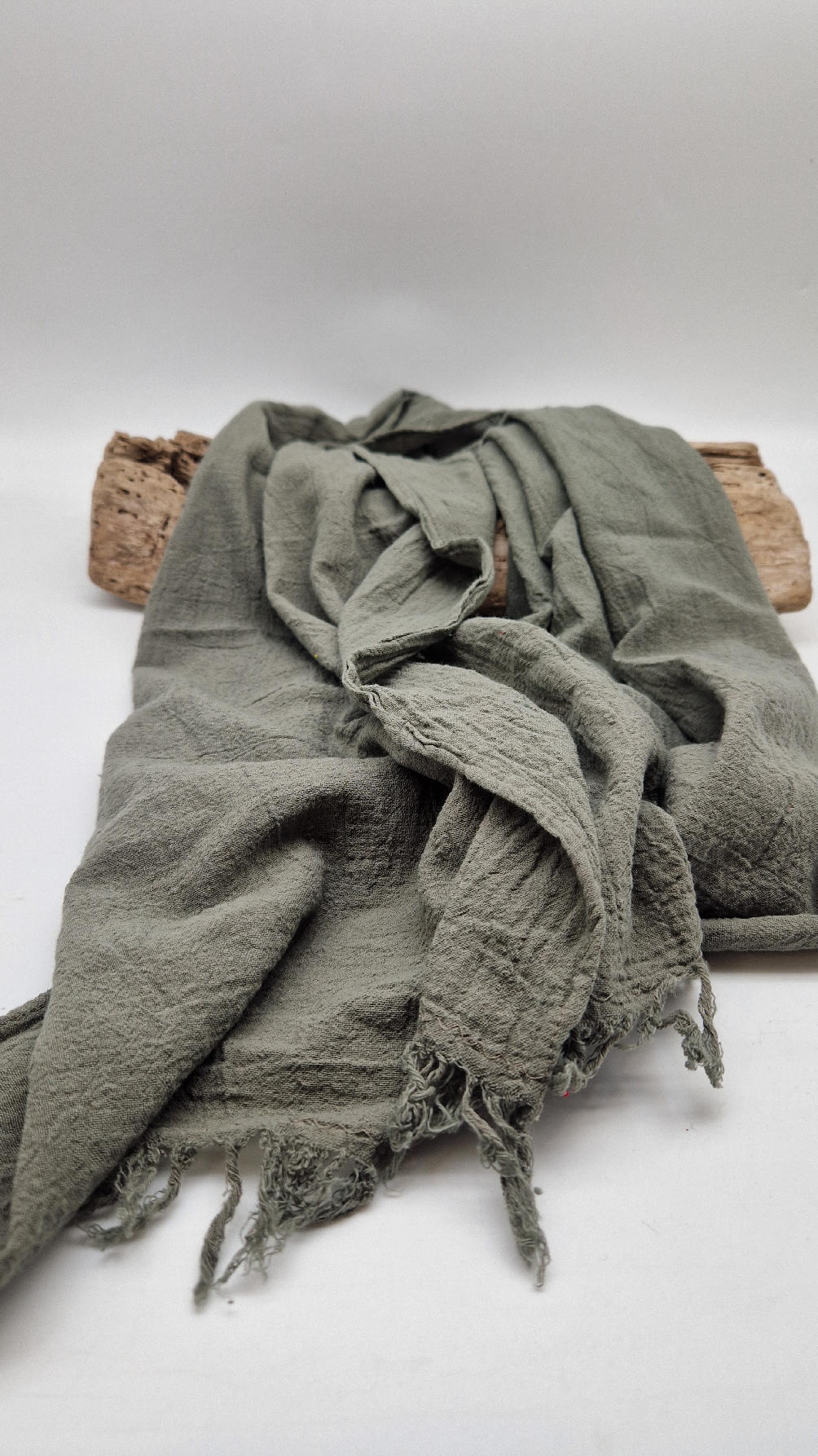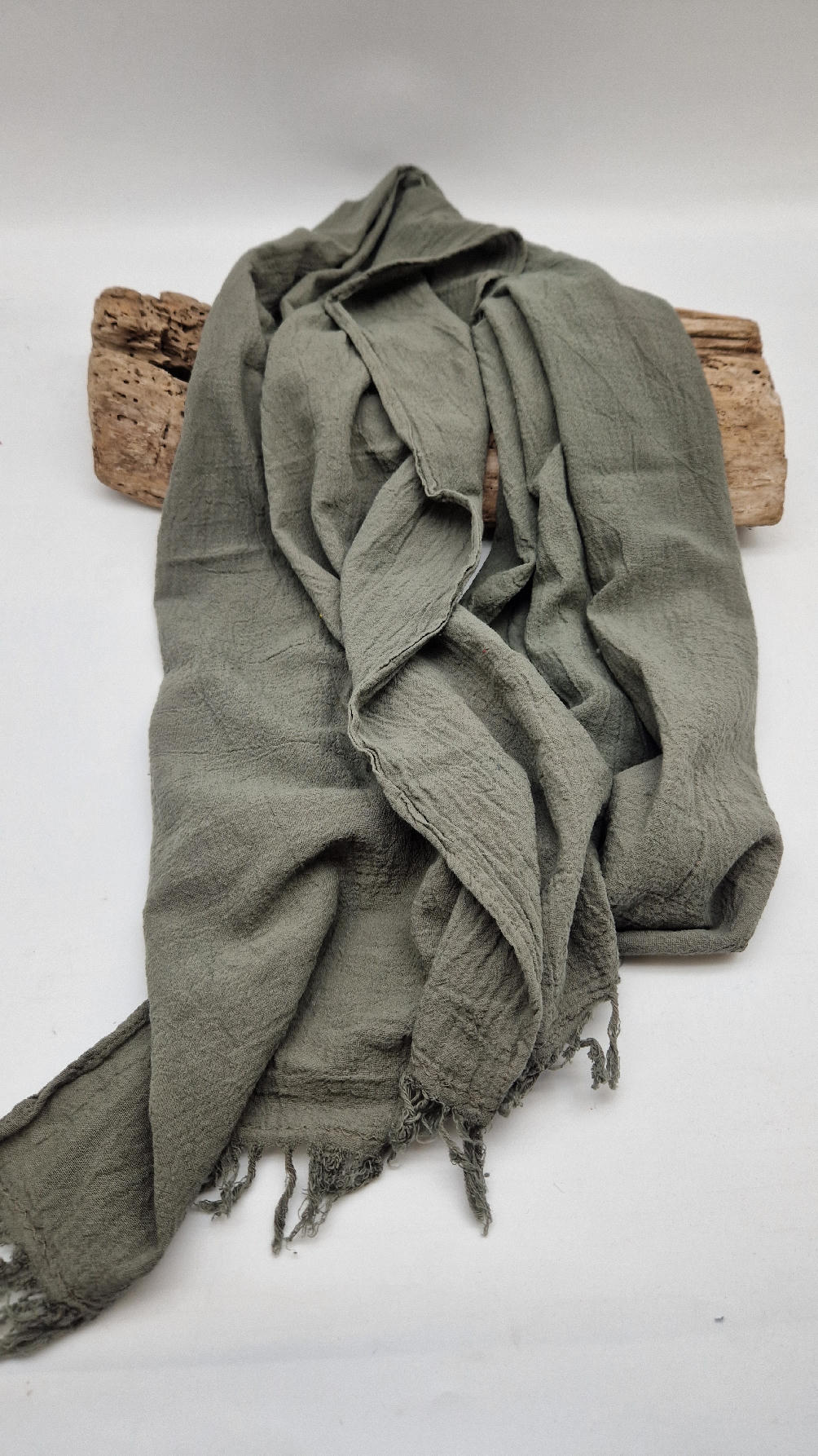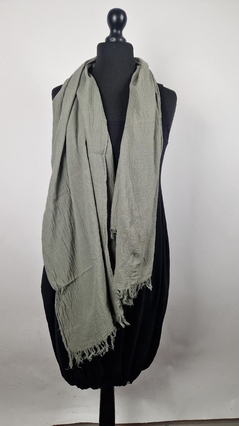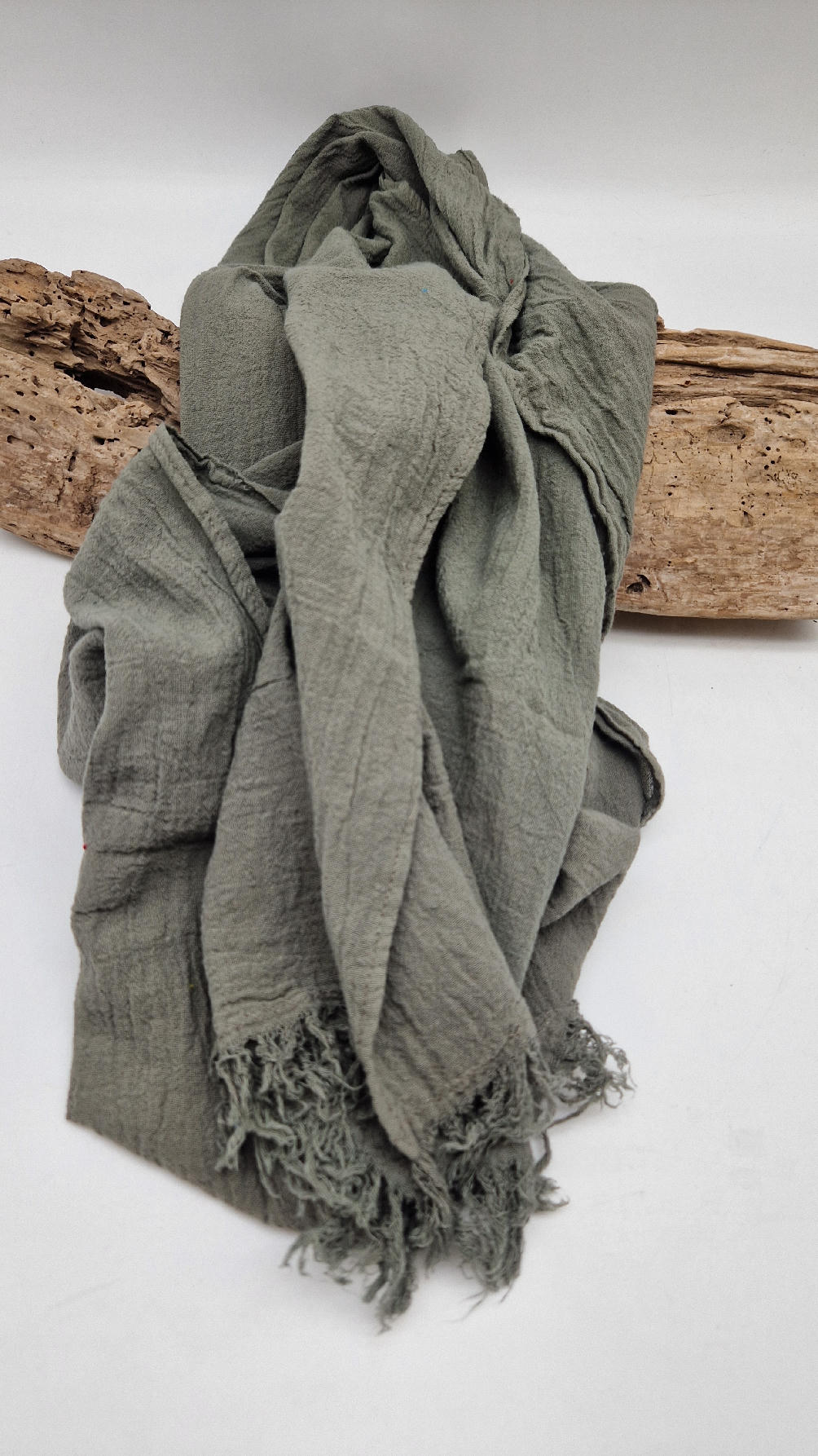 Duży, ręcznie robiony i farbowany szal z bawełny w eleganckim szaro-beżowym kolorze, pognieciony i zwariowany , z frędzlami .