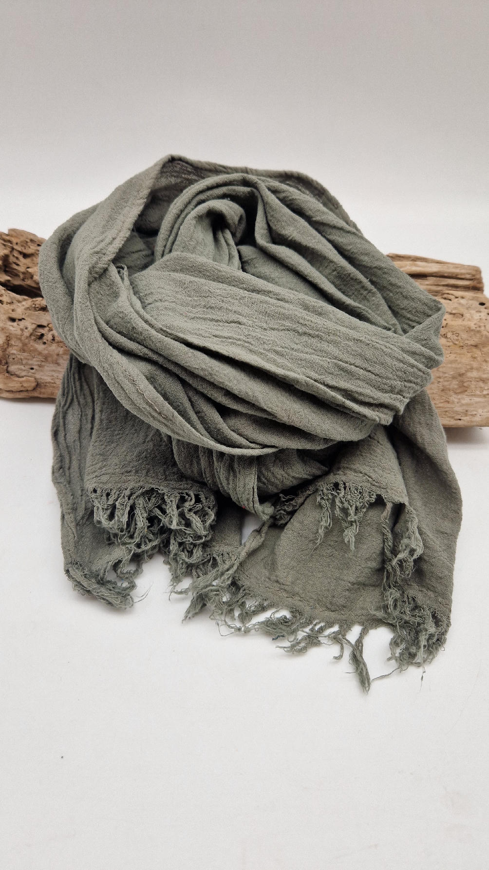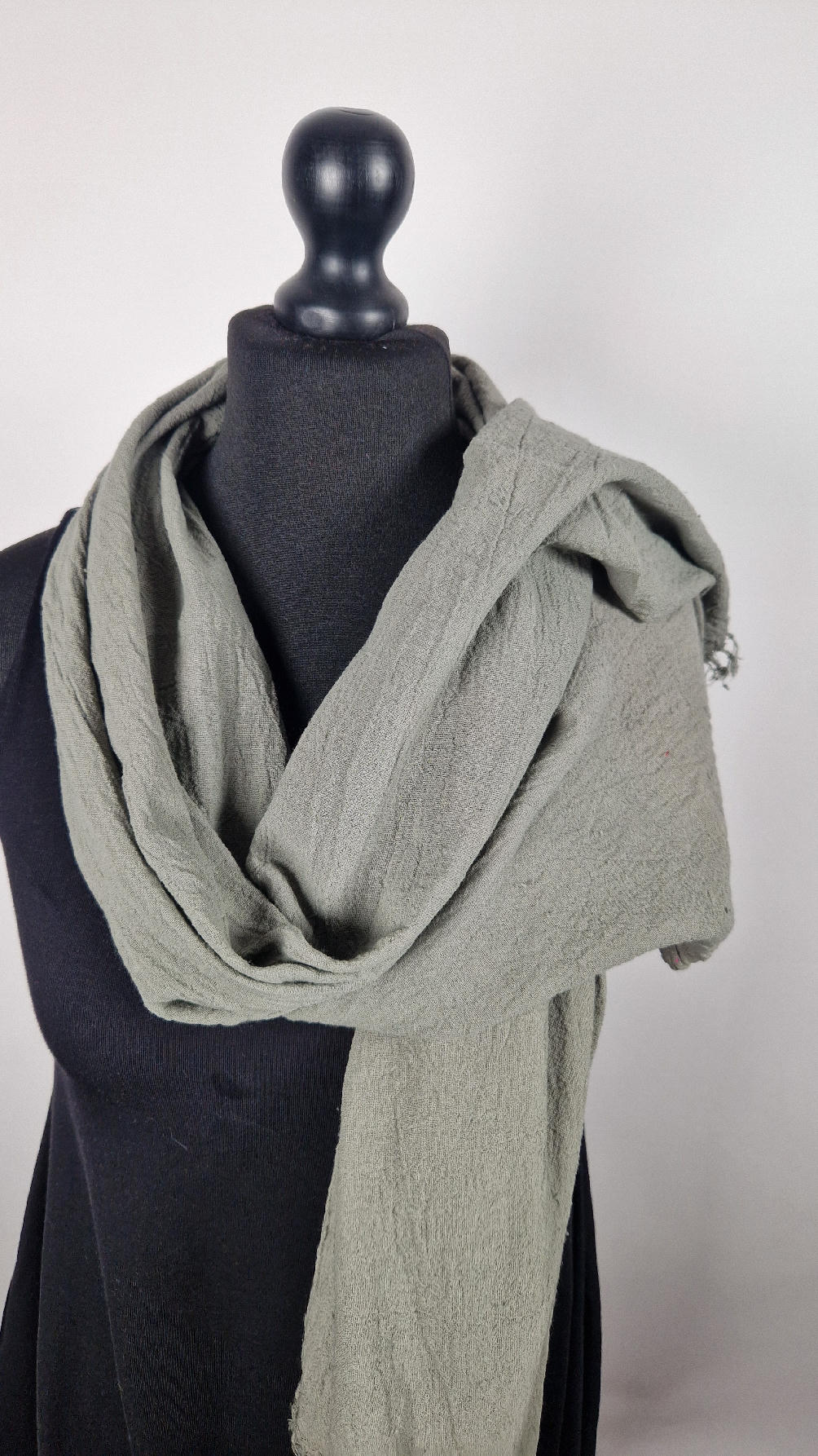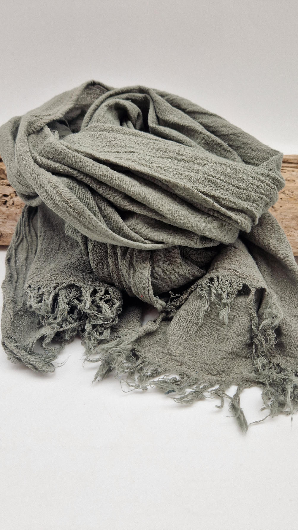 Duży, ręcznie robiony i farbowany szal z bawełny w eleganckim szaro-beżowym kolorze, pognieciony i zwariowany , z frędzlami .