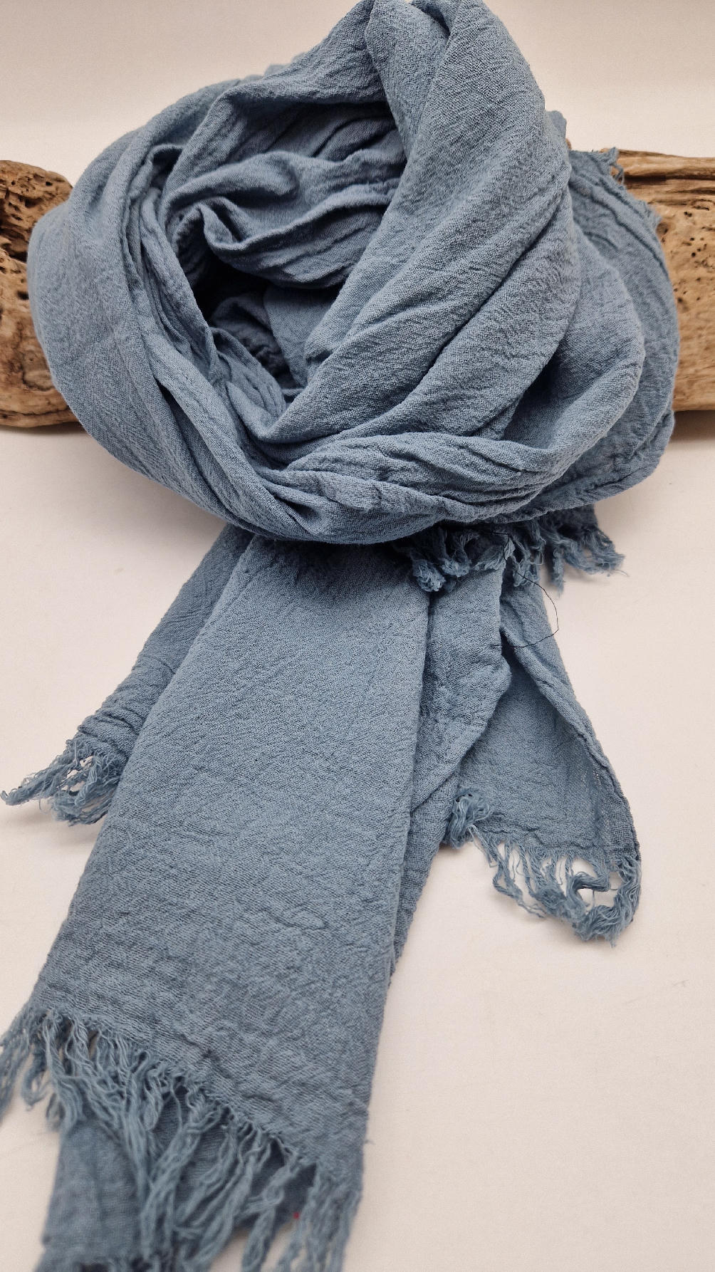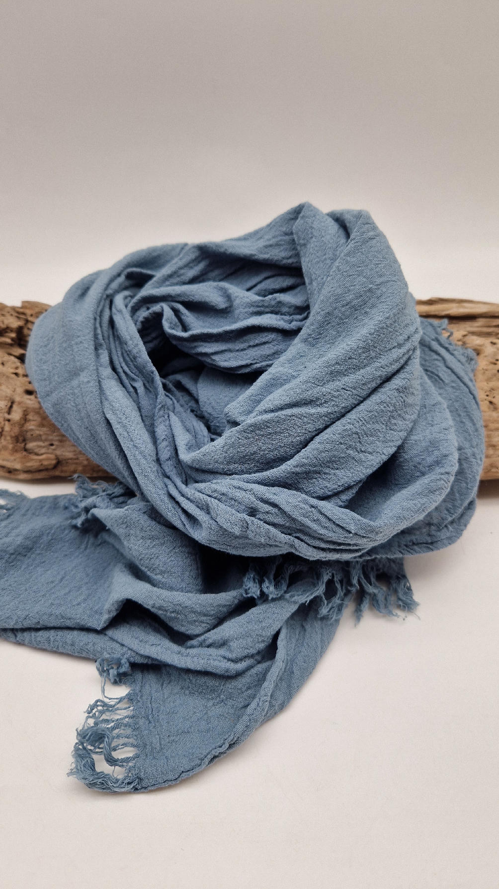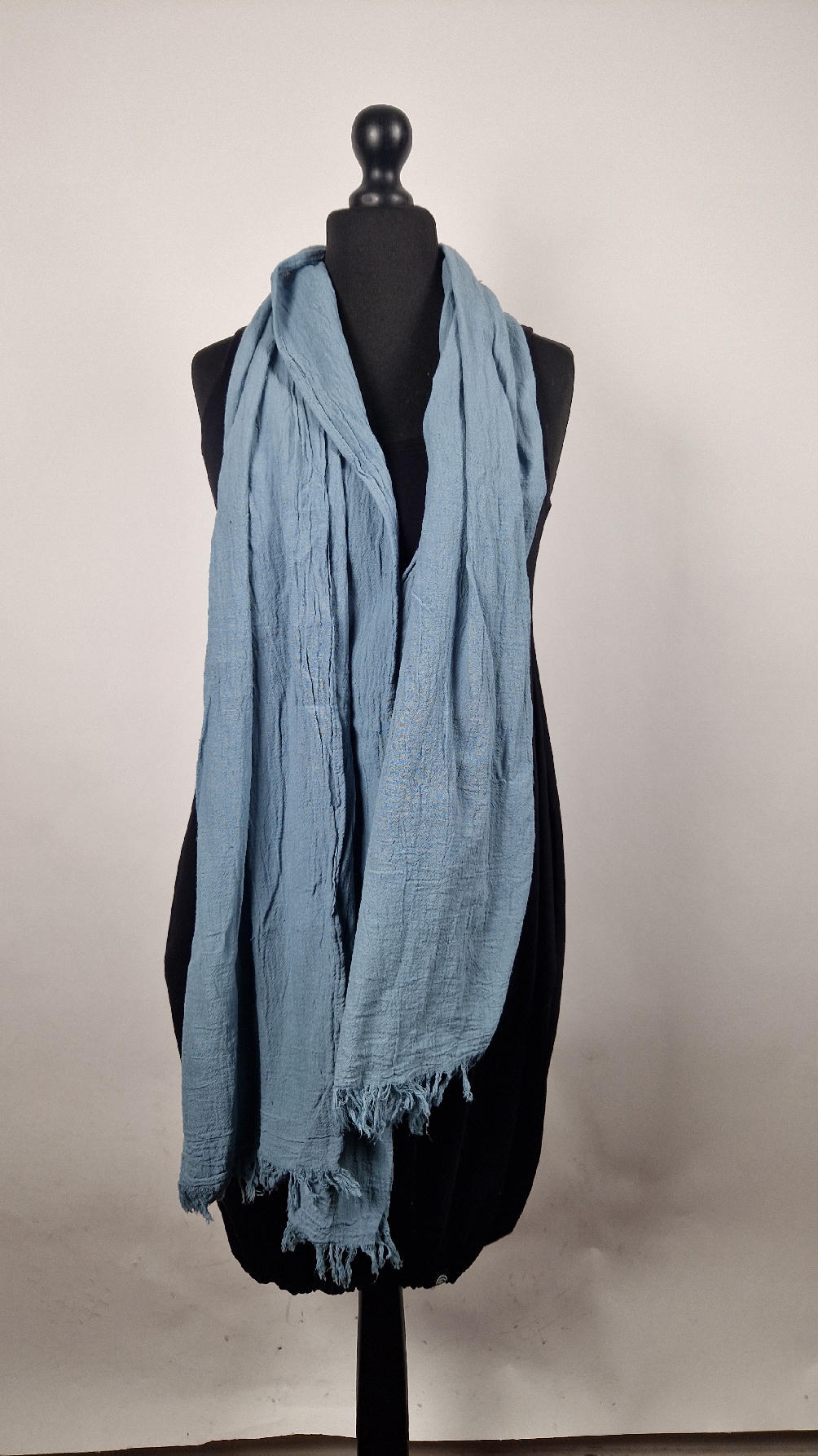 Duży, piękny szal z bawełny w błękitn0-szarym, romantycznym, rozmarzonym, takim impresjonistycznym kolorze, jak niebo przed burzą robiony ręcznie, pognieciony i zwariowany , z niewielkimi frędzlami .