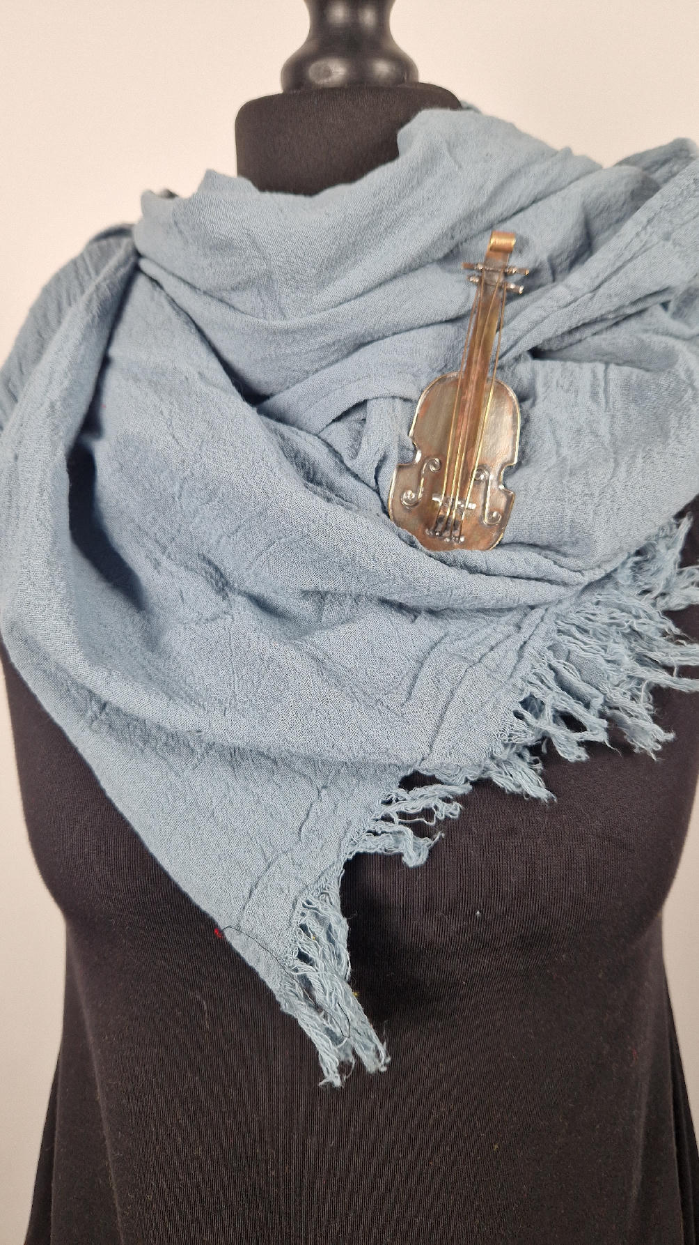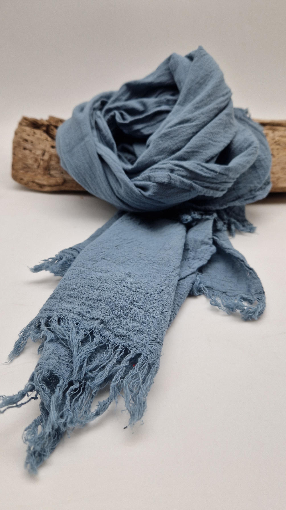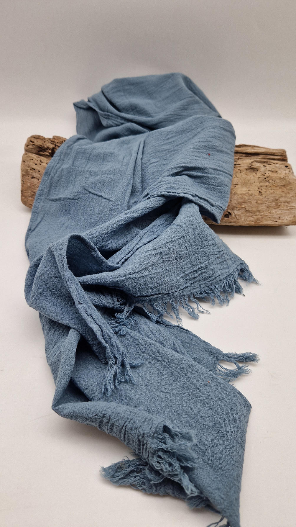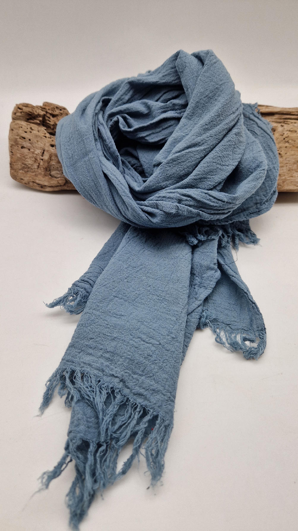 Duży, piękny szal z bawełny w błękitn0-szarym, romantycznym, rozmarzonym, takim impresjonistycznym kolorze, jak niebo przed burzą robiony ręcznie, pognieciony i zwariowany , z niewielkimi frędzlami .
