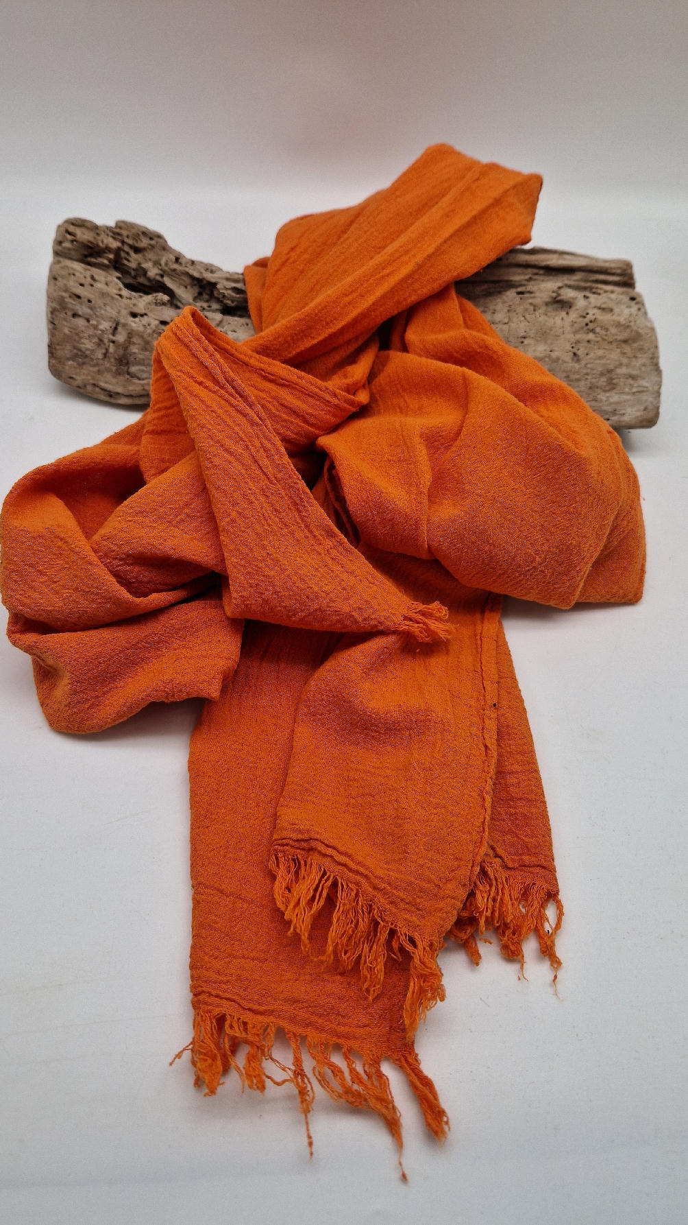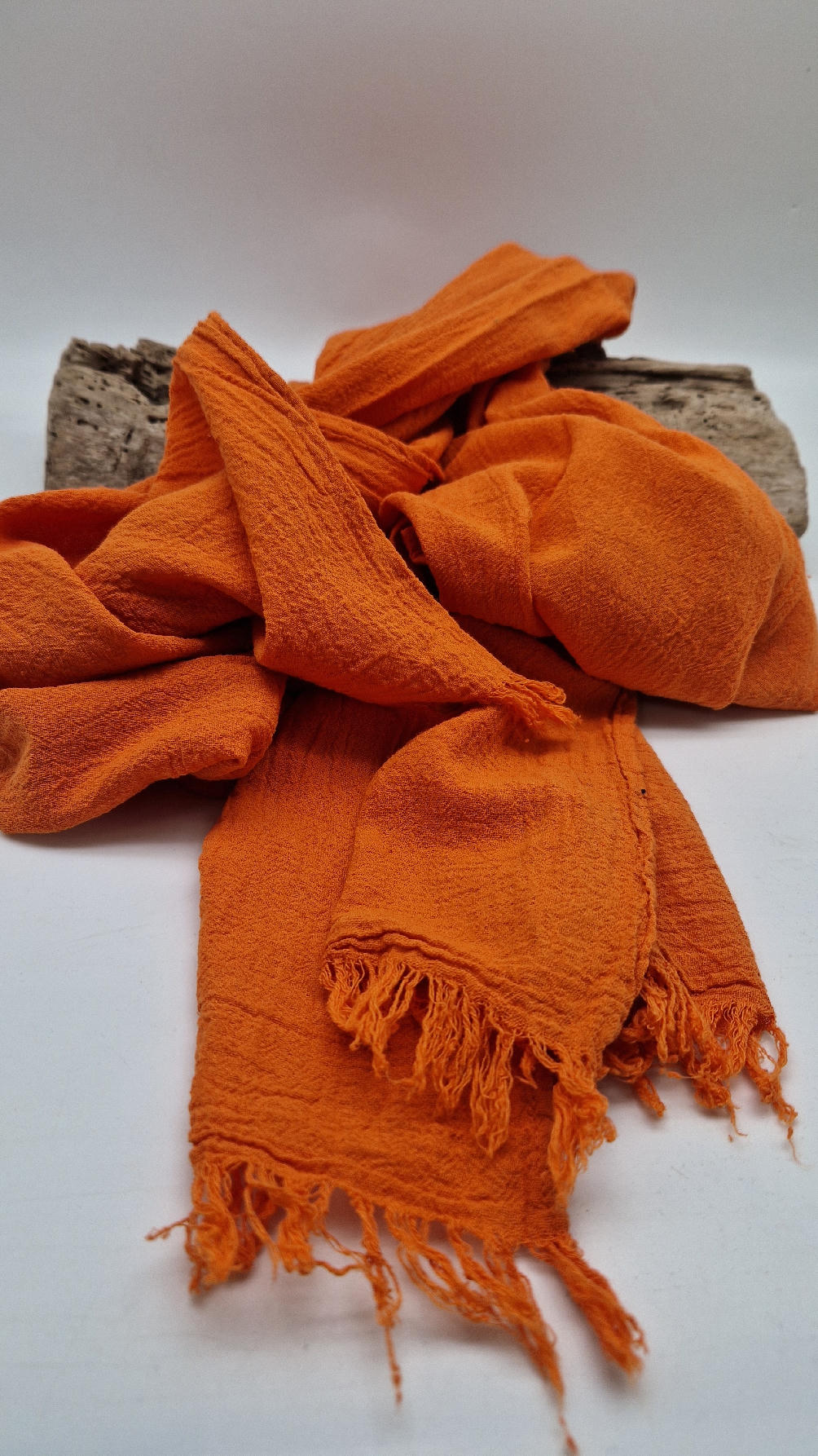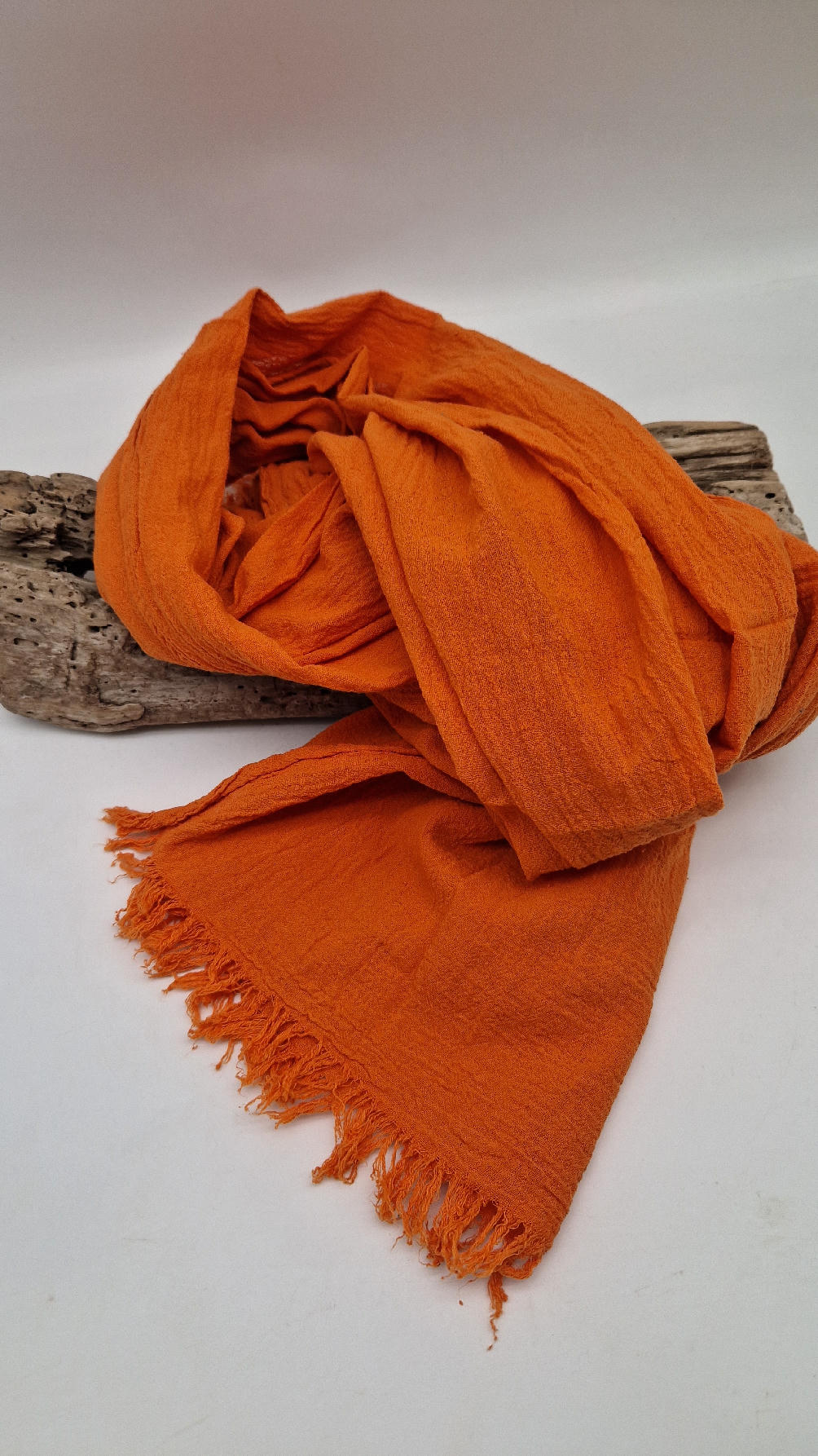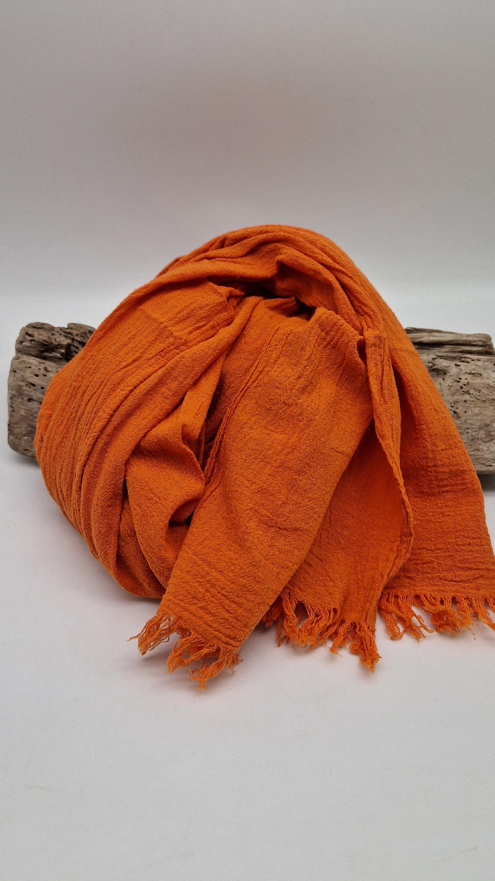 Duży, piękny szal z bawełny w bardzo głębokim kolorze, bardzo nasycony pomarańczowy pognieciony i zwariowany , z frędzlami .