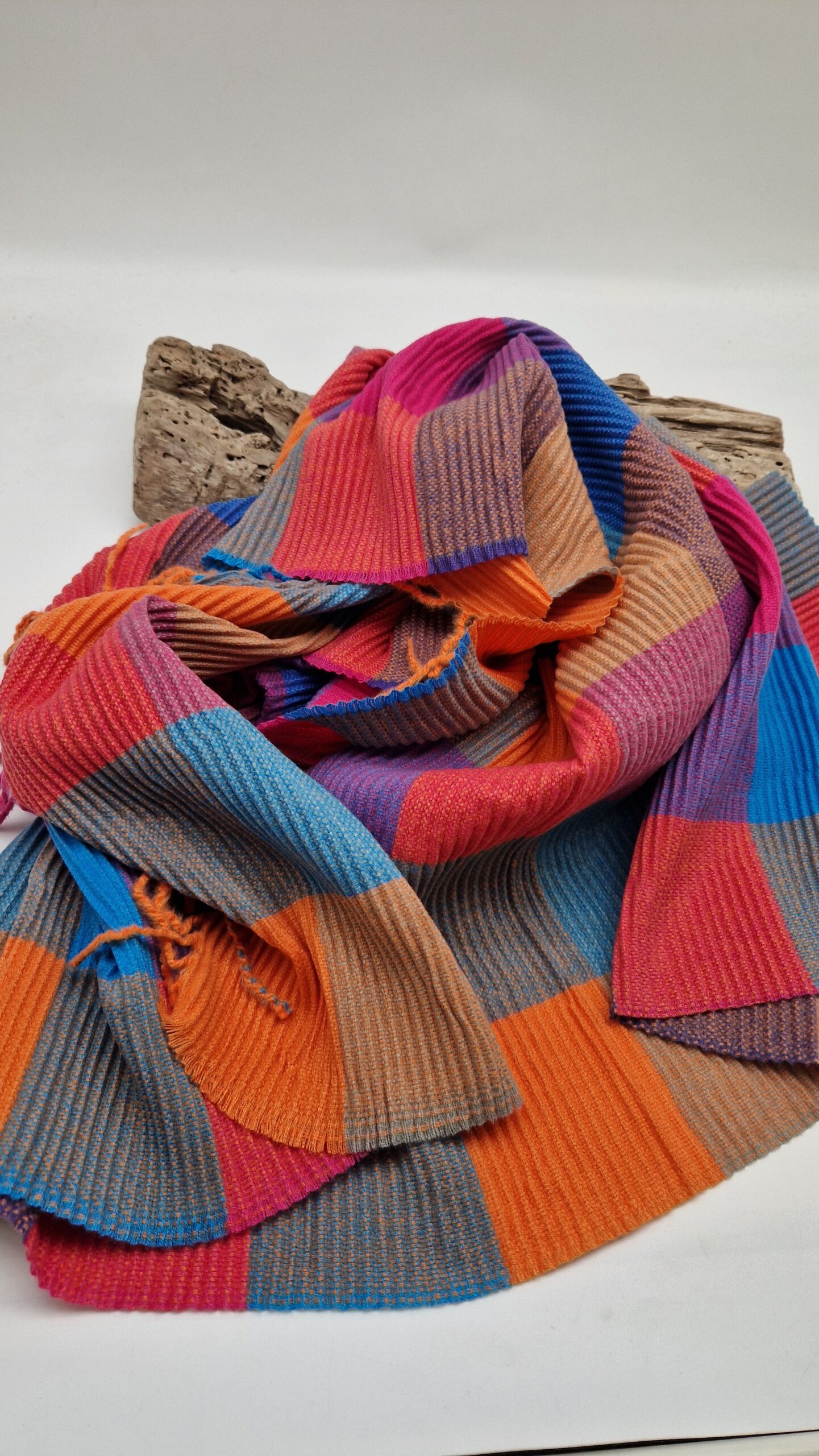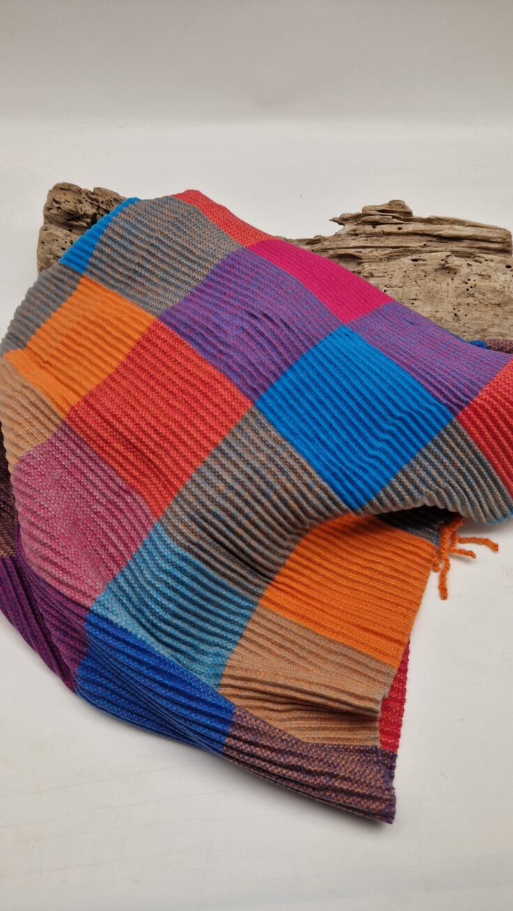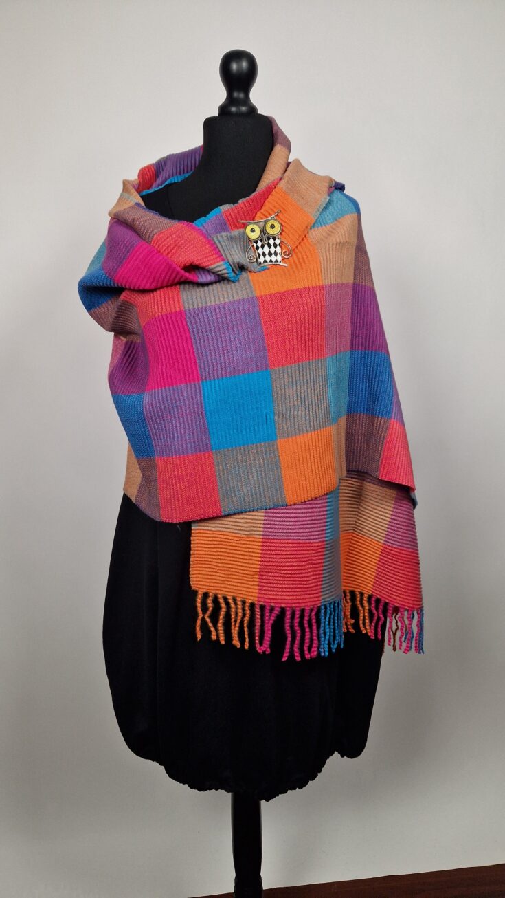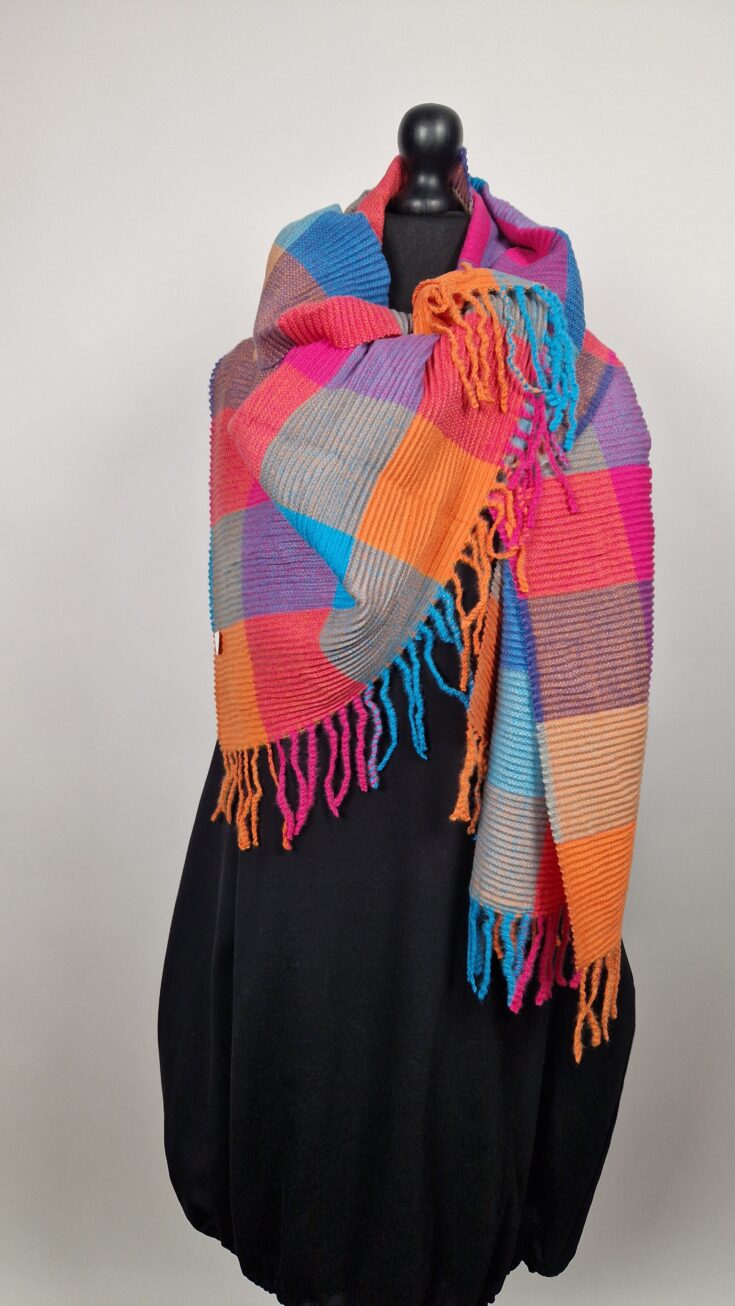 Bardzo duży, bardzo miękki, kolorowy, przepiękny, elegancki i zwariowany zarazem, ponadczasowy szal w kratę kolorze z frędzlami. Ciepły, miły i niegryzący. Piękny! Taki, którym możesz się zawinąć i otulić.