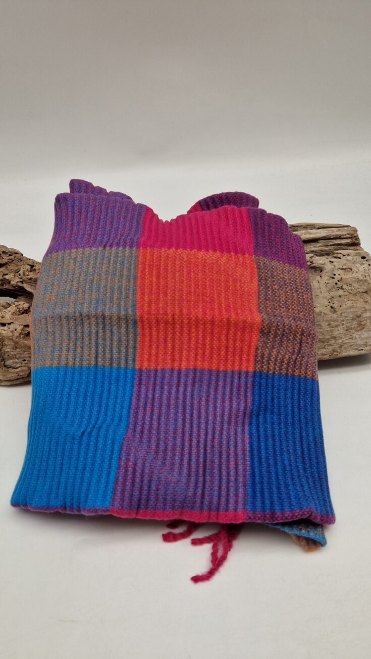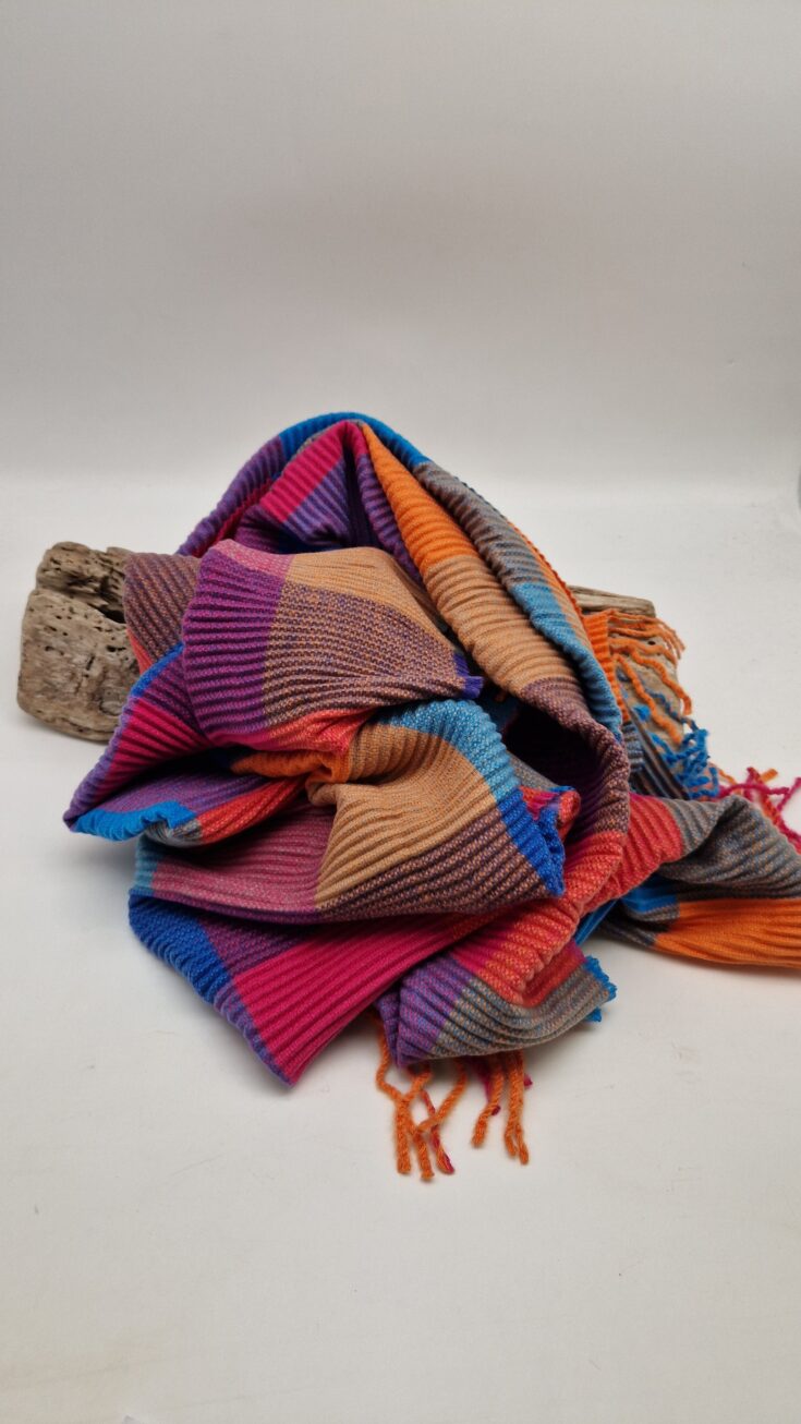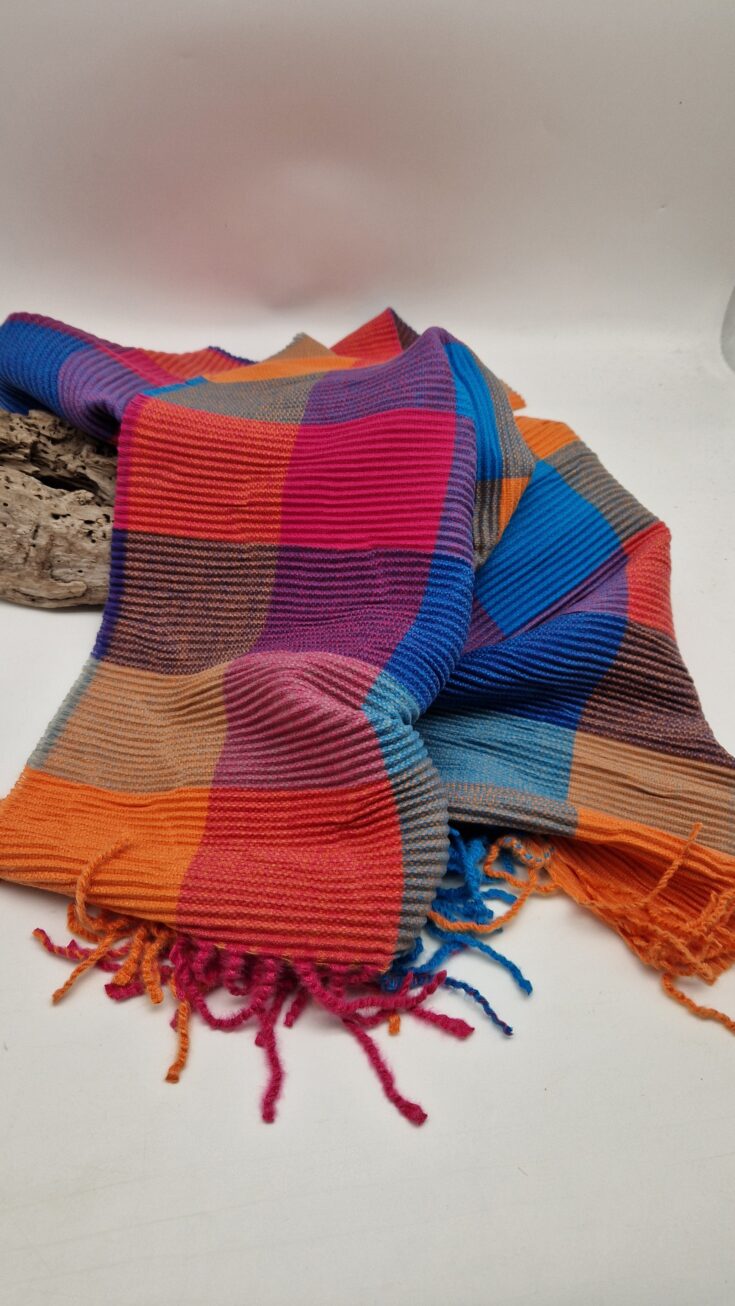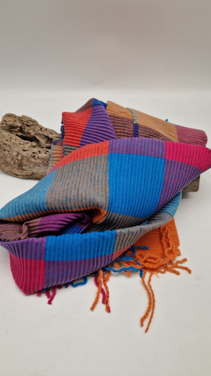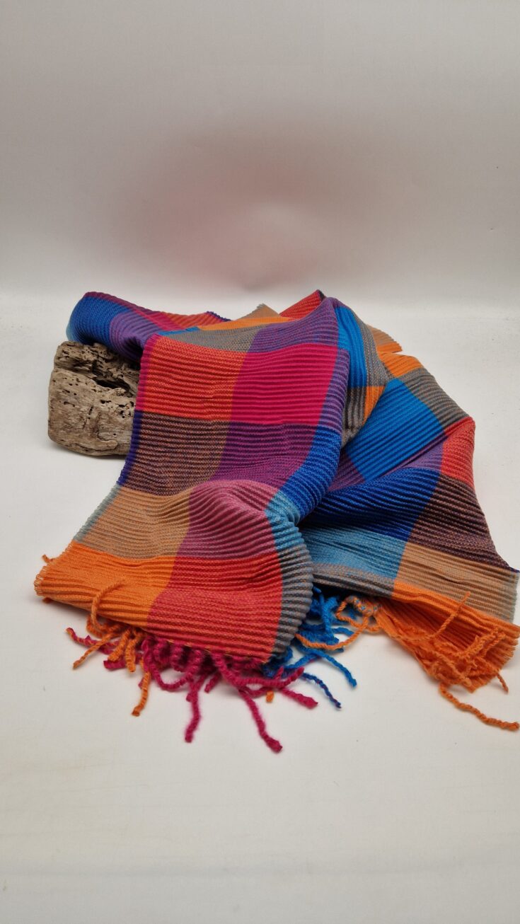 Bardzo duży, bardzo miękki, kolorowy, przepiękny, elegancki i zwariowany zarazem, ponadczasowy szal w kratę kolorze z frędzlami. Ciepły, miły i niegryzący. Piękny! Taki, którym możesz się zawinąć i otulić.