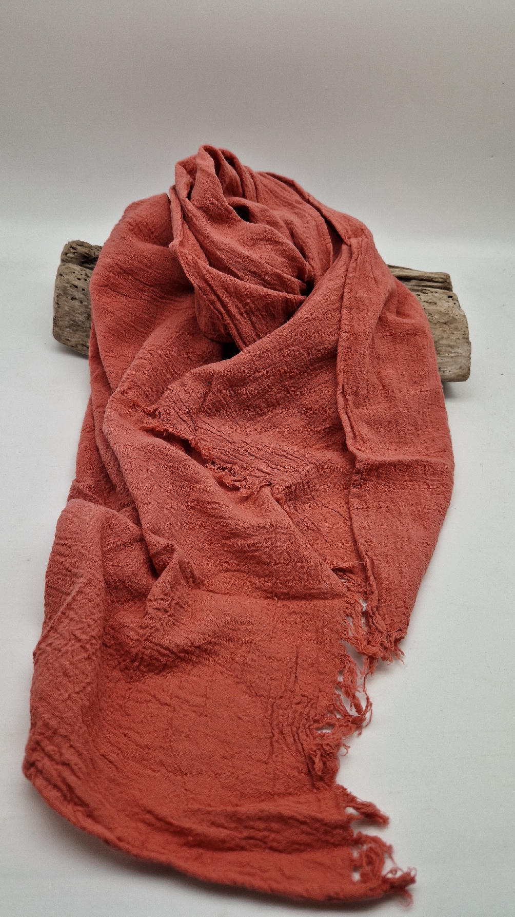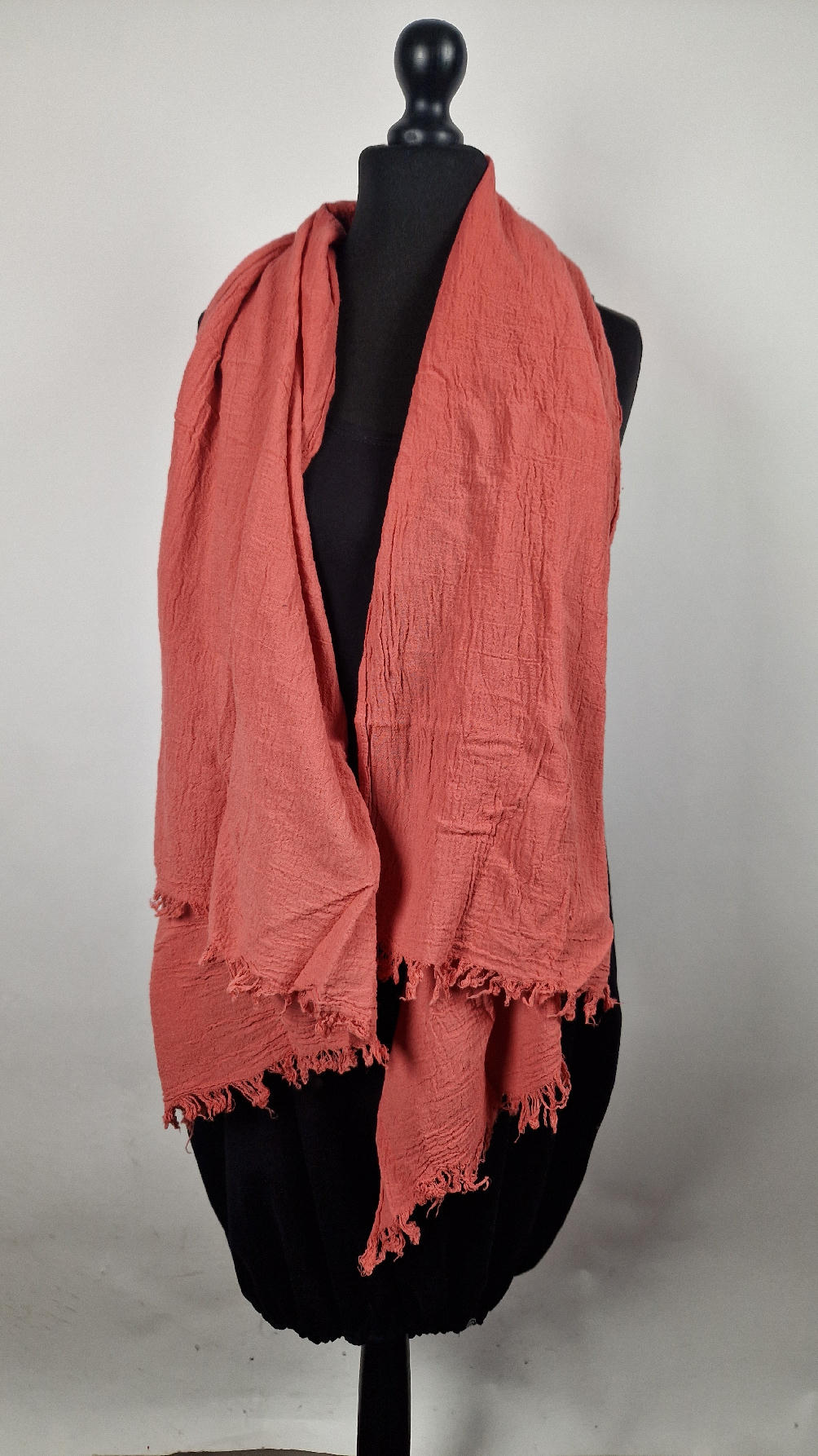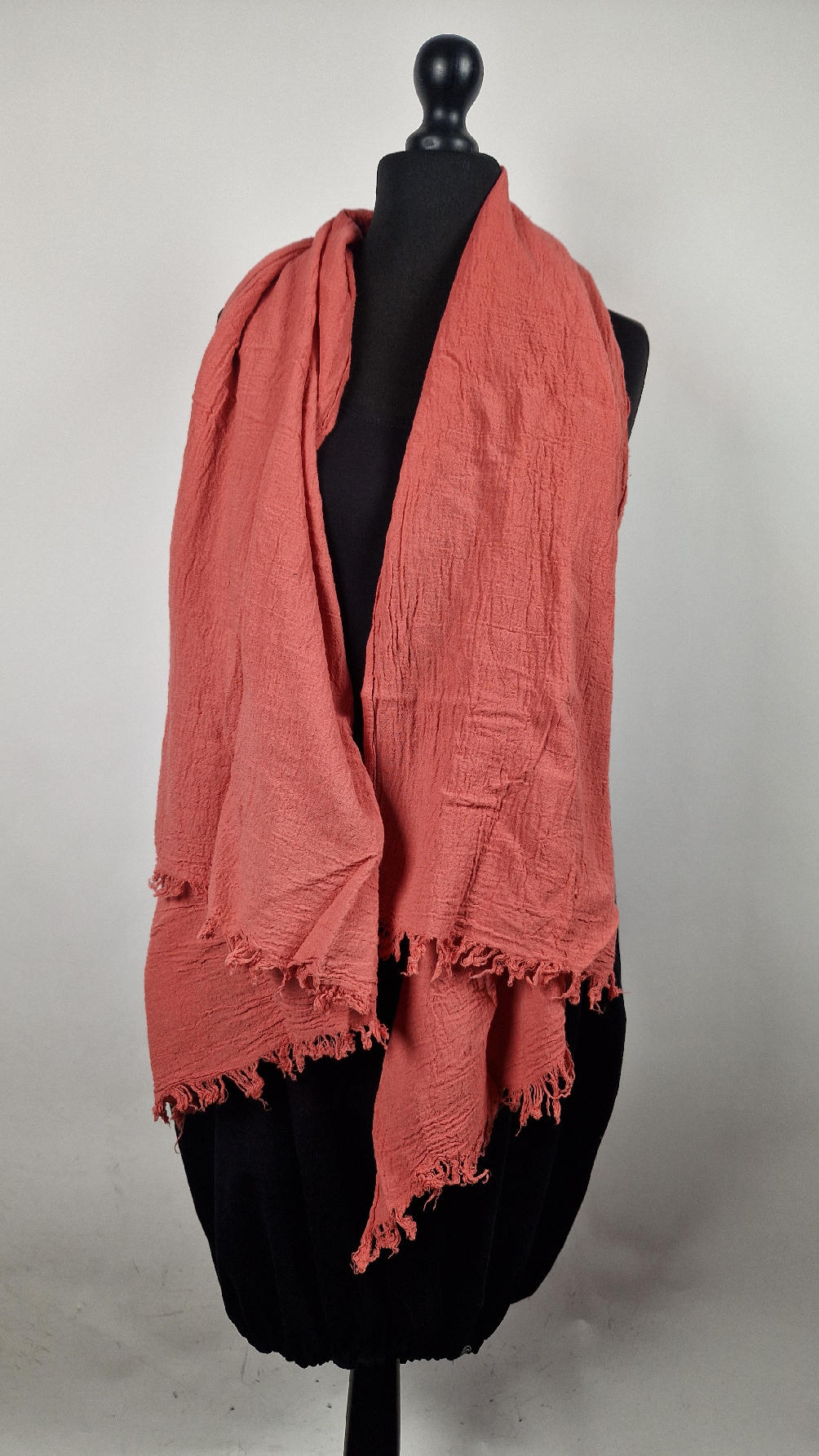 Duży, piękny szal z bawełny w kolorze pudrowych róż , robiony ręcznie, pognieciony i zwariowany , z frędzlami .