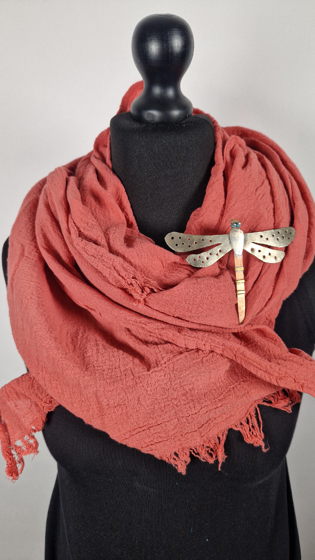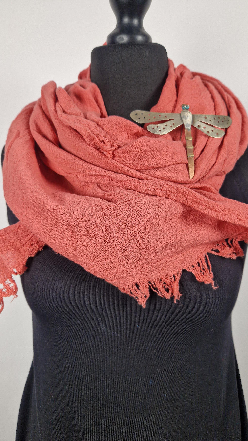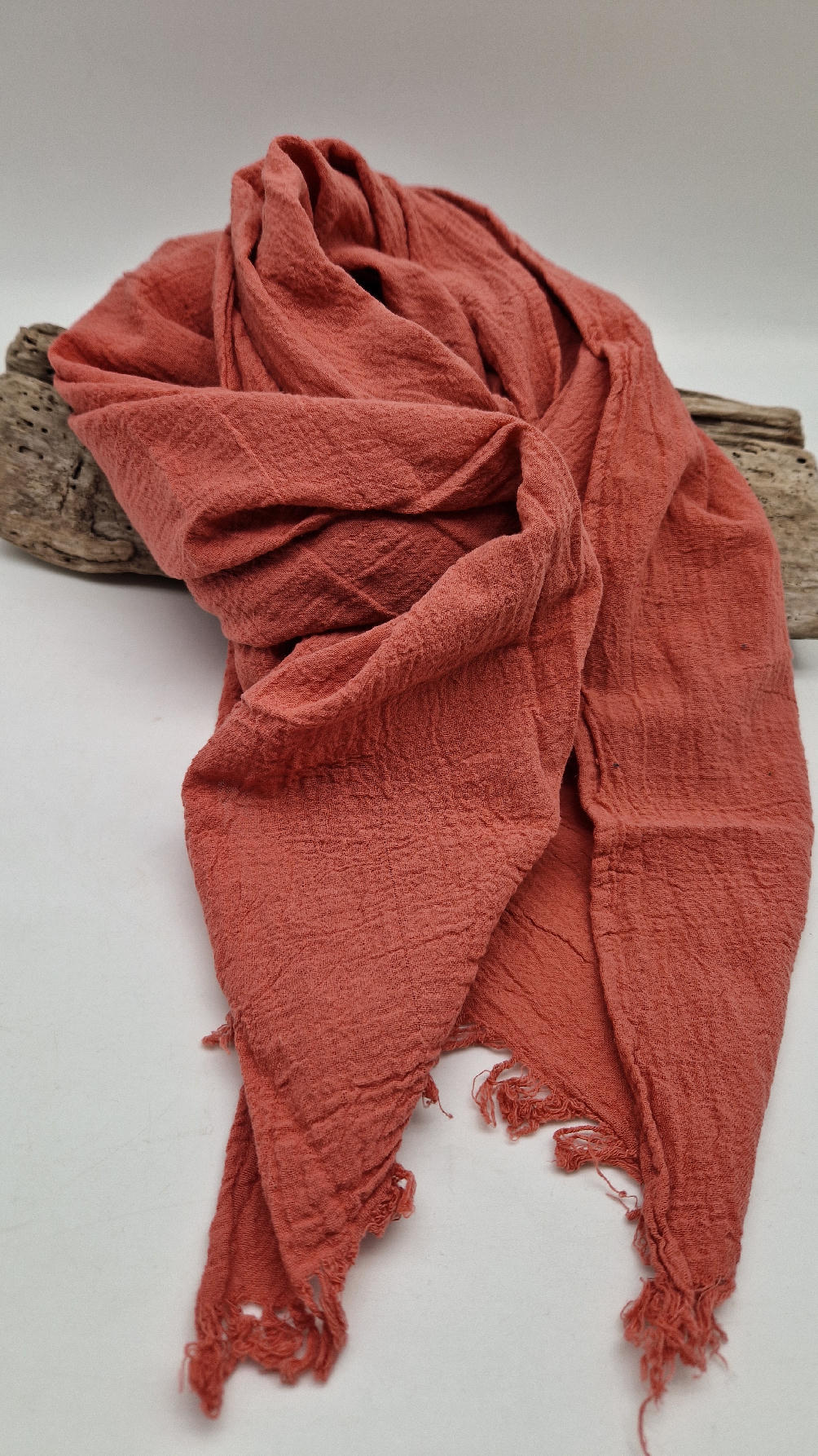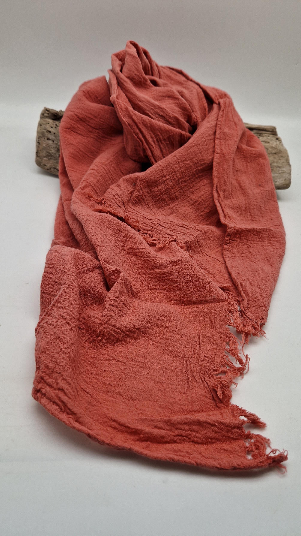 Duży, piękny szal z bawełny w kolorze pudrowych róż , robiony ręcznie, pognieciony i zwariowany , z frędzlami .