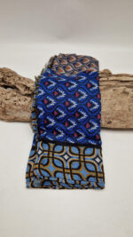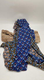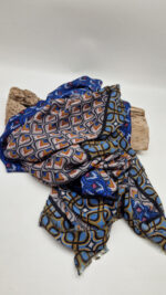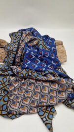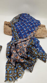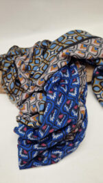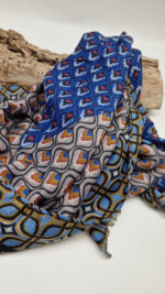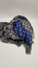 Duży, bardzo miękki, niebiesko-granatowo-miodowy elegancki szal we wzory. Szalik jest grubszy ciut, taki idealny do katany, czy otulaka . Świetnie zestawione kolory, energetyczne i eleganckie zarazem, z lekkim, takim jedwabistym połyskiem.