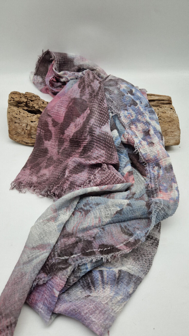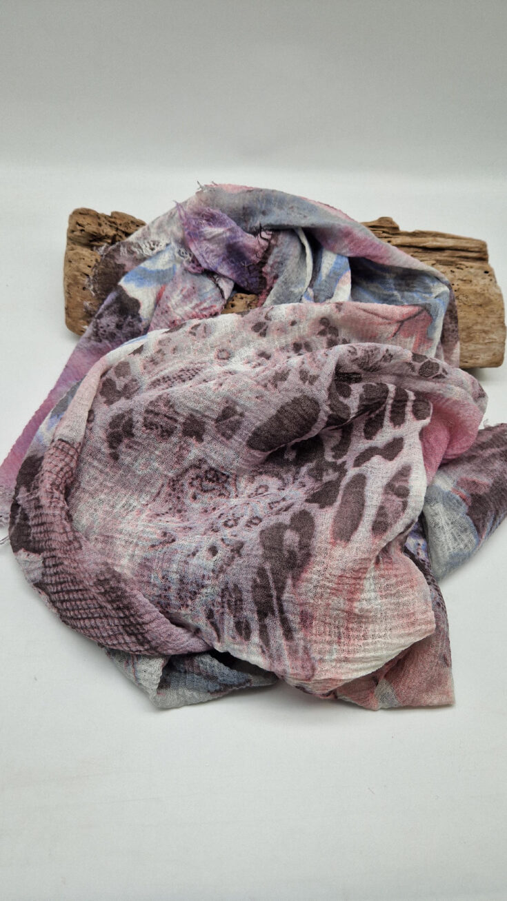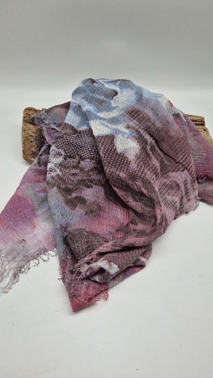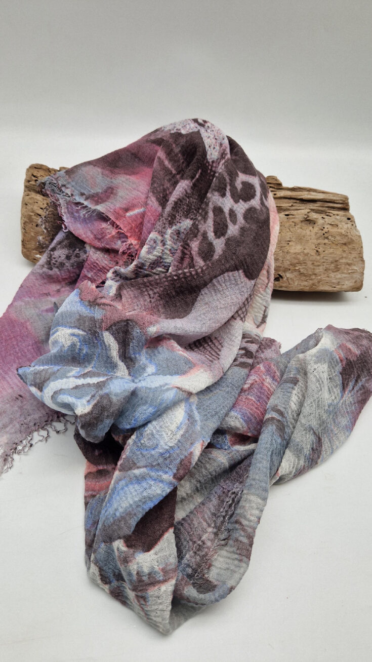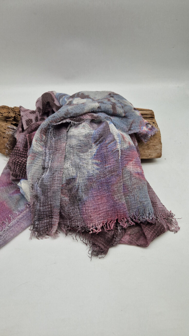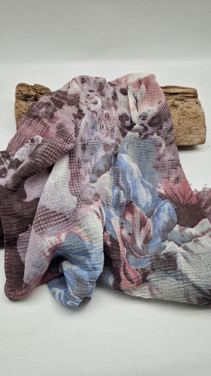 Bardzo duży,  miękki i szorstki równocześnie , taki jakby z tetry, fioletowo-niebiesko- szaro-różowy, taki zamglony i ulotny szal w delikatne wzory, takie zamglone, pudrowe kwiaty….śliczny, elegancki i artystyczny, pognieciony … cudownie otulający szal  . Świetnie zestawione kolory, lekko przytłumione, zamglone….