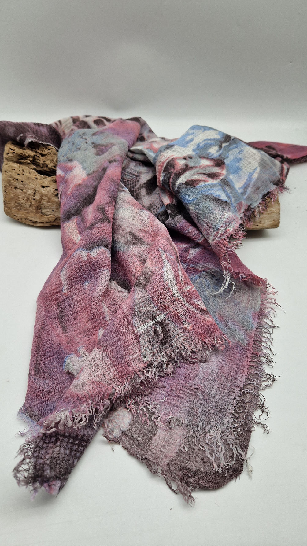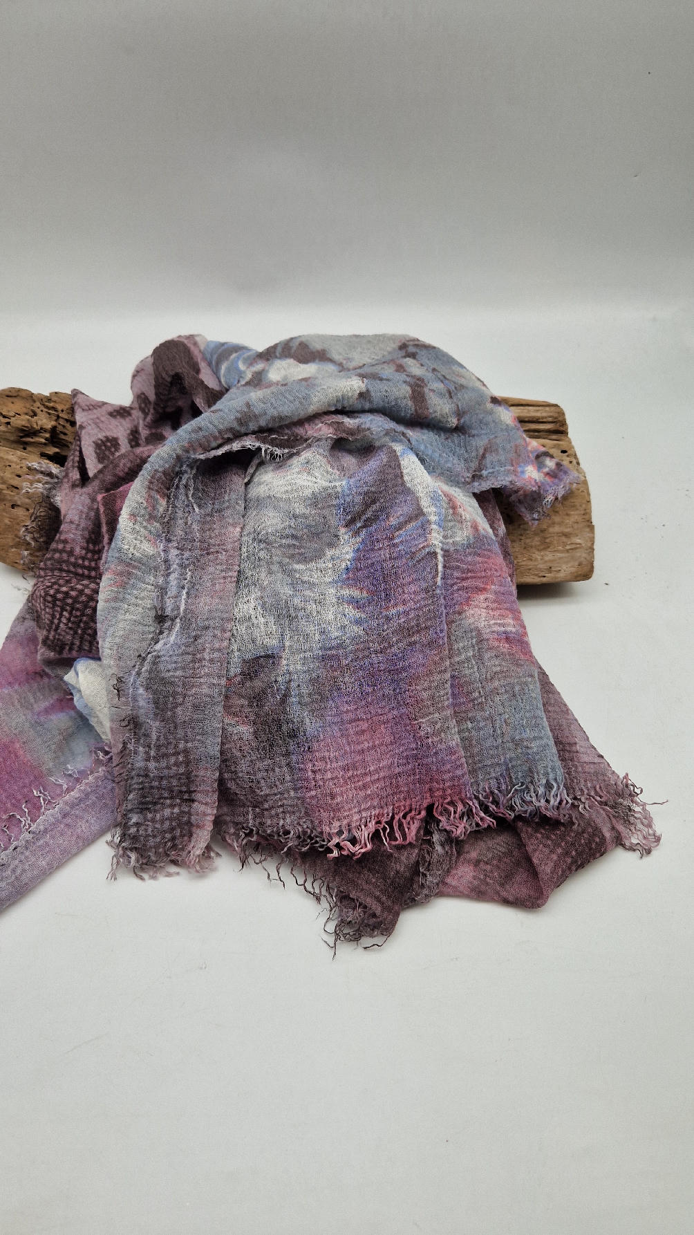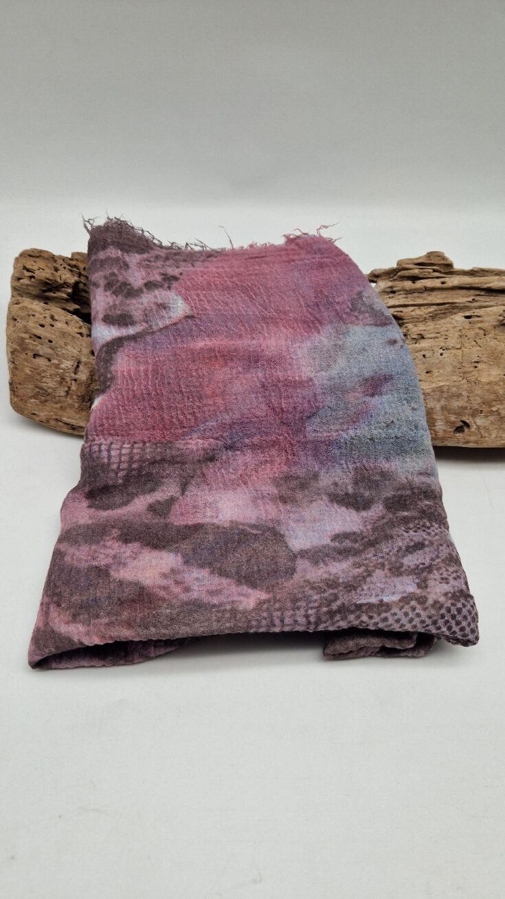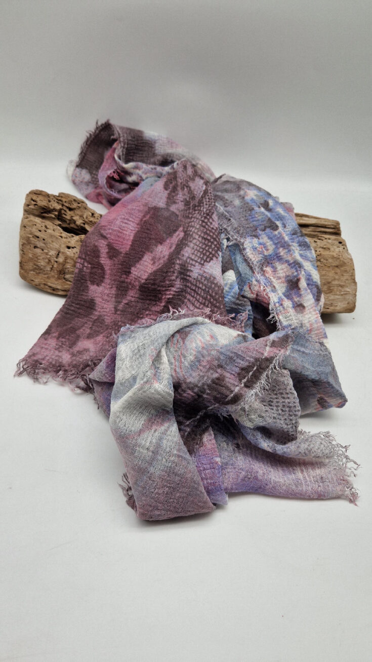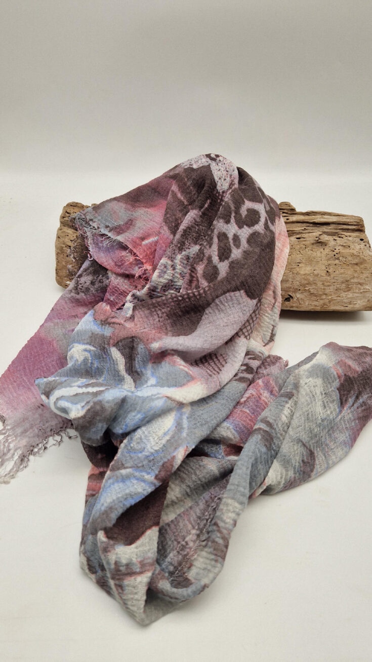Bardzo duży,  miękki i szorstki równocześnie , taki jakby z tetry, fioletowo-niebiesko- szaro-różowy, taki zamglony i ulotny szal w delikatne wzory, takie zamglone, pudrowe kwiaty….śliczny, elegancki i artystyczny, pognieciony … cudownie otulający szal  . Świetnie zestawione kolory, lekko przytłumione, zamglone….