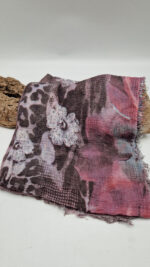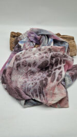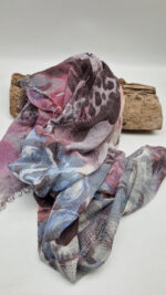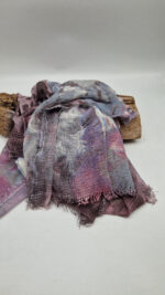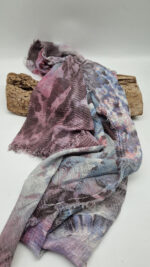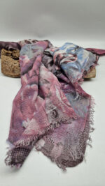 Bardzo duży, miękki i szorstki równocześnie , taki jakby z tetry, fioletowo-niebiesko- szaro-różowy, taki zamglony i ulotny szal w delikatne wzory, takie zamglone, pudrowe kwiaty….śliczny, elegancki i artystyczny, pognieciony … cudownie otulający szal . Świetnie zestawione kolory, lekko przytłumione, zamglone….