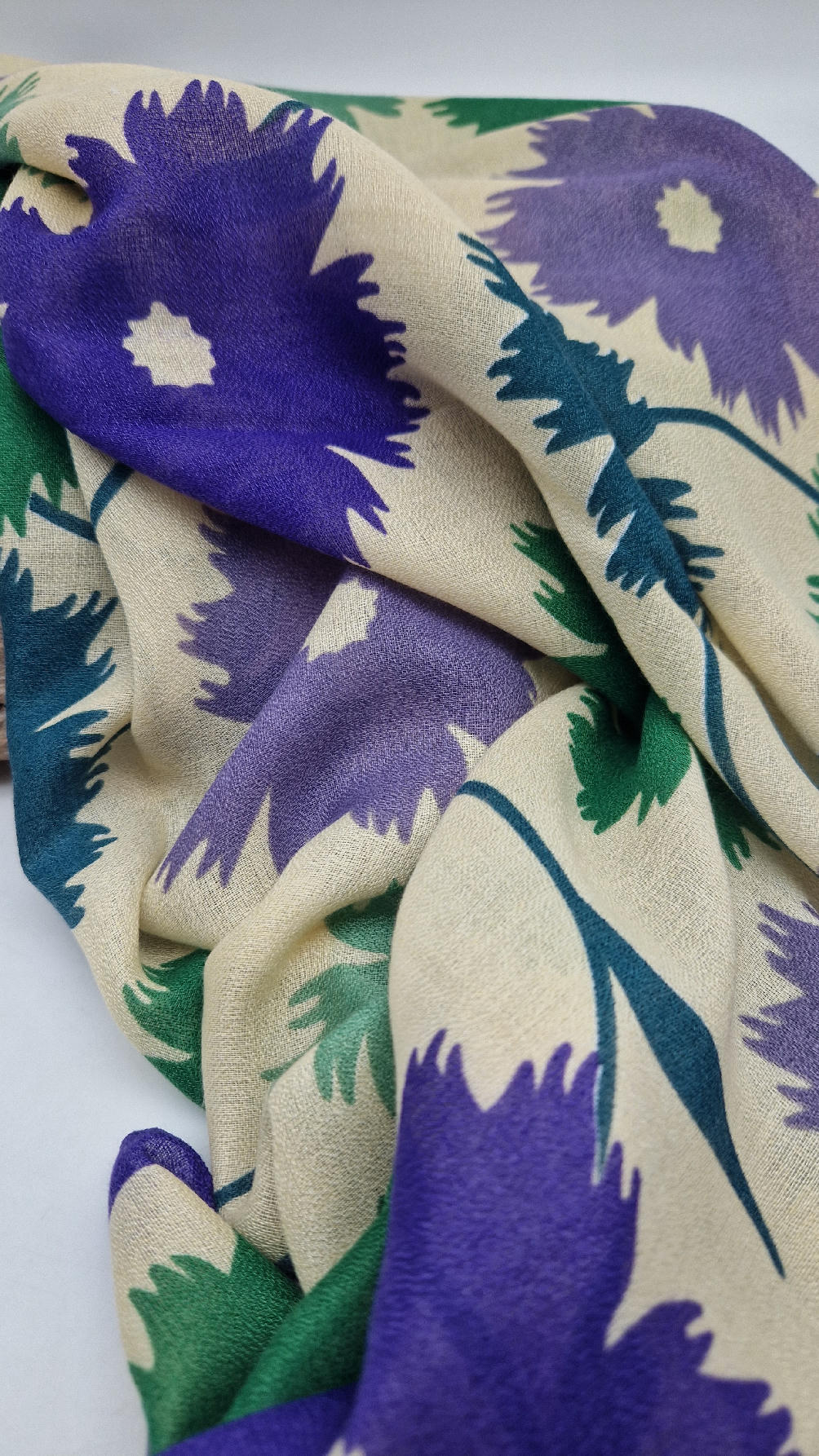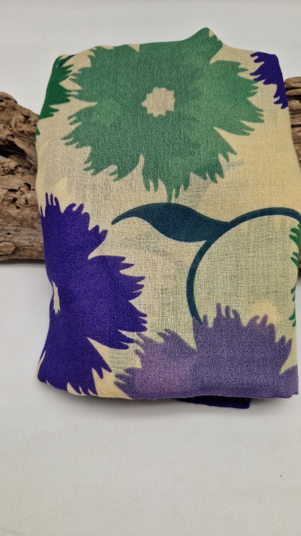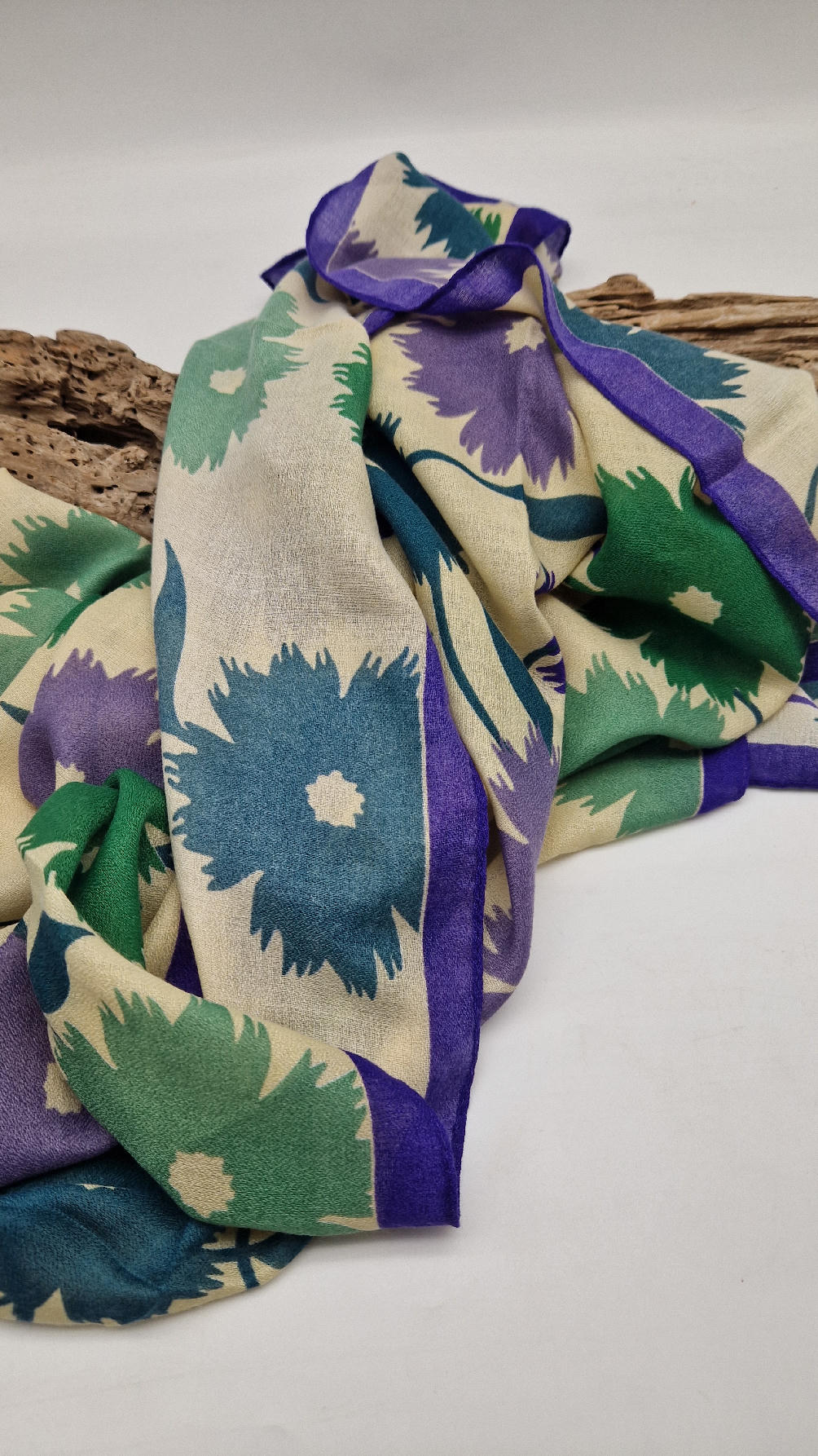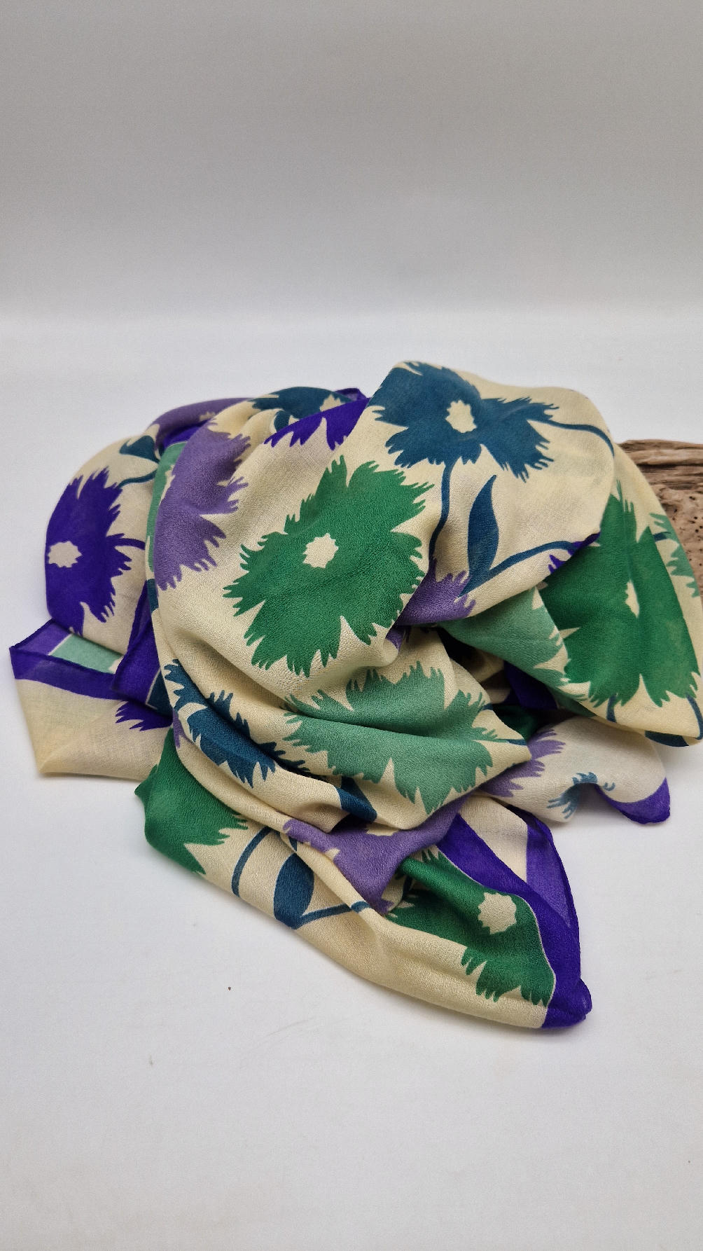 Duży, miękki, elegancki i uroczy szal w duże kwiaty. Kremowo-zielono-fioletowo-turkusowe.