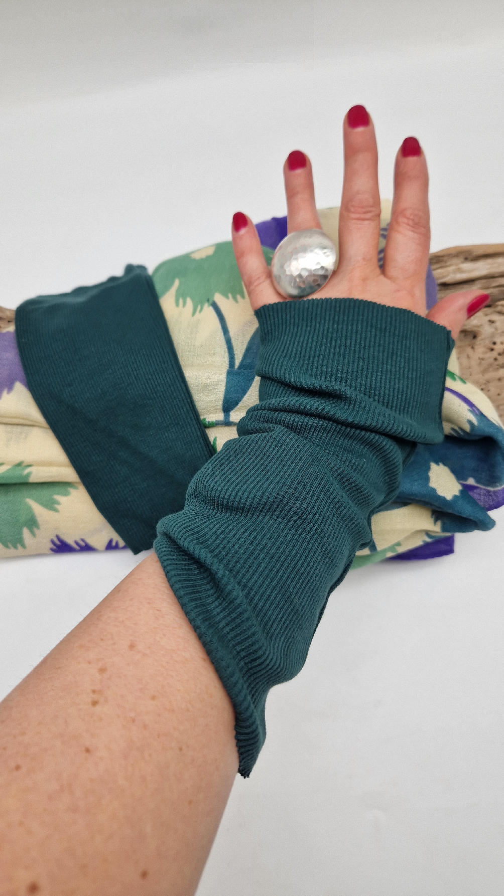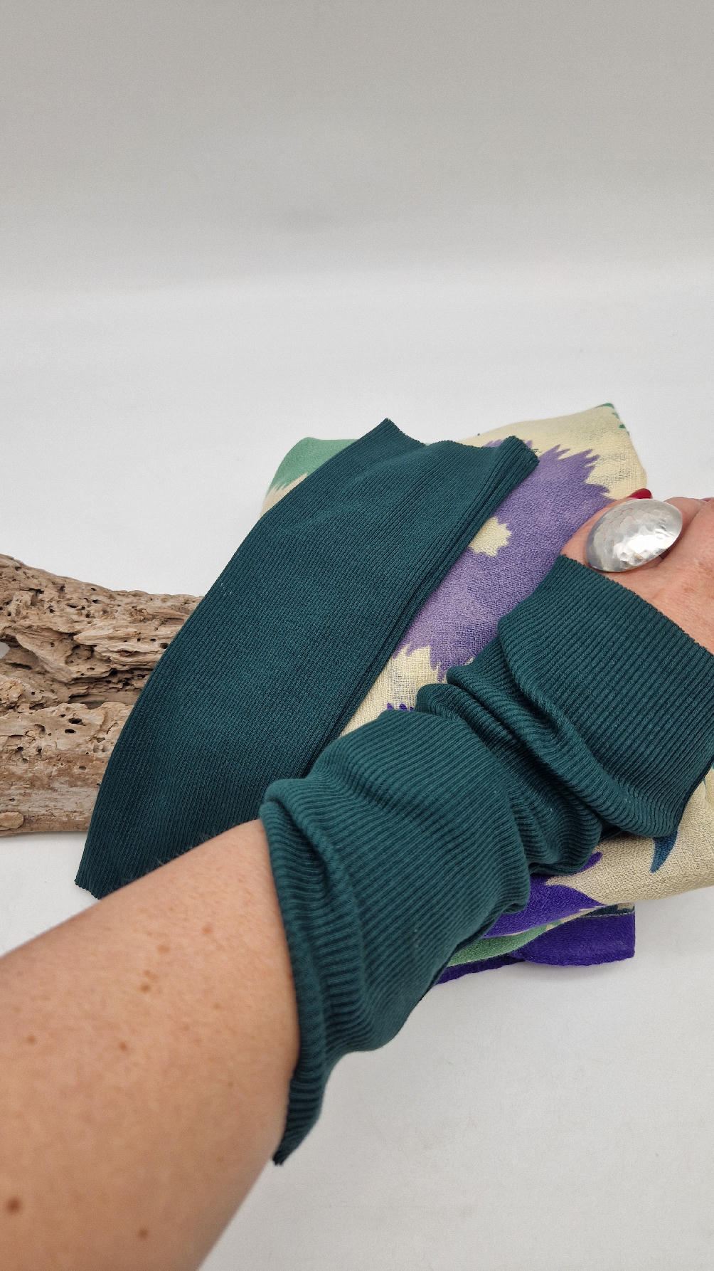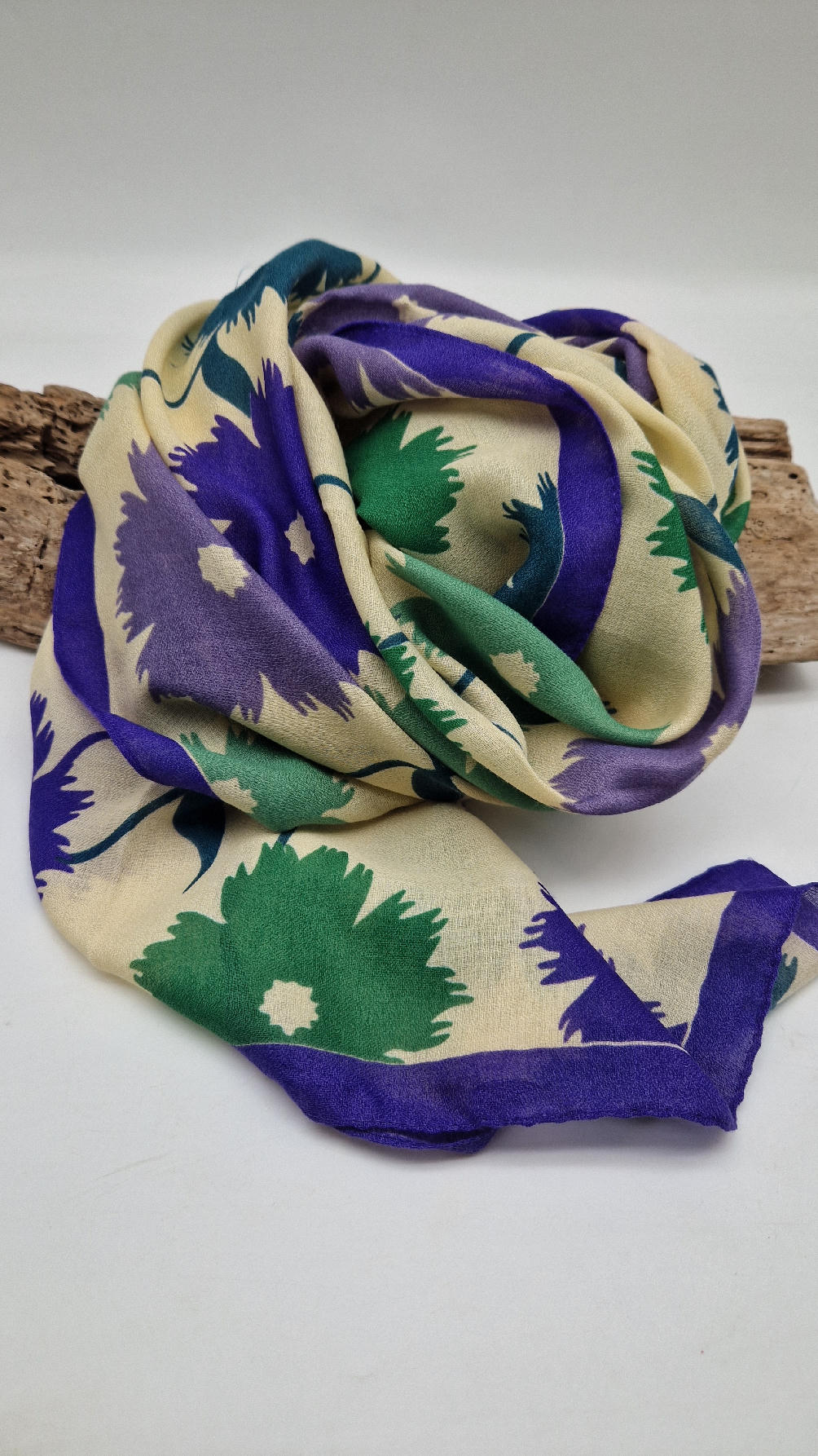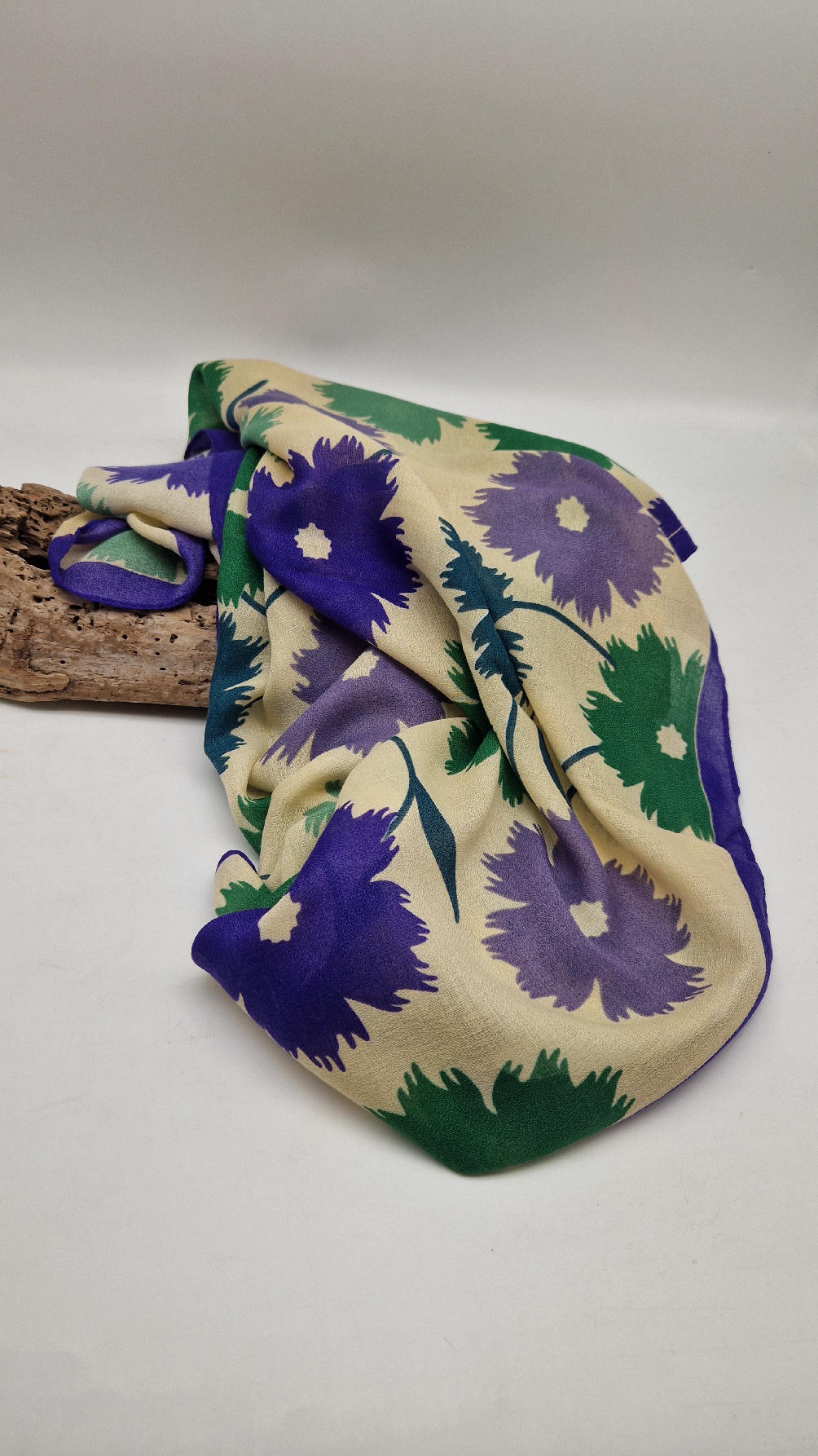 Duży, miękki, elegancki i uroczy szal w duże kwiaty. Kremowo-zielono-fioletowo-turkusowe.