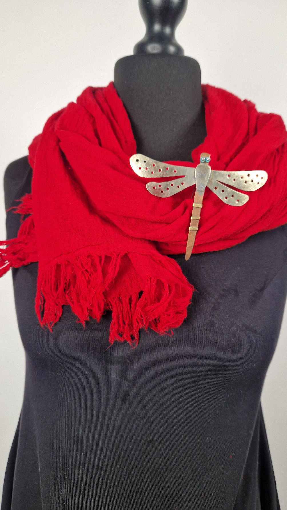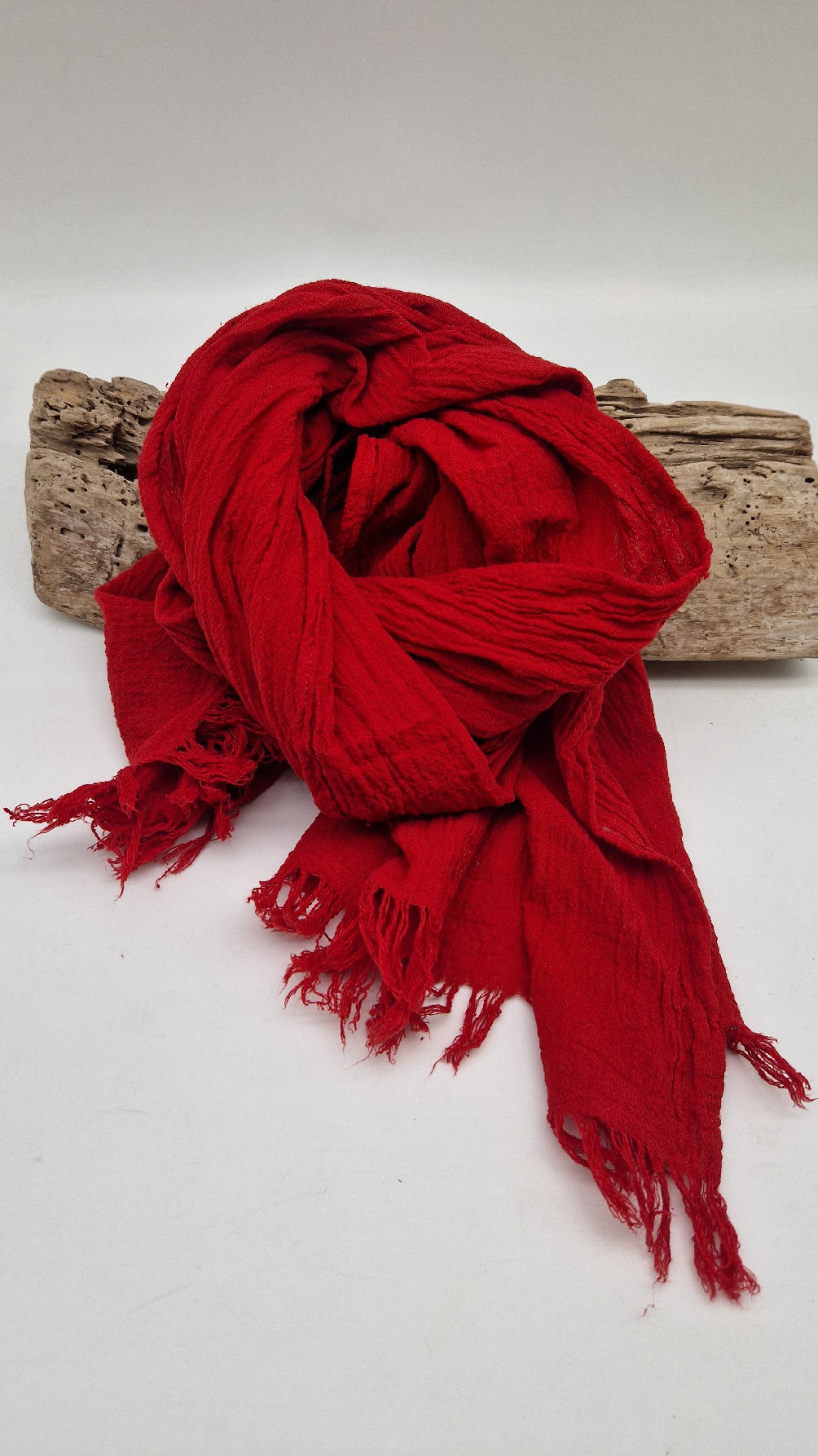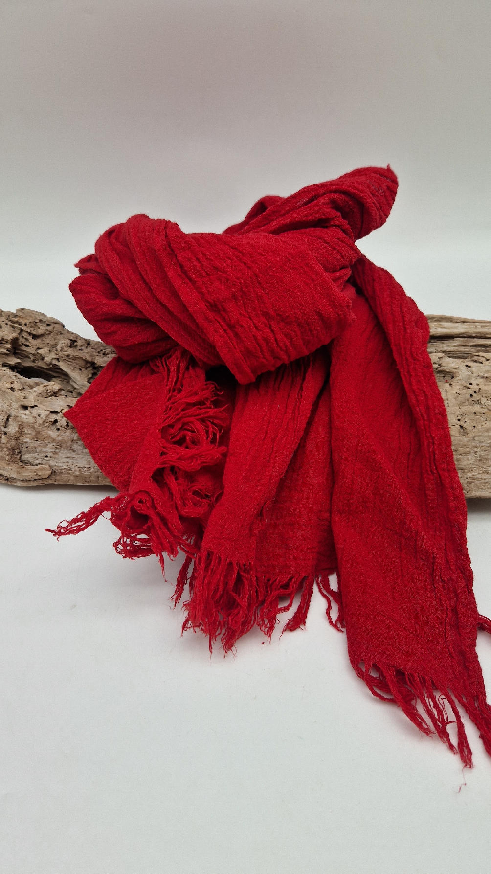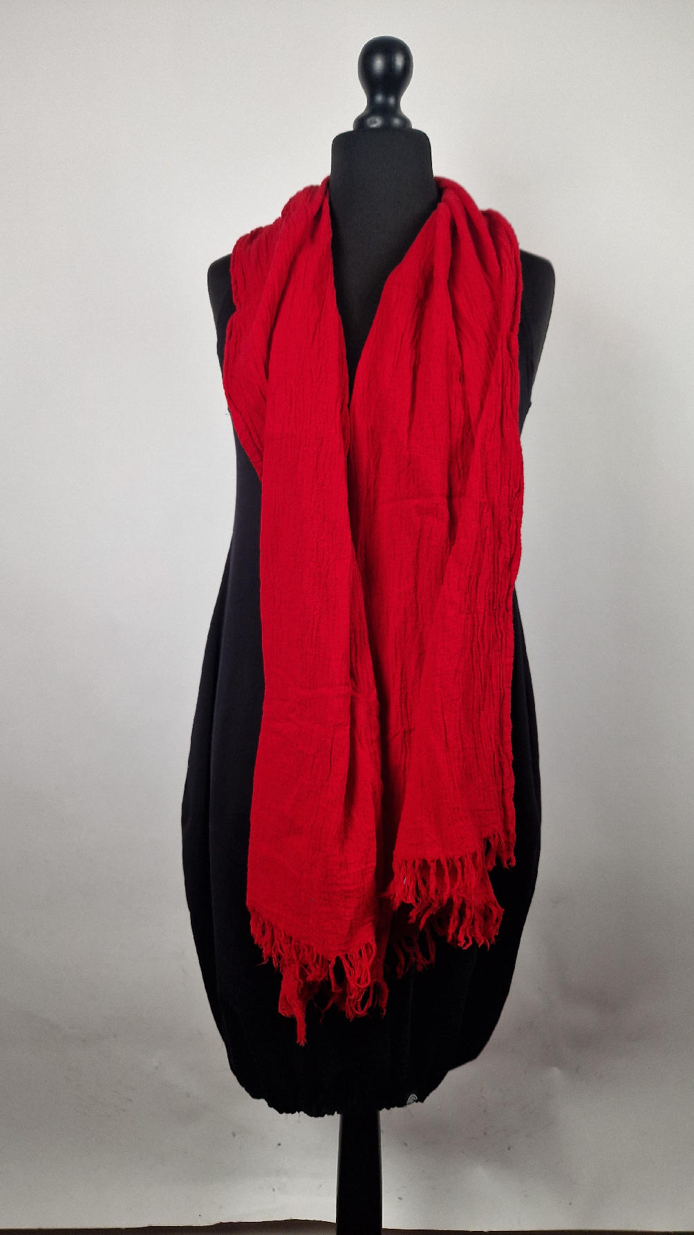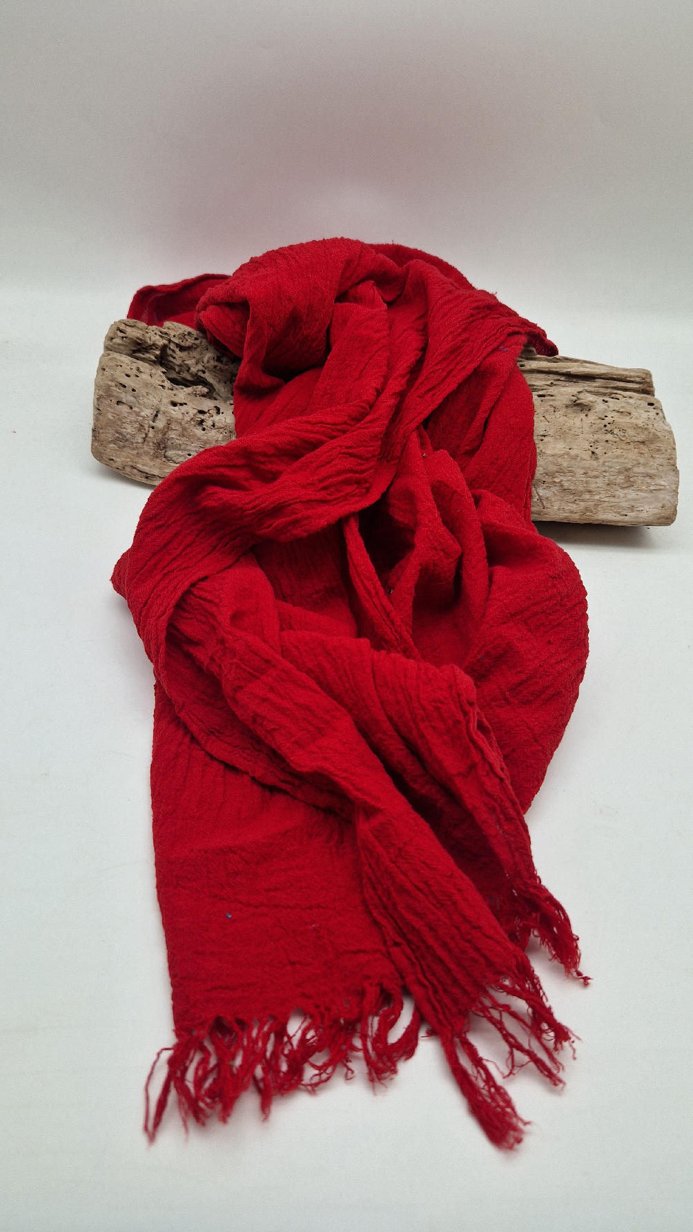 Duży, piękny szal z bawełny w bardzo głębokim kolorze, kwintesencja czerwoności, z natury pognieciony i zwariowany , z frędzlami .