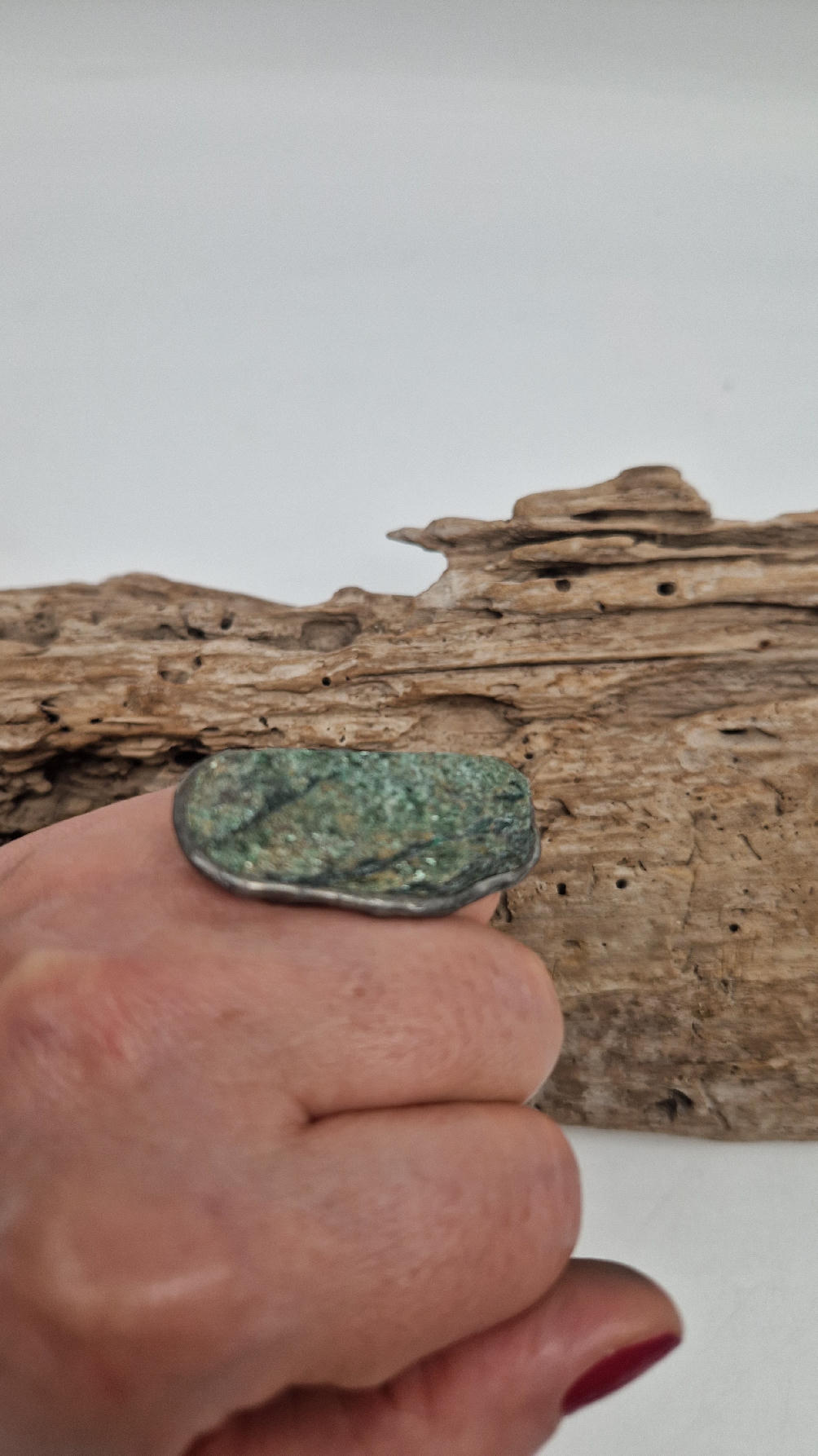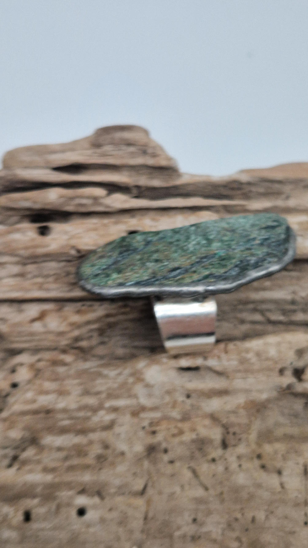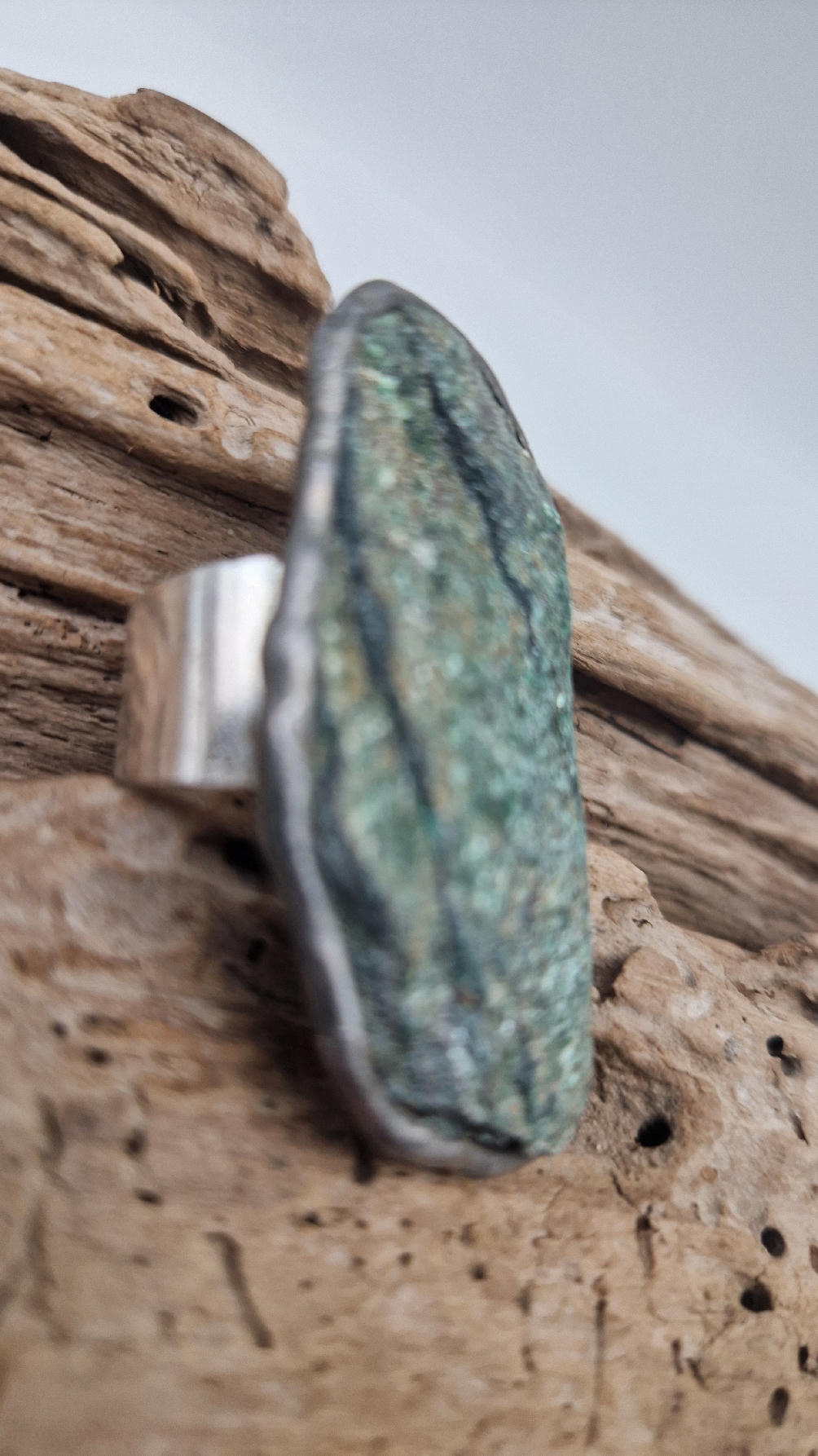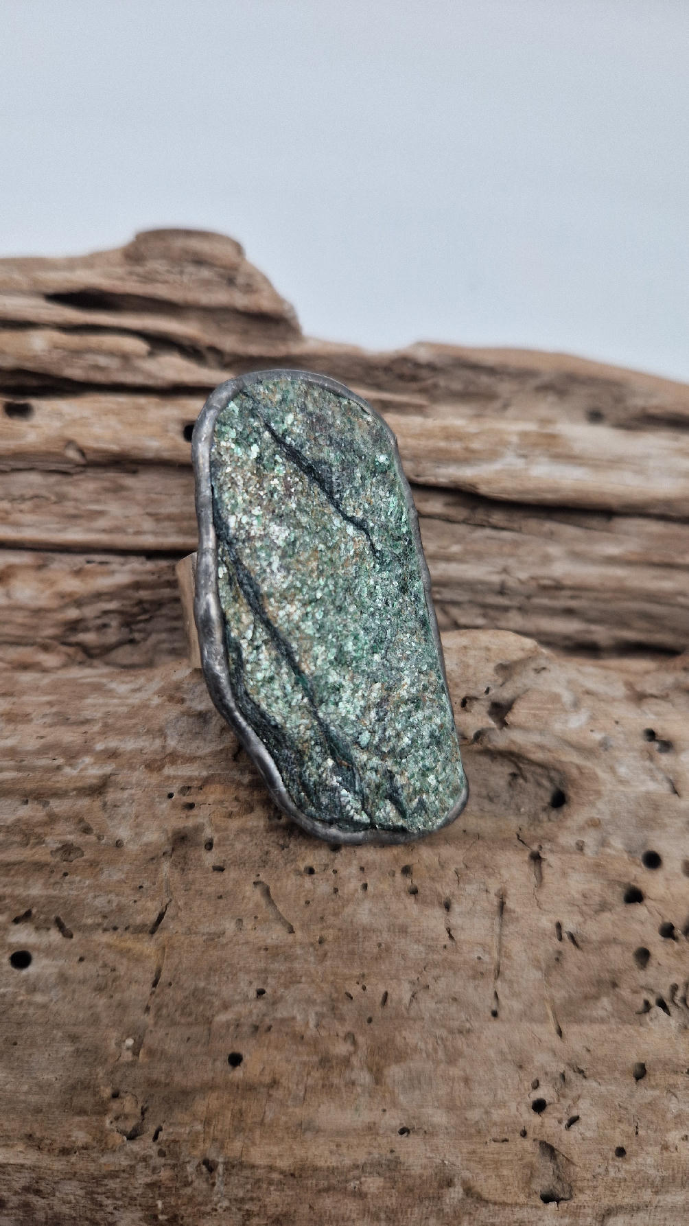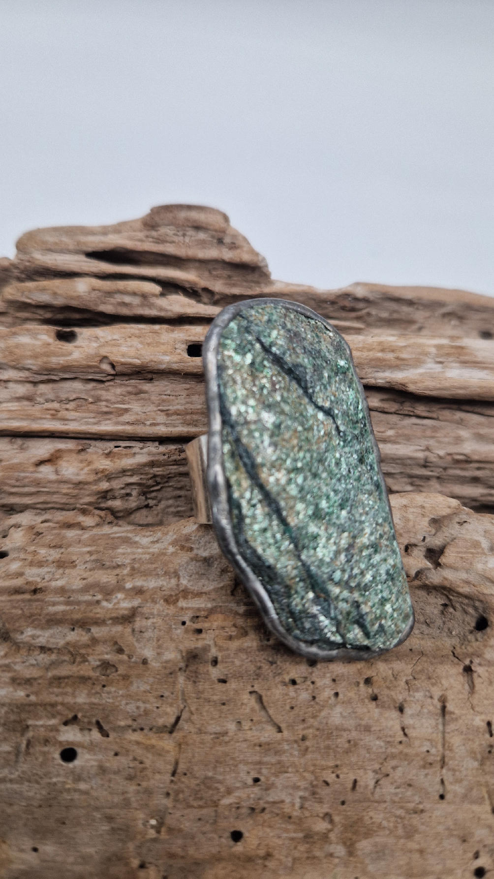 Niezwykle piękny, duży, długi pierścionek, którego oczkiem jest piękny zielon0 – niebieski, błyszczący, jakby brokatowy, ale bardzo ładny i elegancki…FUKSYT , oprawiony w kutą i patynowaną i srebrzoną miedź. Piękna metaloplastyka z pięknym kamieniem . Pierścionek ma regulowaną obrączkę, więc pasuje na każdy palec…ale możesz powiesić go na łańcuszku lub rzemieniu, jeśli nie lubisz pierścionków, a podoba Ci się forma i kamień…