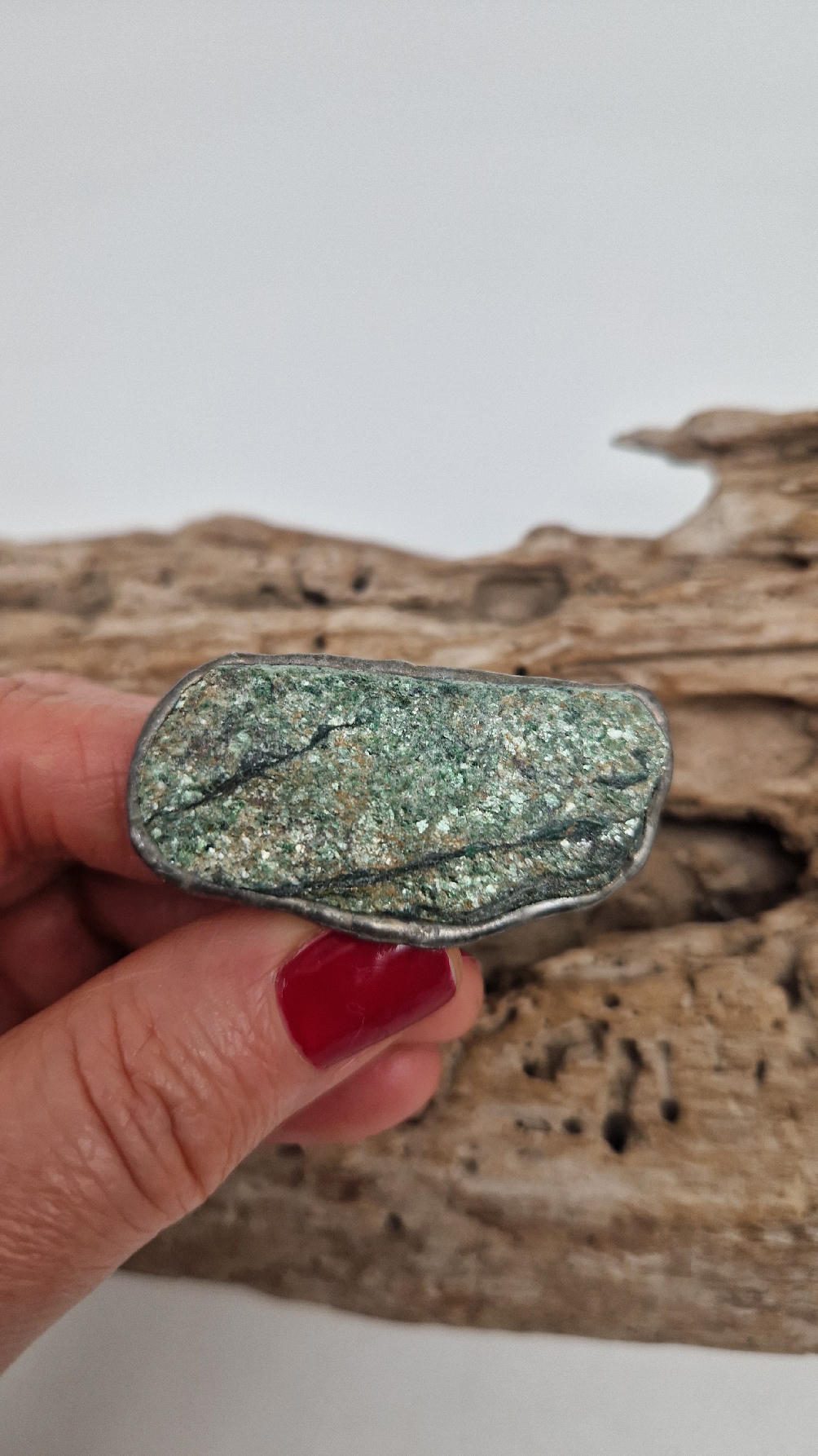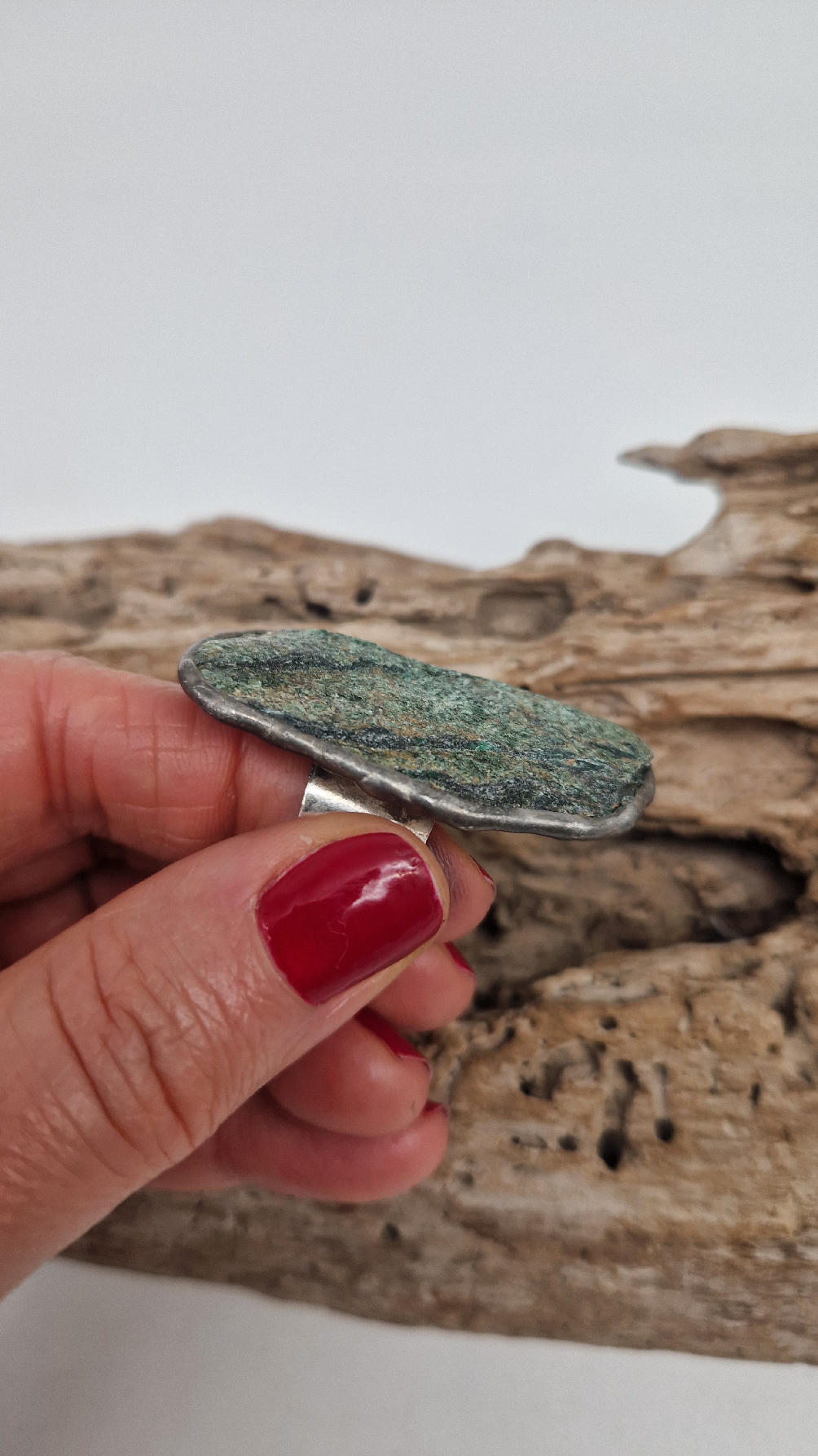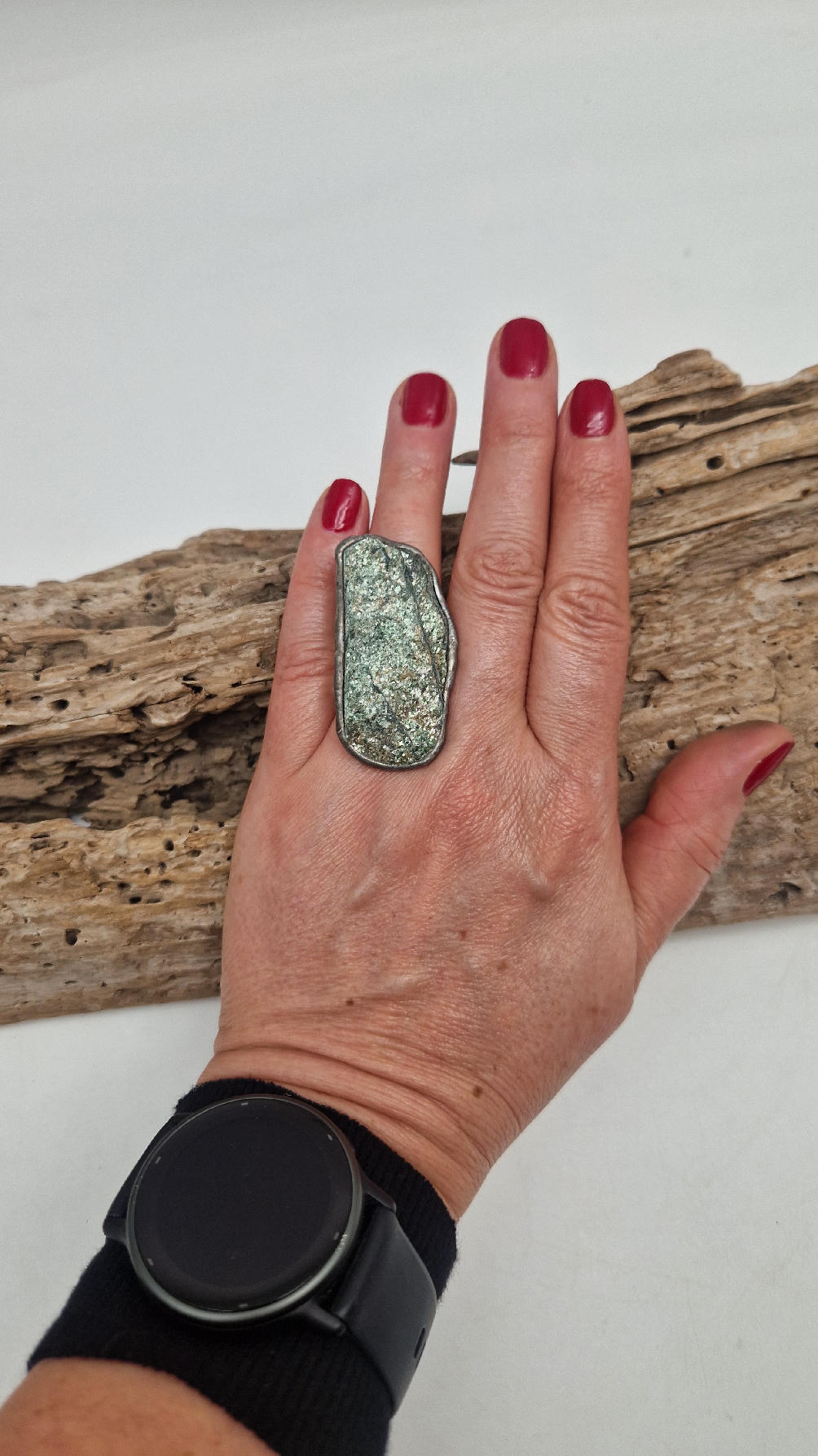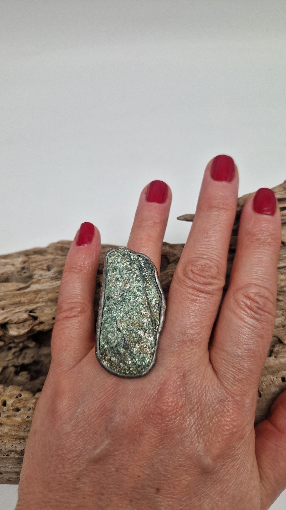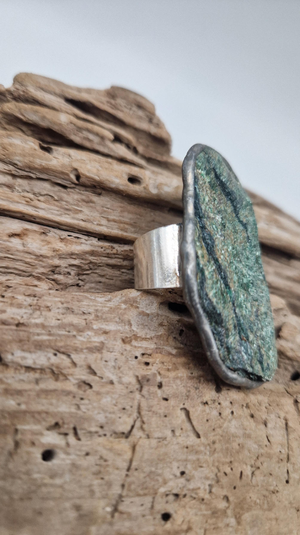 Niezwykle piękny, duży, długi pierścionek, którego oczkiem jest piękny zielon0 – niebieski, błyszczący, jakby brokatowy, ale bardzo ładny i elegancki…FUKSYT , oprawiony w kutą i patynowaną i srebrzoną miedź. Piękna metaloplastyka z pięknym kamieniem . Pierścionek ma regulowaną obrączkę, więc pasuje na każdy palec…ale możesz powiesić go na łańcuszku lub rzemieniu, jeśli nie lubisz pierścionków, a podoba Ci się forma i kamień…