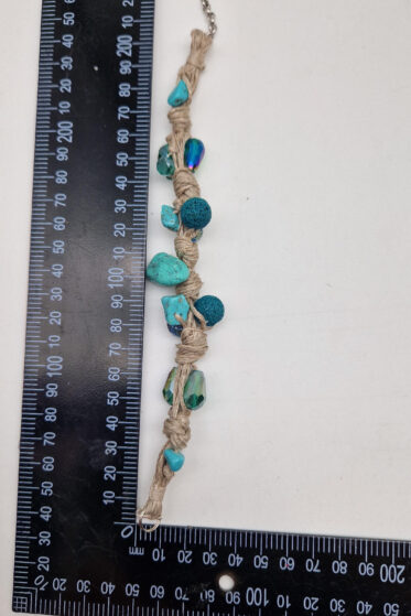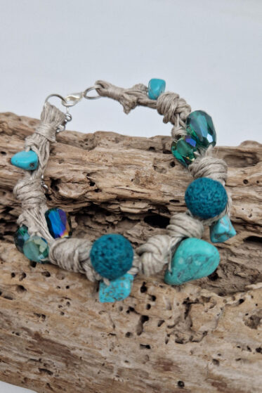 Piękna turkusowa bransoletka z turkusowych koralików i lawy w kolorze blu na naturalnym , lnianym sznurku