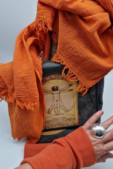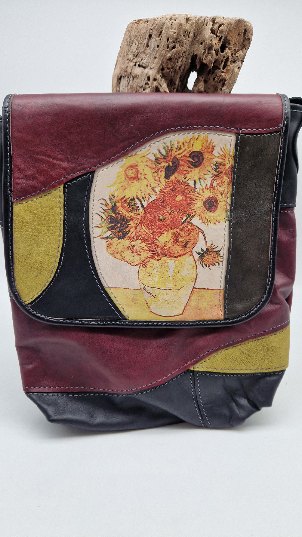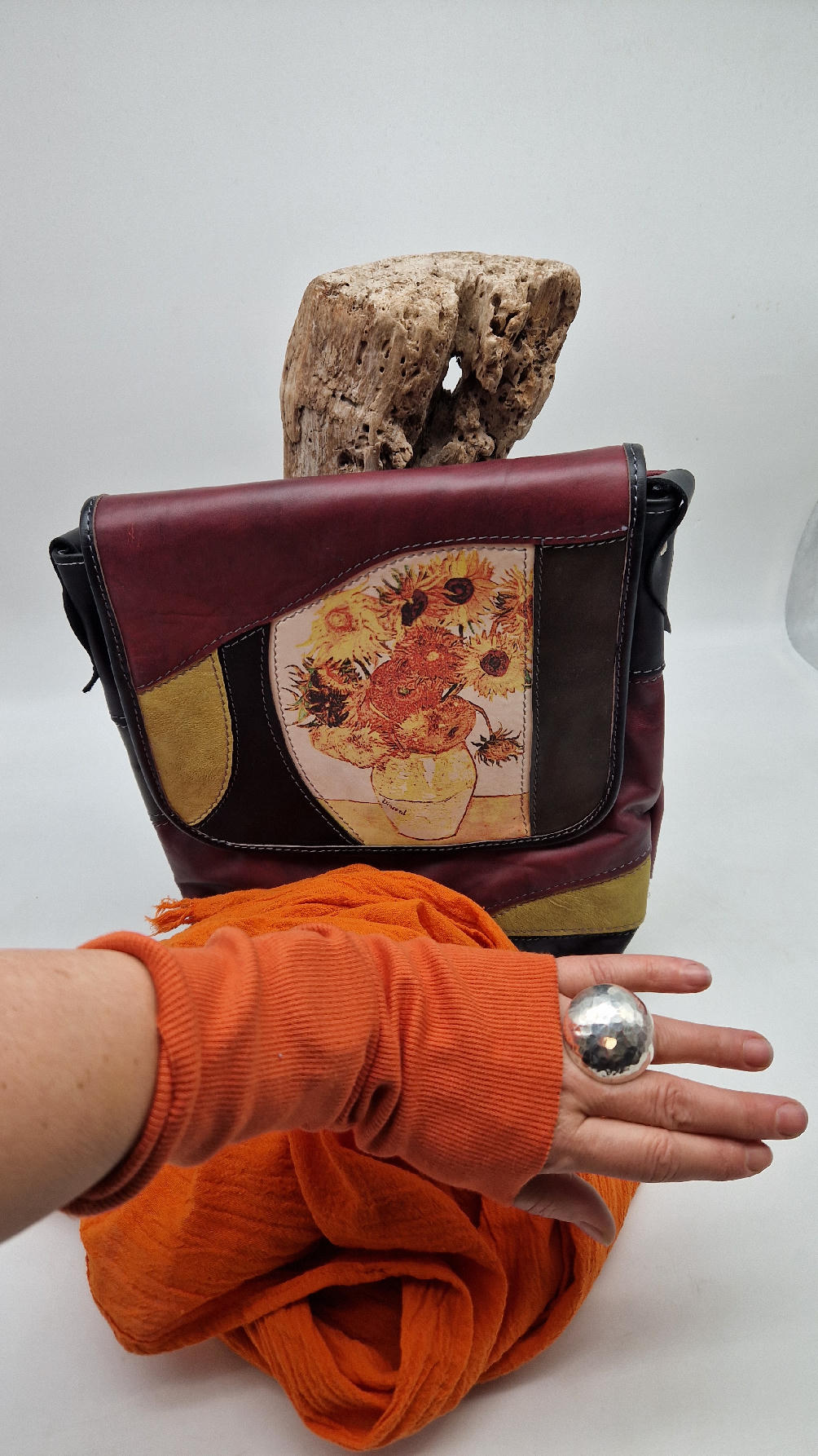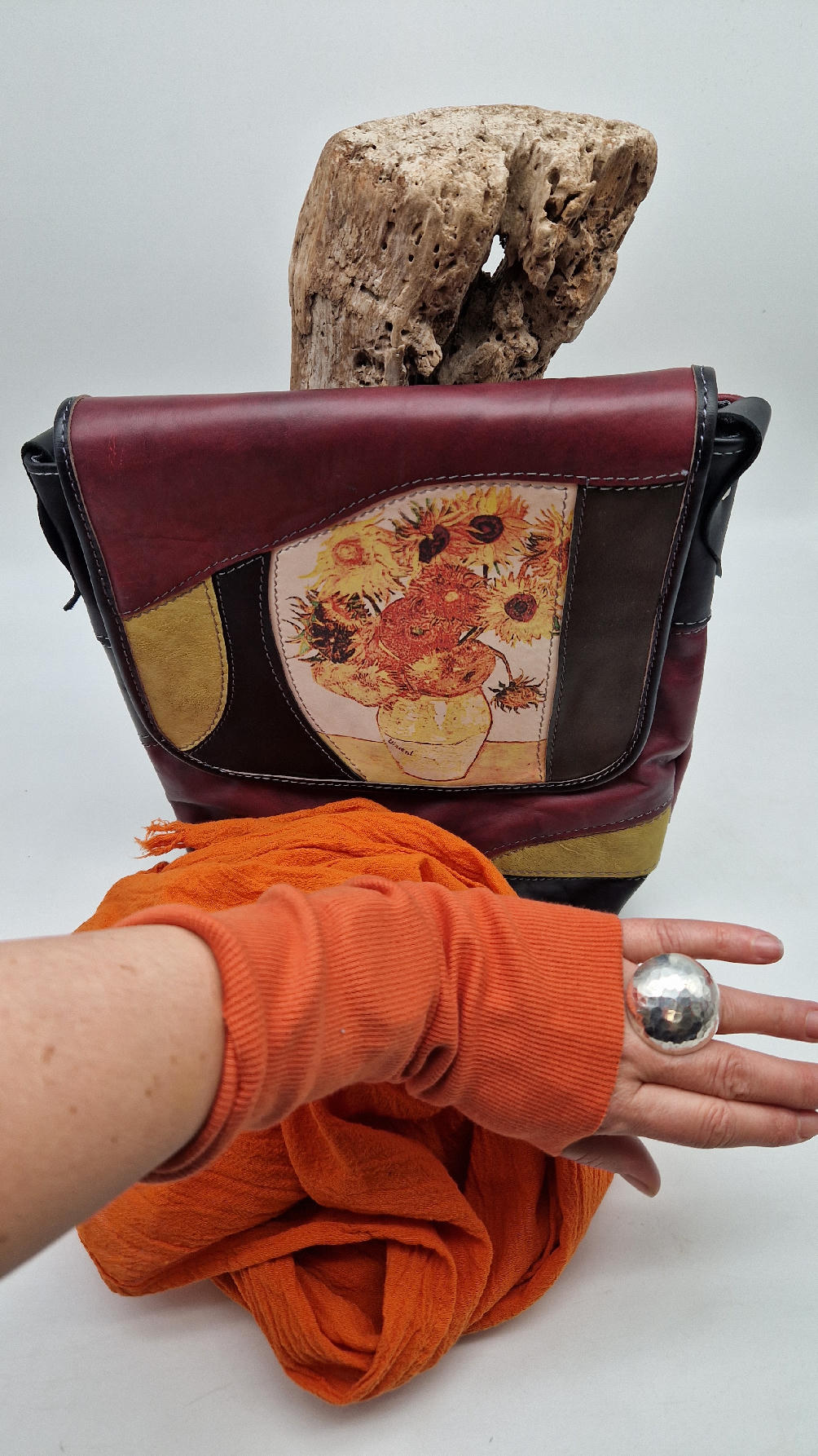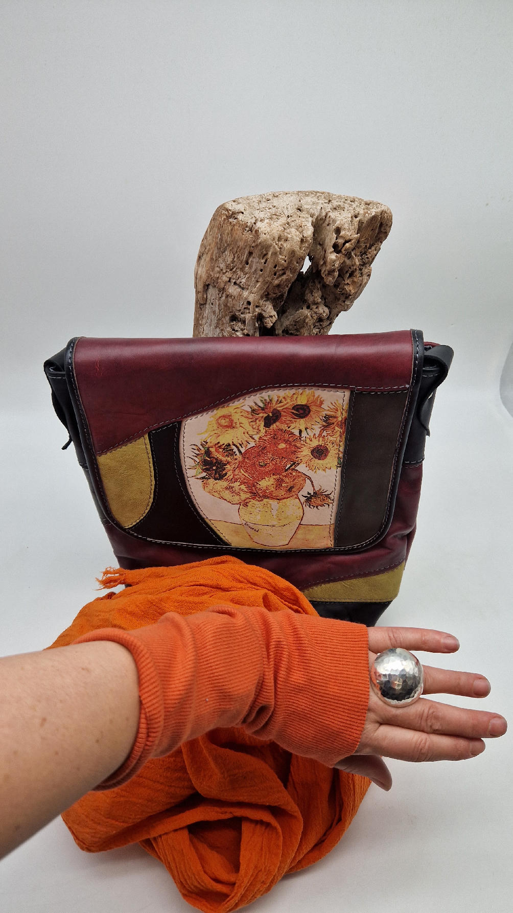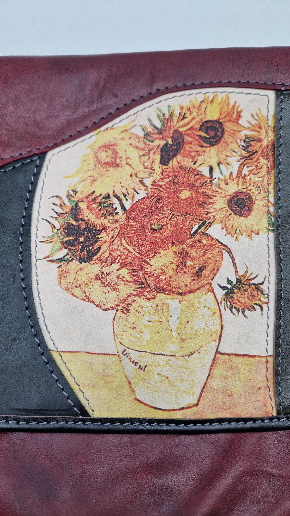 Słoneczniki Van Gogha, najbardziej znany obraz, możesz mieć tylko dla siebie…Czarno-żółt0-brązowa torba ze skóry, do której świetnie pasuje twój pomarańczowy szalik….