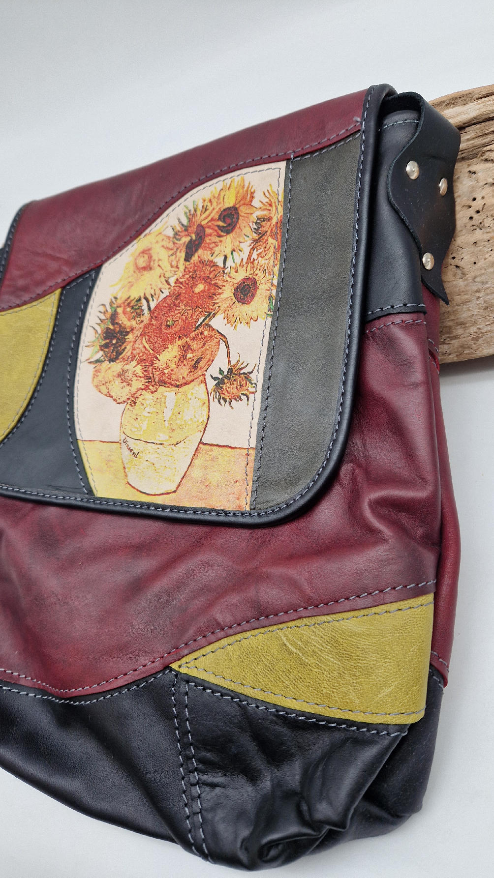 Torba wykonana z miękkiej skóry, w rozmiarze A4 , z podszewką, z kieszenią w środku, z długim paskiem, który jest mocowany na nity, co sprawia, że możesz pozwolić sobie na noszenie nawet ciężkich rzeczy. Wyjątkowa i niepowtarzalna. Jedna, jedyna, wycinana i uszyta zupełnie indywidualnie z miłością i pieczołowitością , ułożona jak puzzle specjalnie dla Ciebie, ze słonecznikami Van Gogha, które możesz mieć zawsze przy sobie…. Torba ma jedną wadę…będziesz nosić ją lata, bo jest praktycznie NIEZNISZCZALNA!