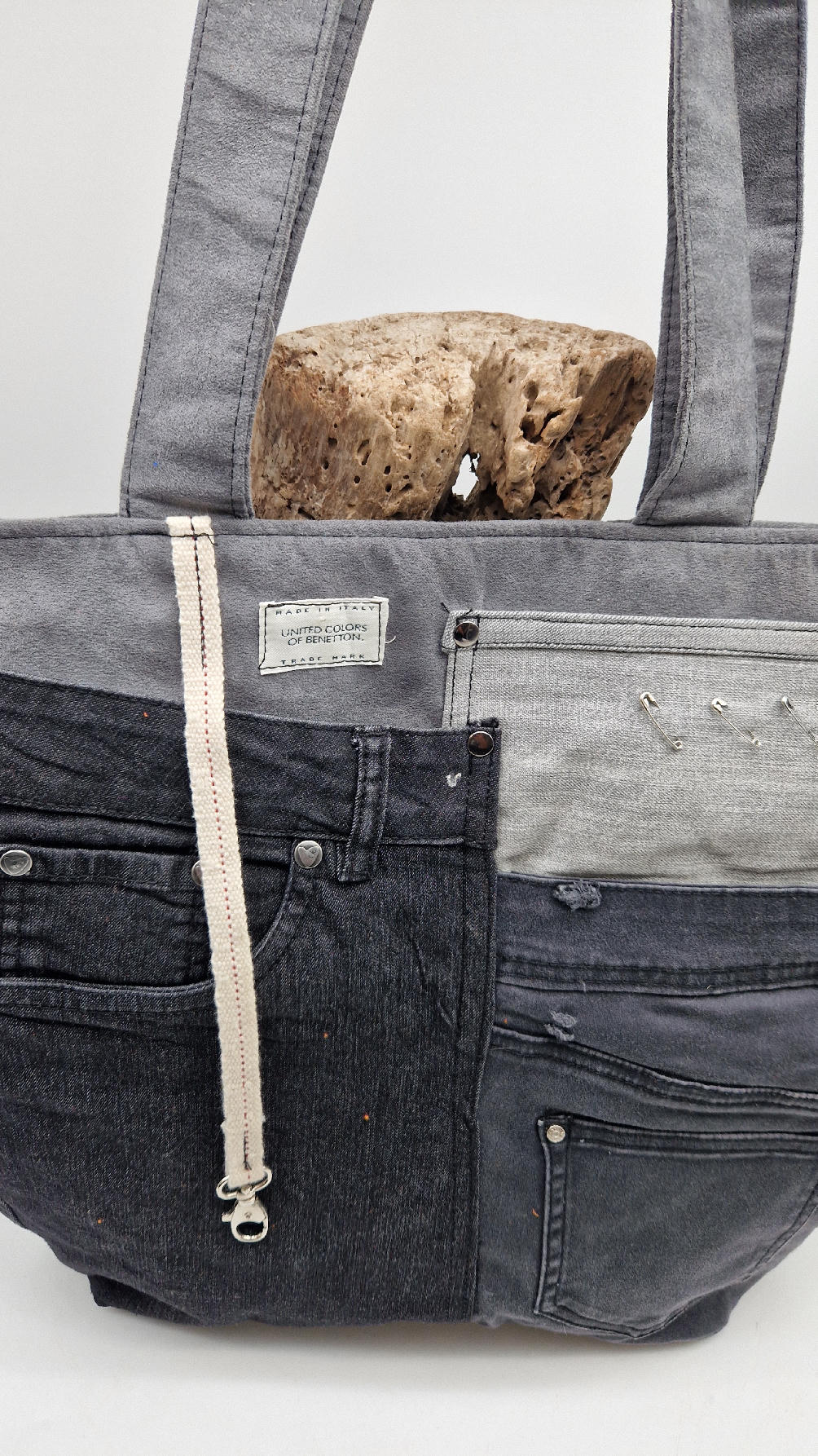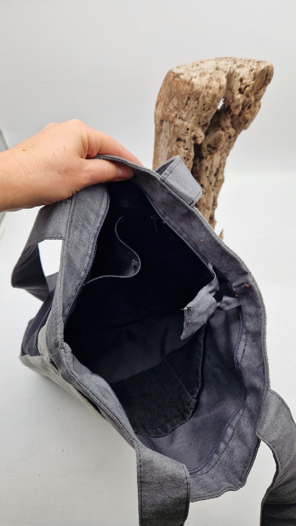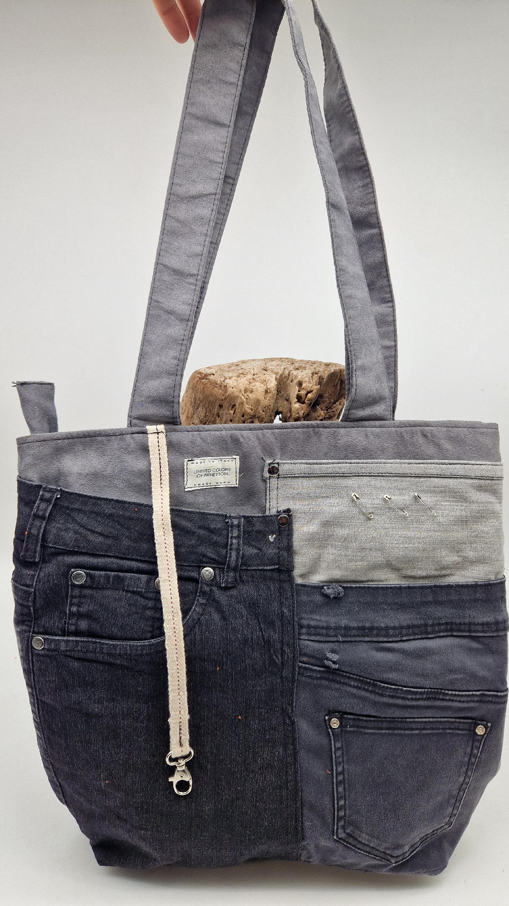 Piękna, duża, ręcznie uszyta , totalnie unikatowa torba z jeansu i alcantary, z mnóstwem kieszeni w środku i na zewnątrz zapinana na suwak, z dwoma uszami do zawieszenia na ramieniu.