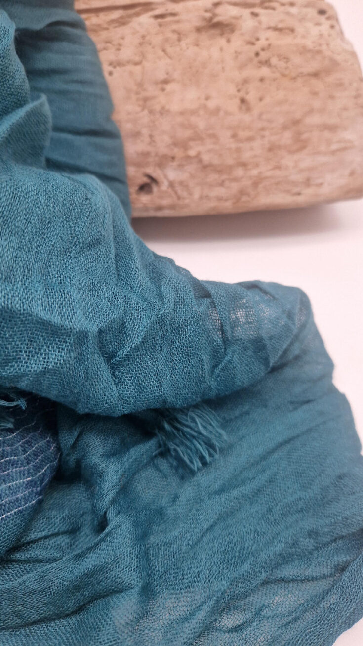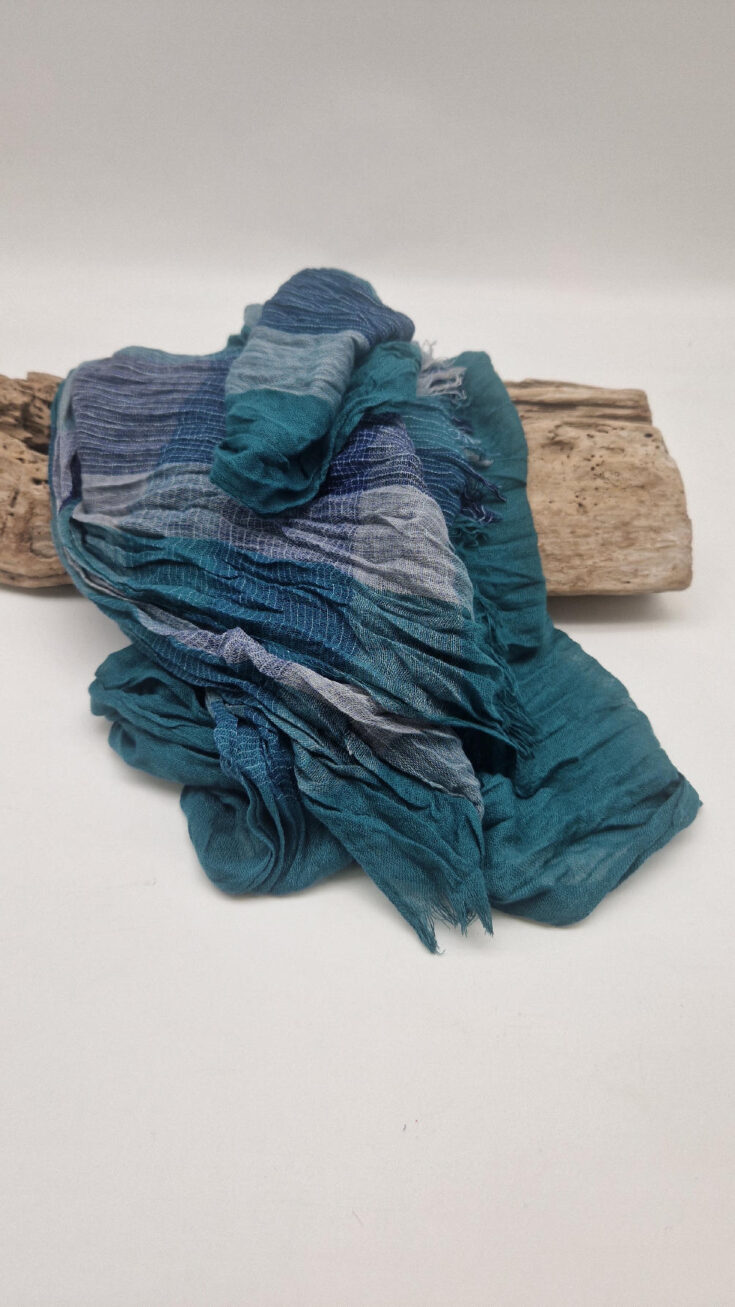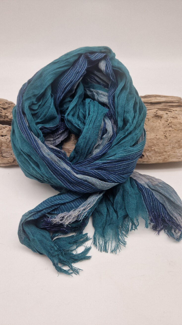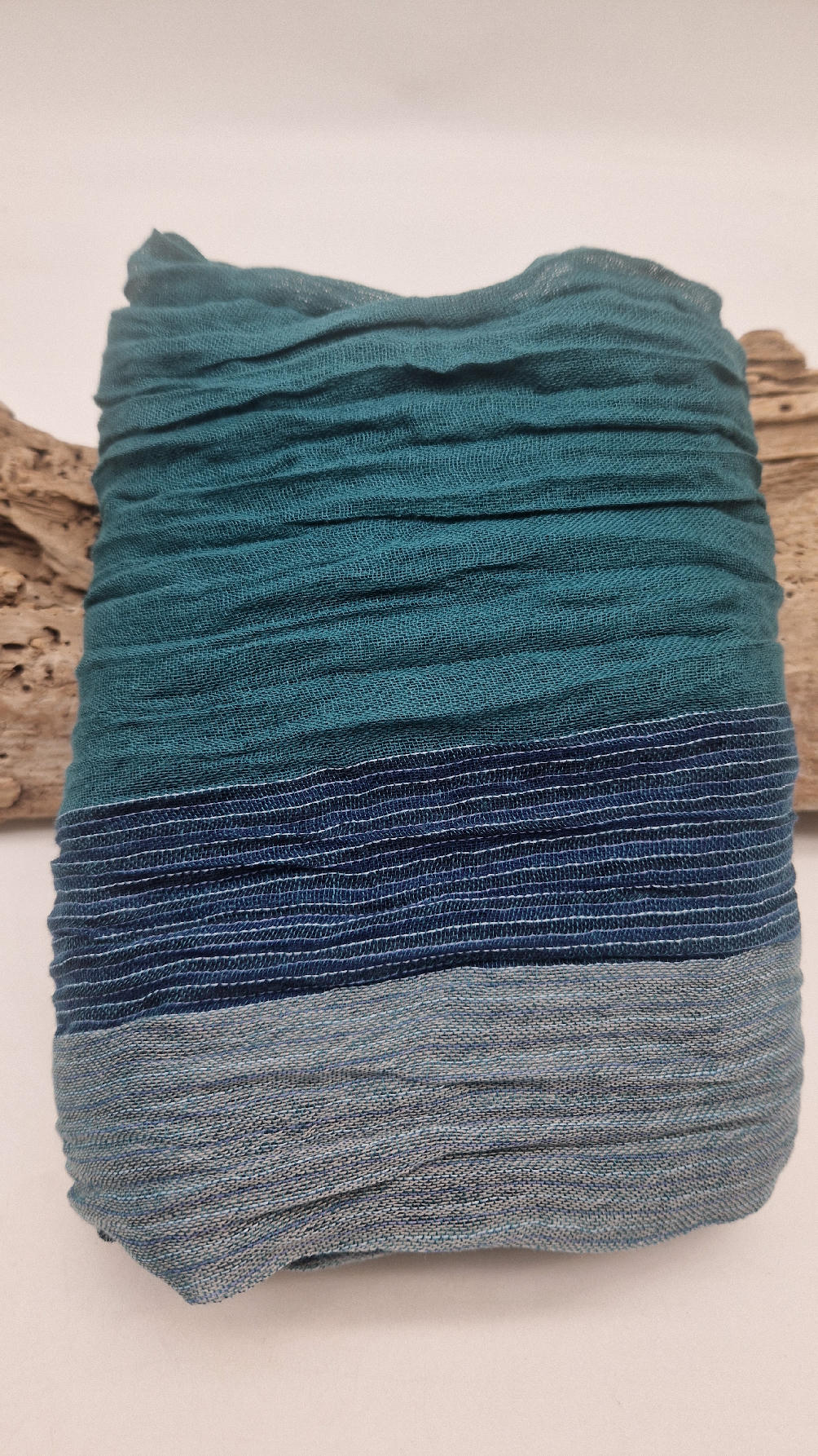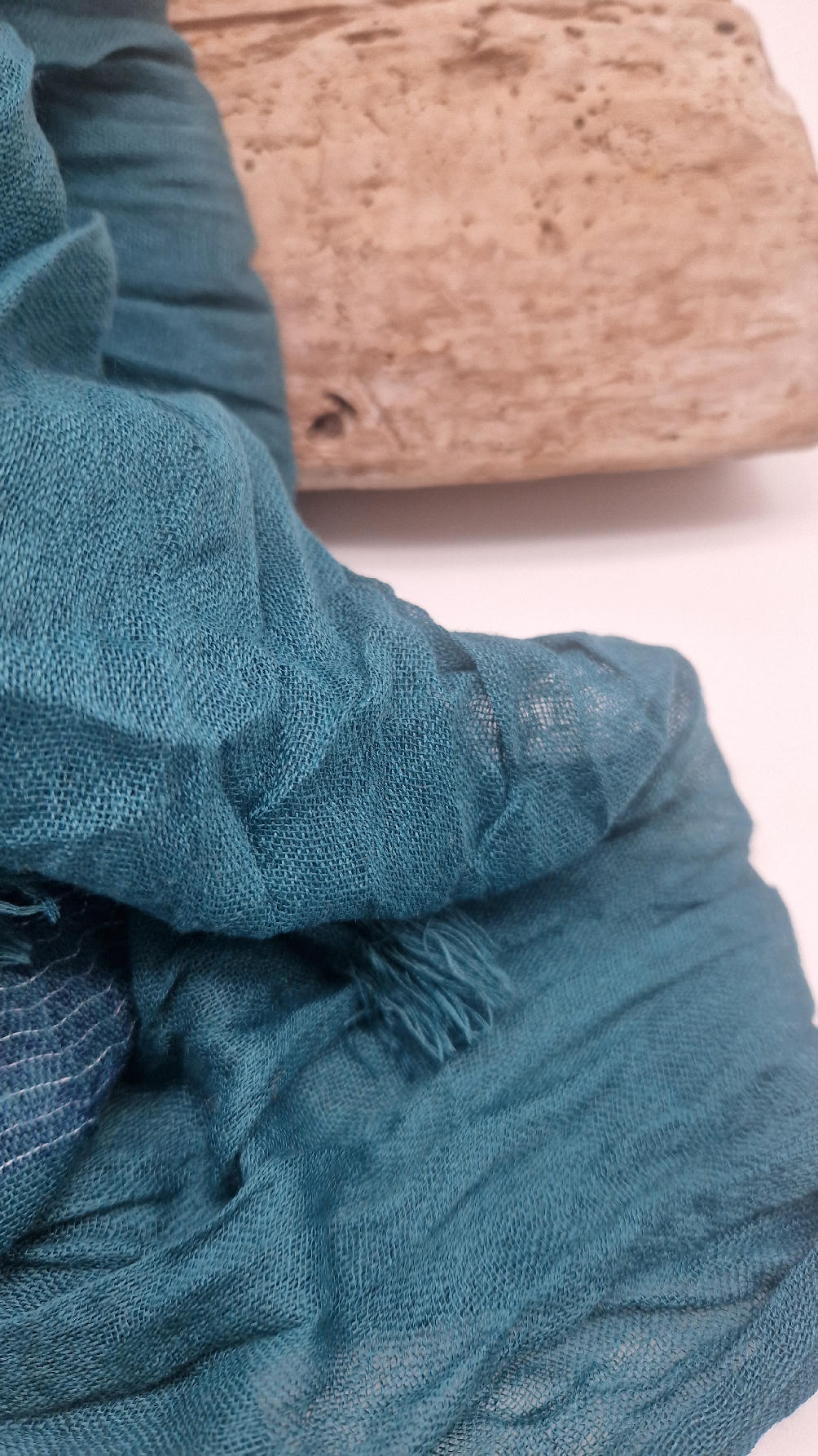 Duży, bardzo miękki, szmaragdowo-niebieski ,,pognieciony” szal paski . Szal na pewno świetnie otuli Twoją szyję, będzie również świetnym dodatkiem do sukienek, katan, czy Otulaków…Myślę, że będzie też świetny dla Twojej drugiej połówki, lub w prezencie..