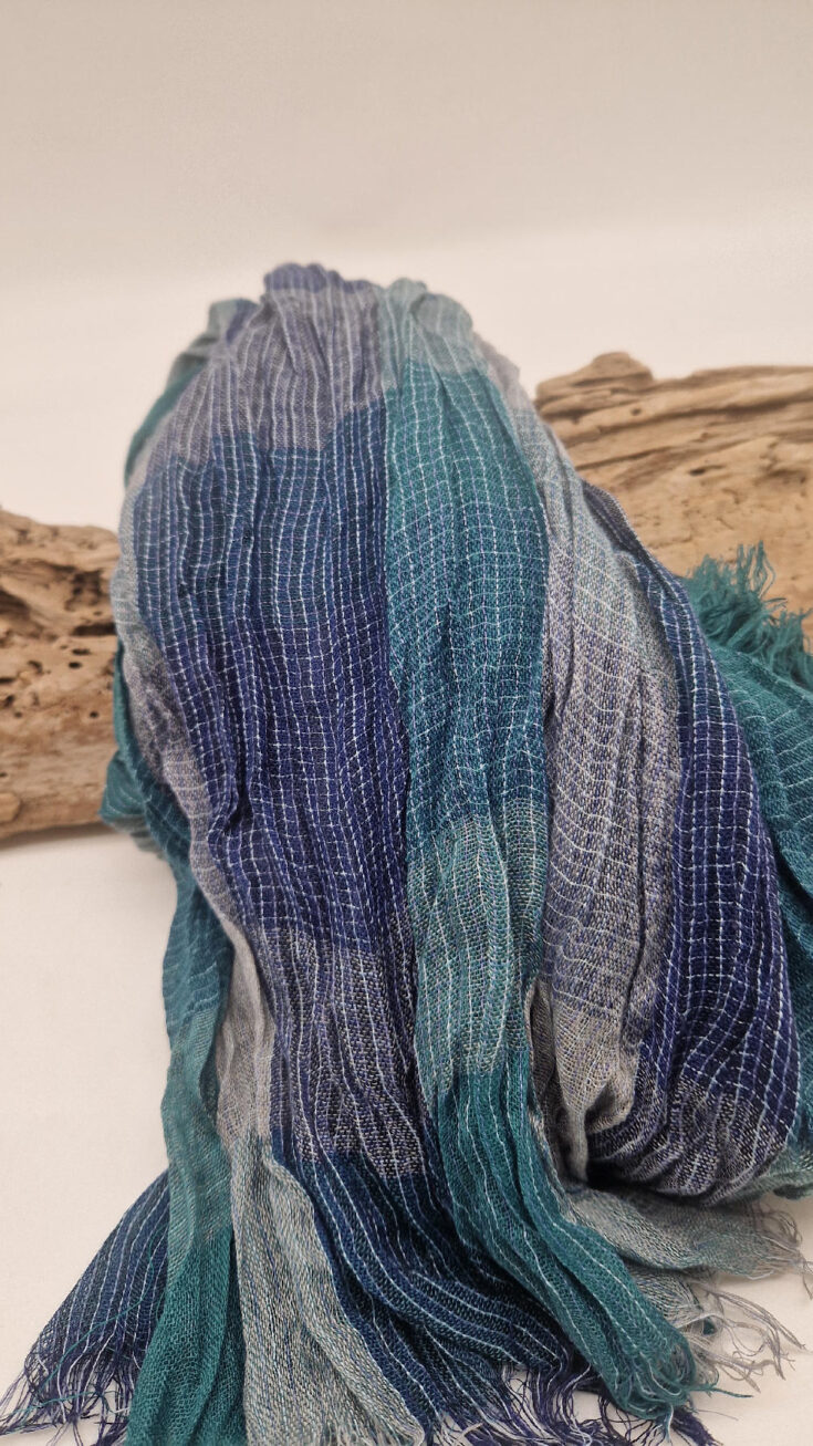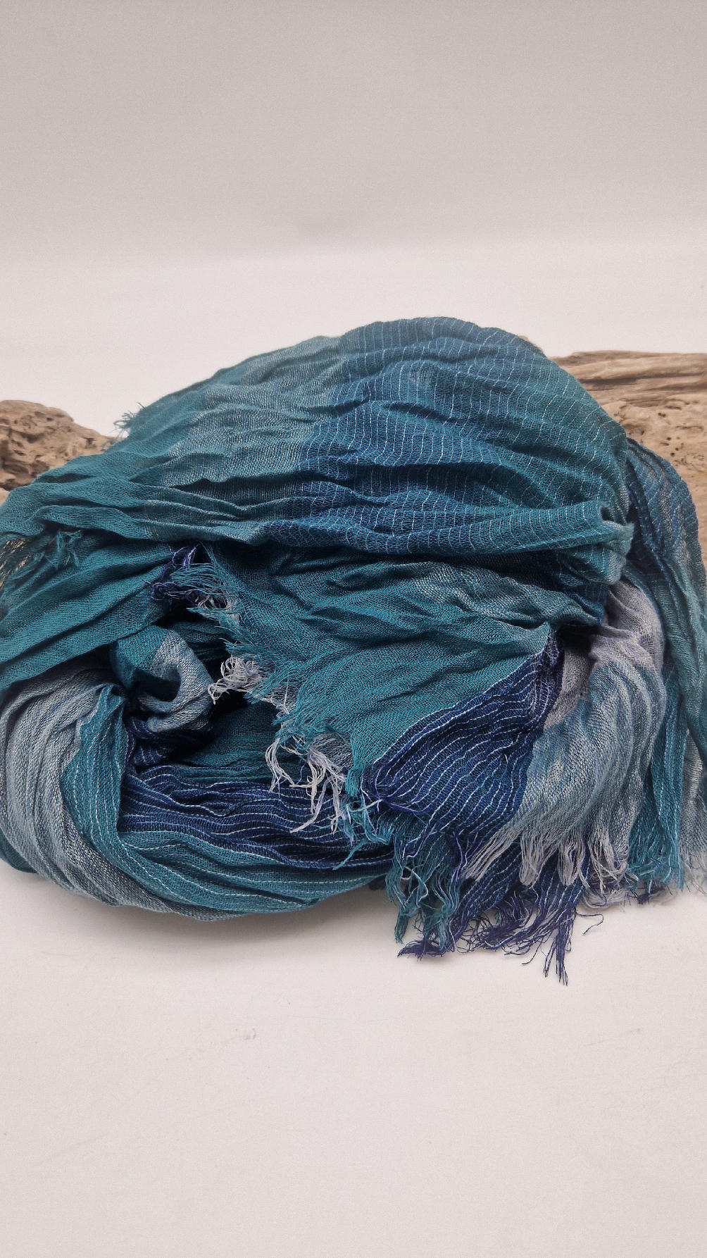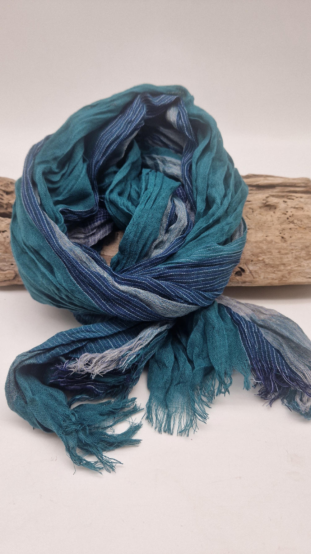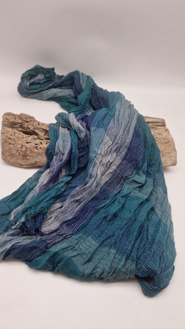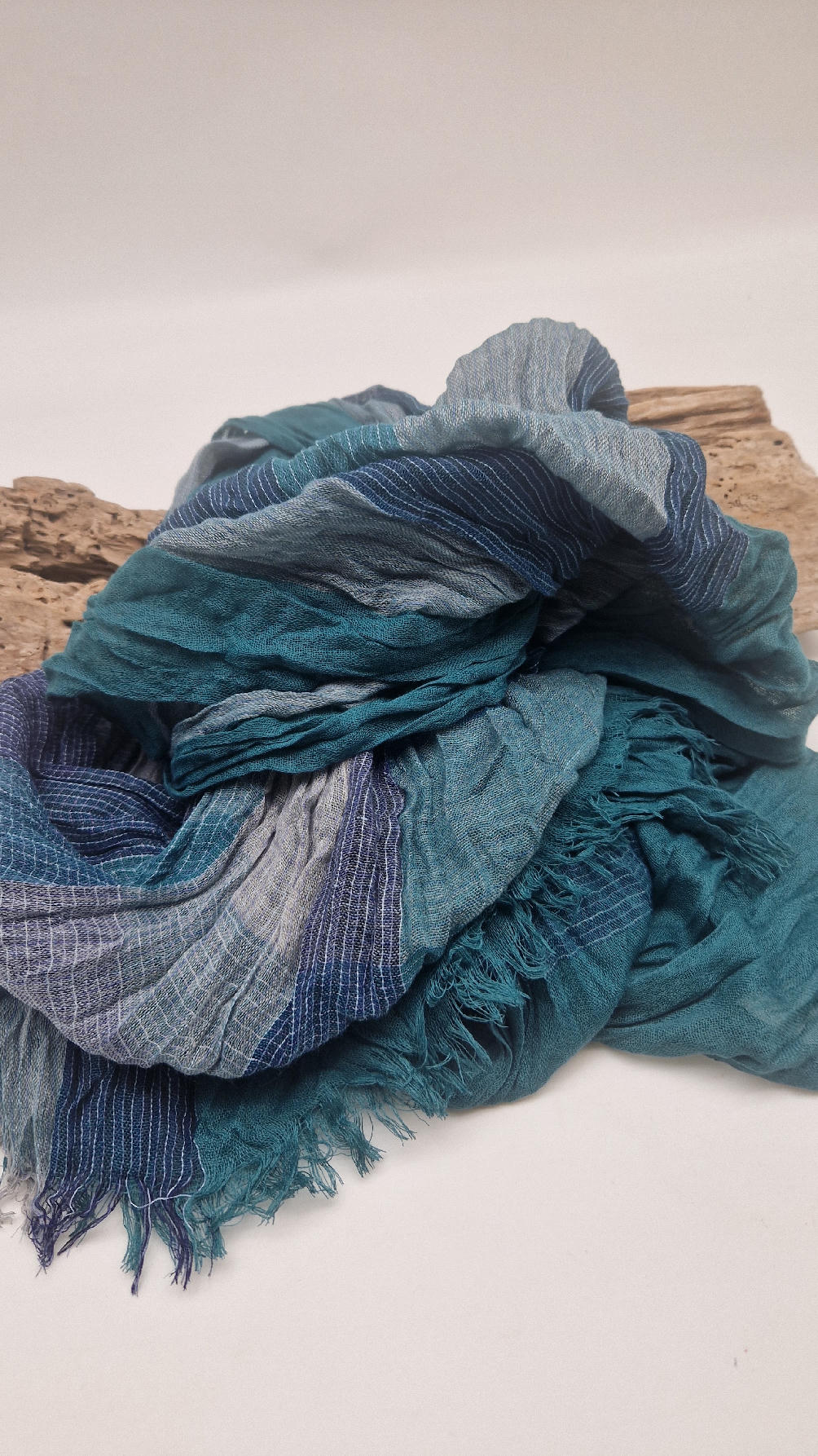 Duży, bardzo miękki, szmaragdowo-niebieski ,,pognieciony” szal paski . Szal na pewno świetnie otuli Twoją szyję, będzie również świetnym dodatkiem do sukienek, katan, czy Otulaków…Myślę, że będzie też świetny dla Twojej drugiej połówki, lub w prezencie..