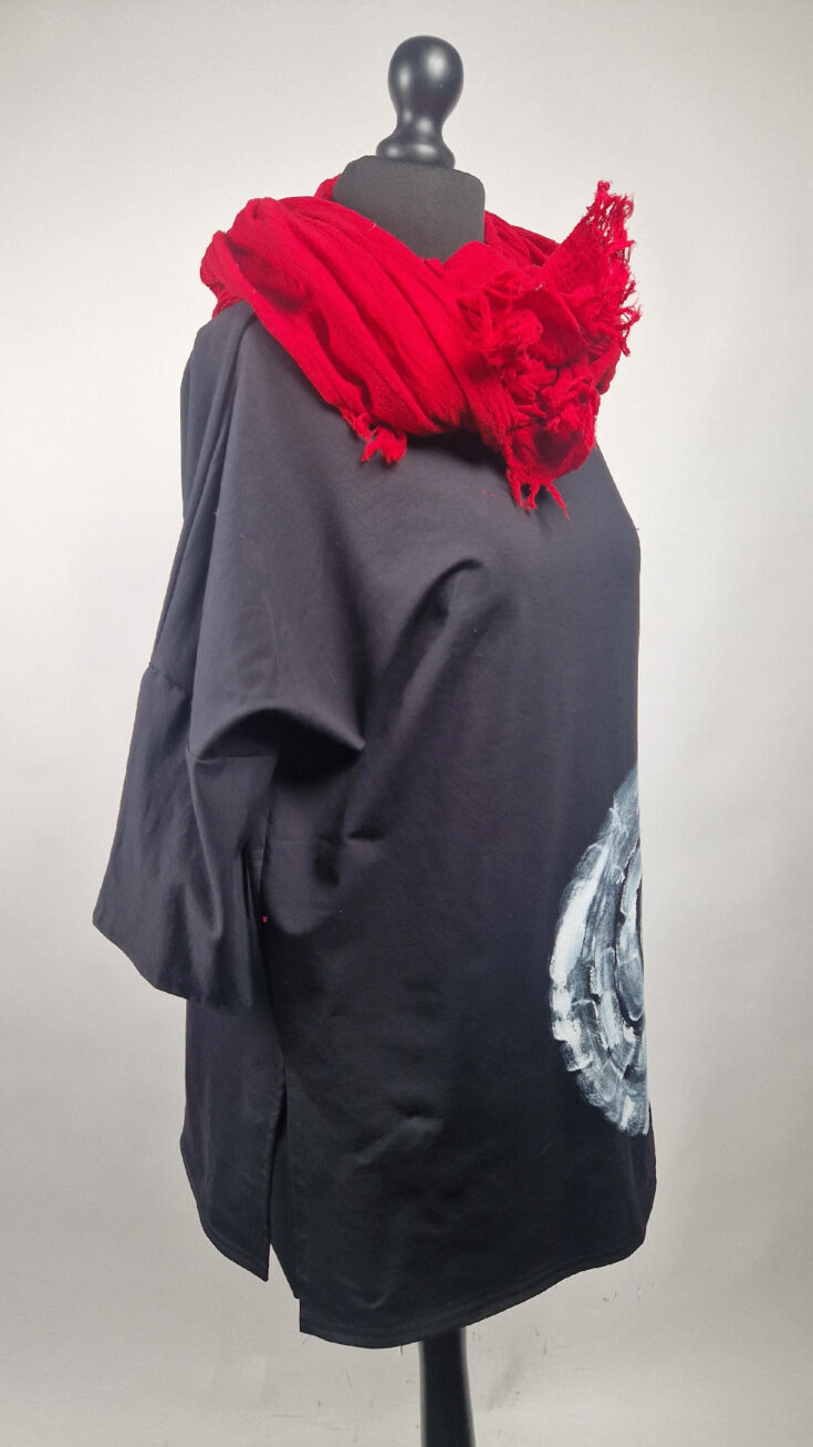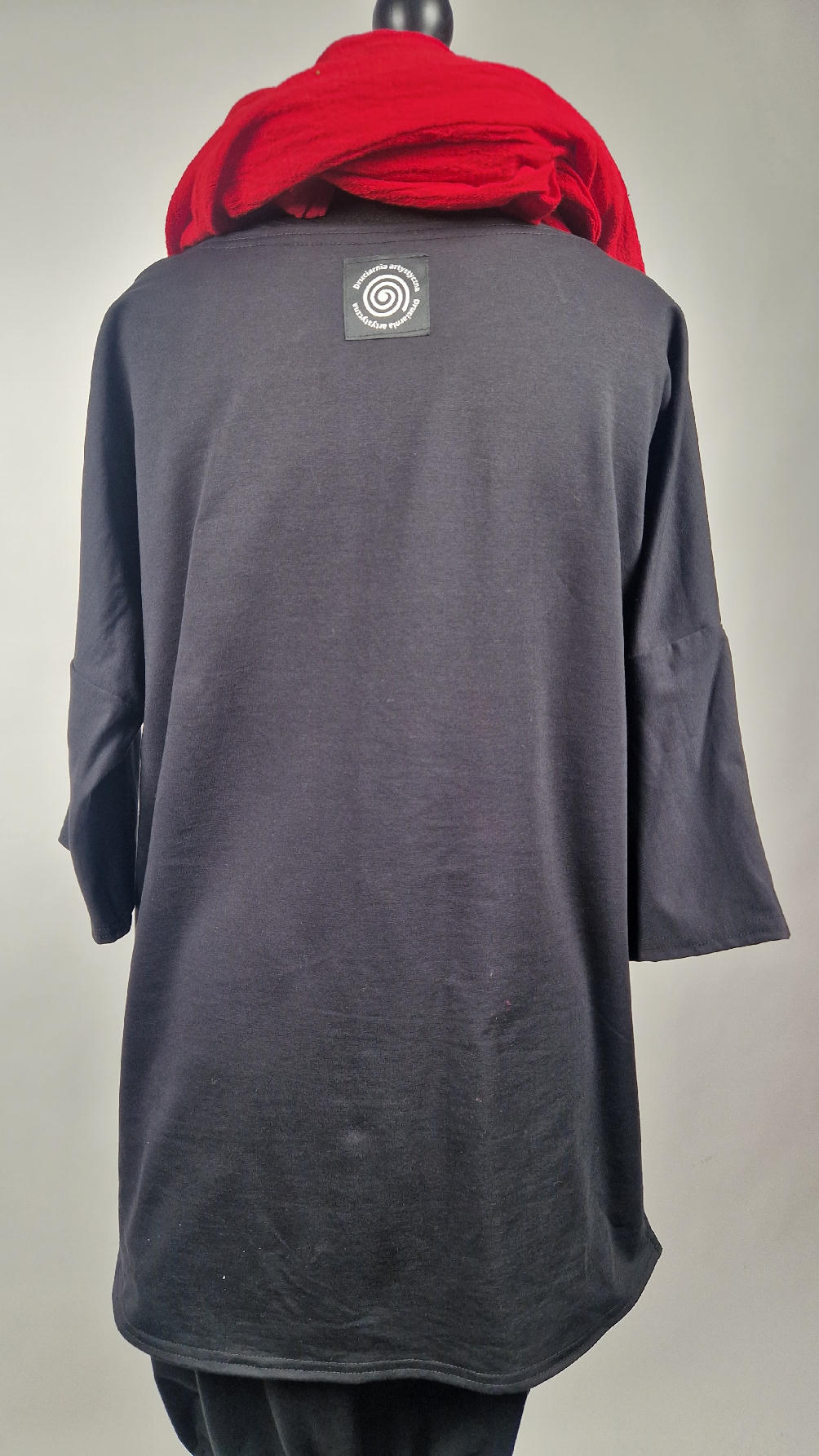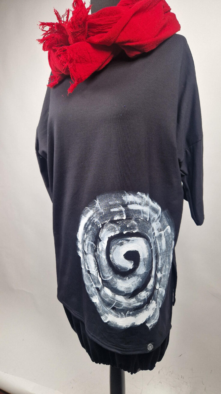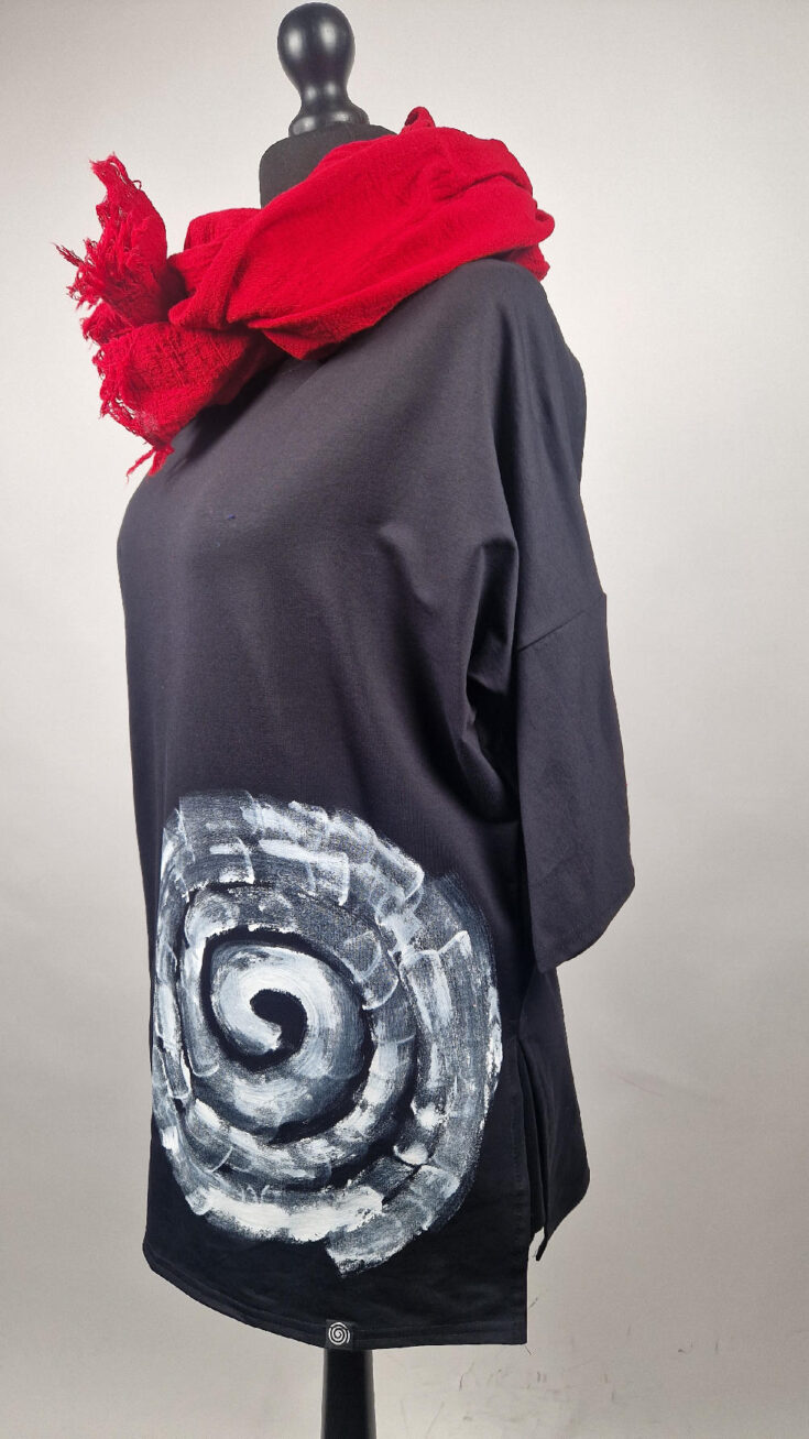 taka ,,luzacka”, luźna w biuście tunika – bluzka typu NIETOPERZ, ale taki niewielki….bluzka uszyta z czarnej, wysokiej jakości bawełny z pętelką, prosta, bez kieszeni – tak specjalnie, żeby nic nie odstawało…rękaw 3/4- reglan. Tunika jest ręcznie malowana farbami, które się nie spierają , z niewielkim dekoltem ,,lekka łódka”