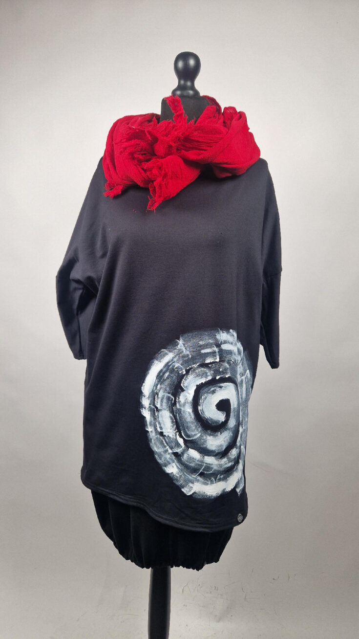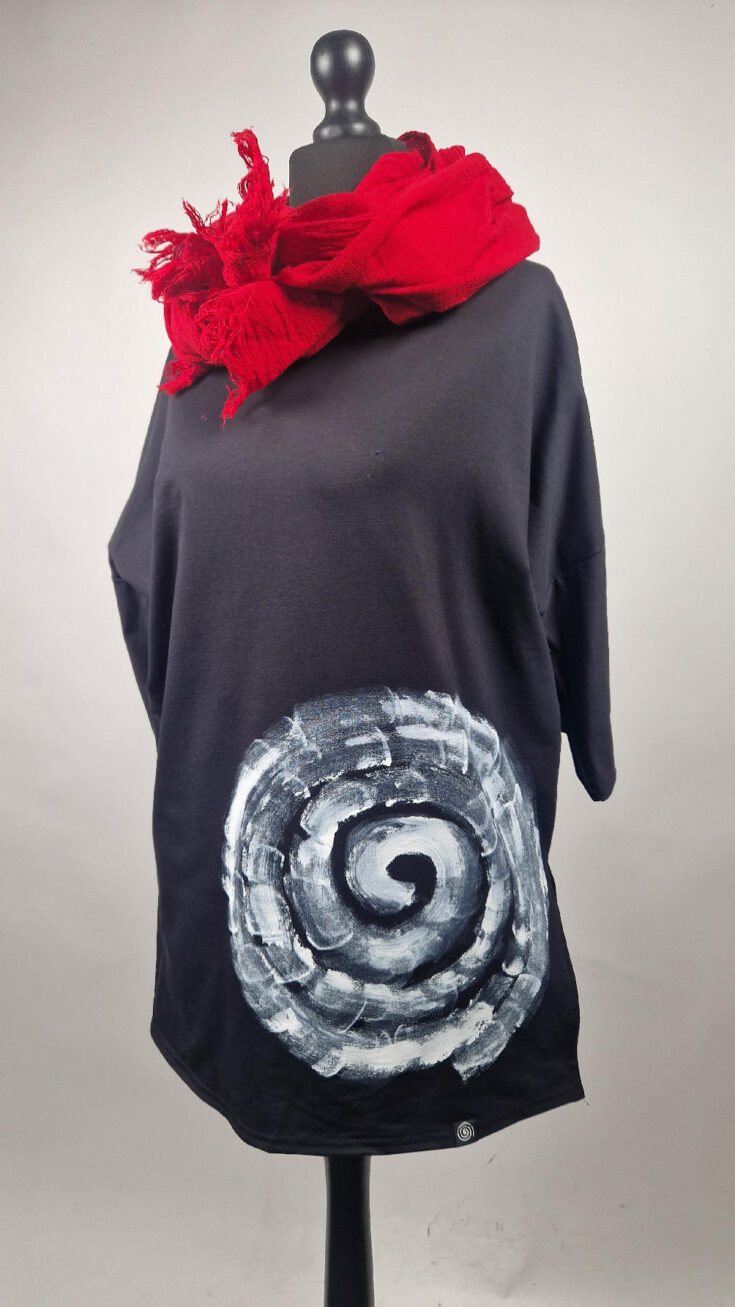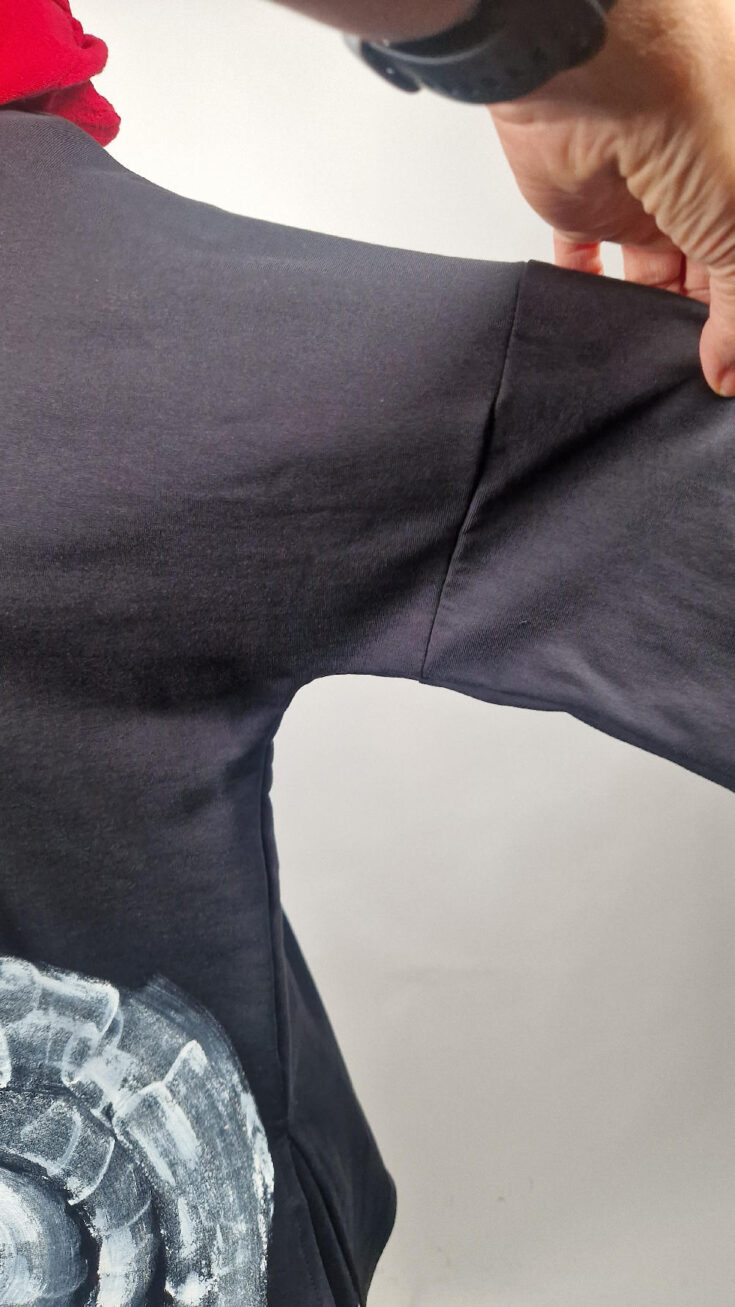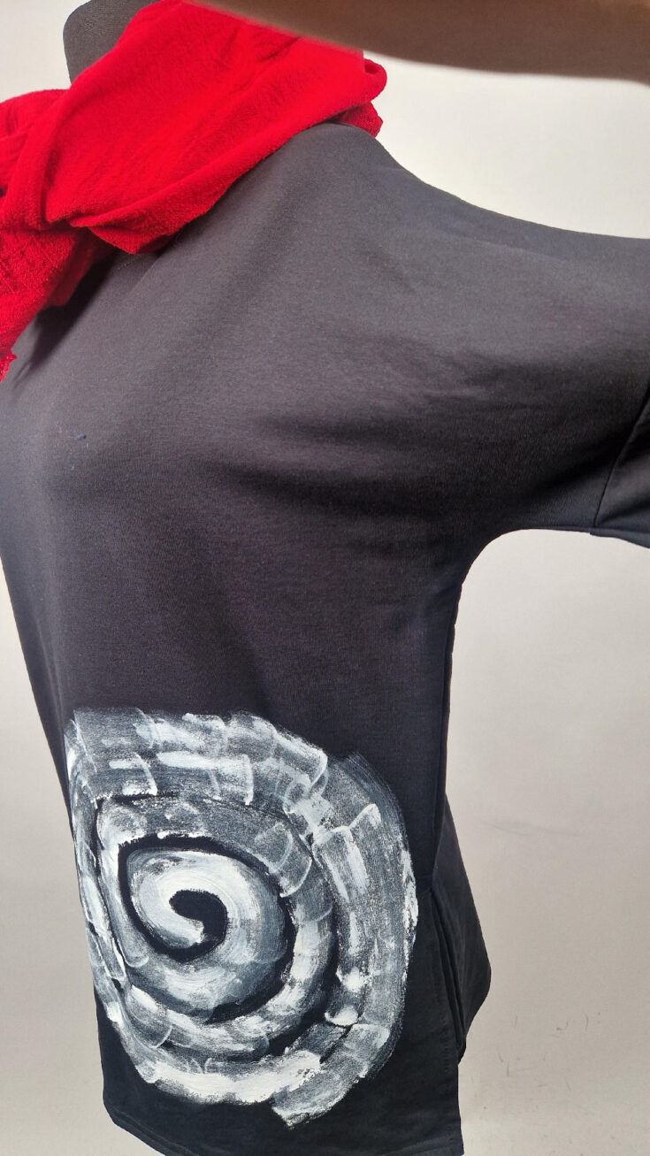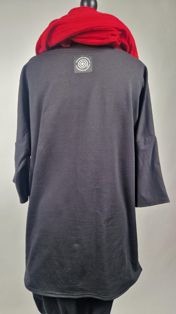 taka ,,luzacka”, luźna w biuście tunika – bluzka typu NIETOPERZ, ale taki niewielki….bluzka uszyta z czarnej, wysokiej jakości bawełny z pętelką, prosta, bez kieszeni – tak specjalnie, żeby nic nie odstawało…rękaw 3/4- reglan. Tunika jest ręcznie malowana farbami, które się nie spierają , z niewielkim dekoltem ,,lekka łódka”