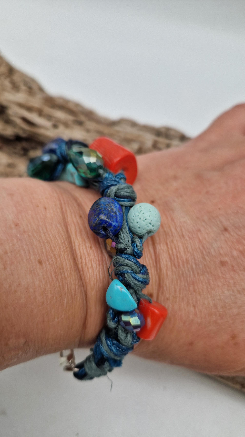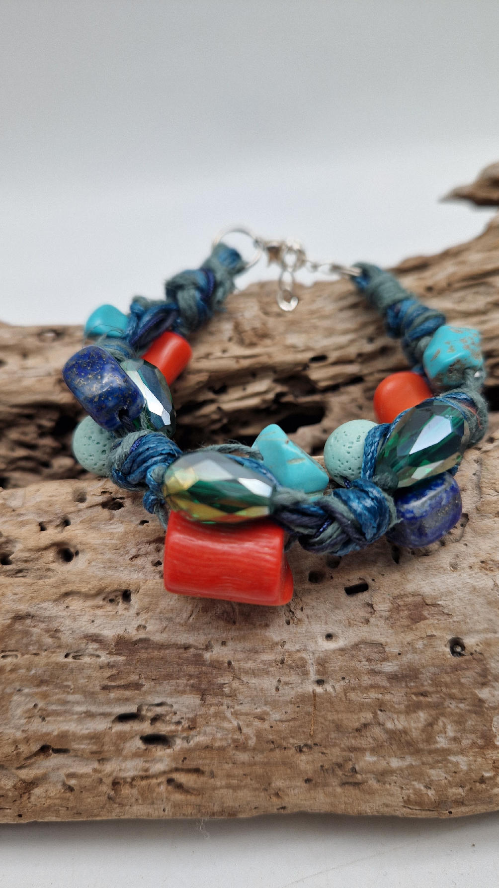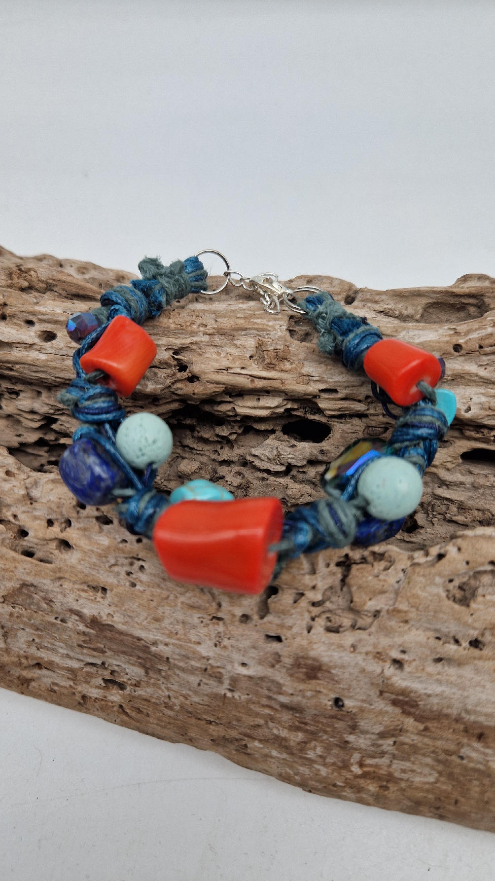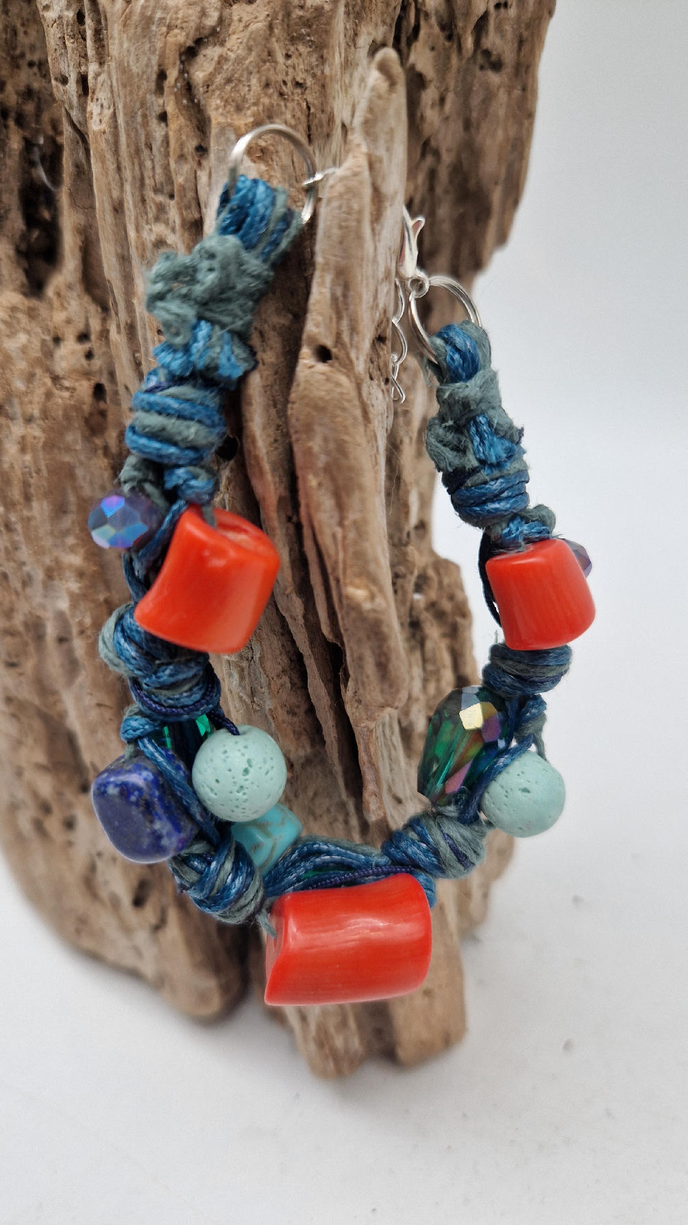 Śliczna bransoletka z turkusów pomarańczowych korali i szklanych koralików w turkusowym kolorze na niebieskim, bawełnianym sznurku.